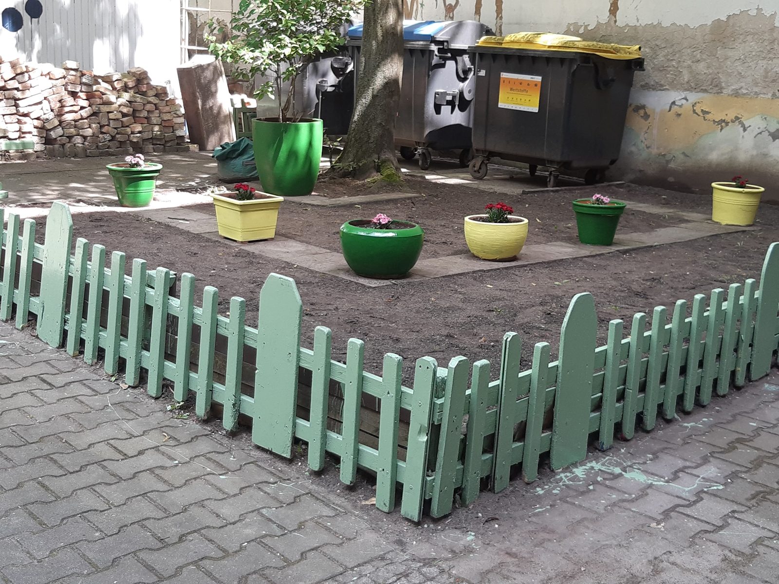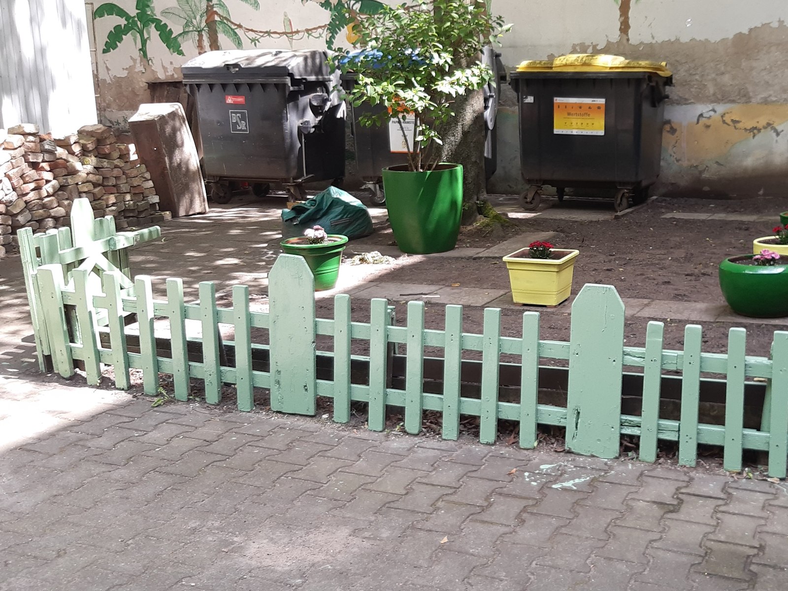 Eine große Herausforderung war der unansehnliche eingezäunte Müllplatz. Der Zaun wurde neu gestrichen, der Platz aufgeräumt und farbig gestaltet. Jetzt ist er nicht wiederzuerkennen.