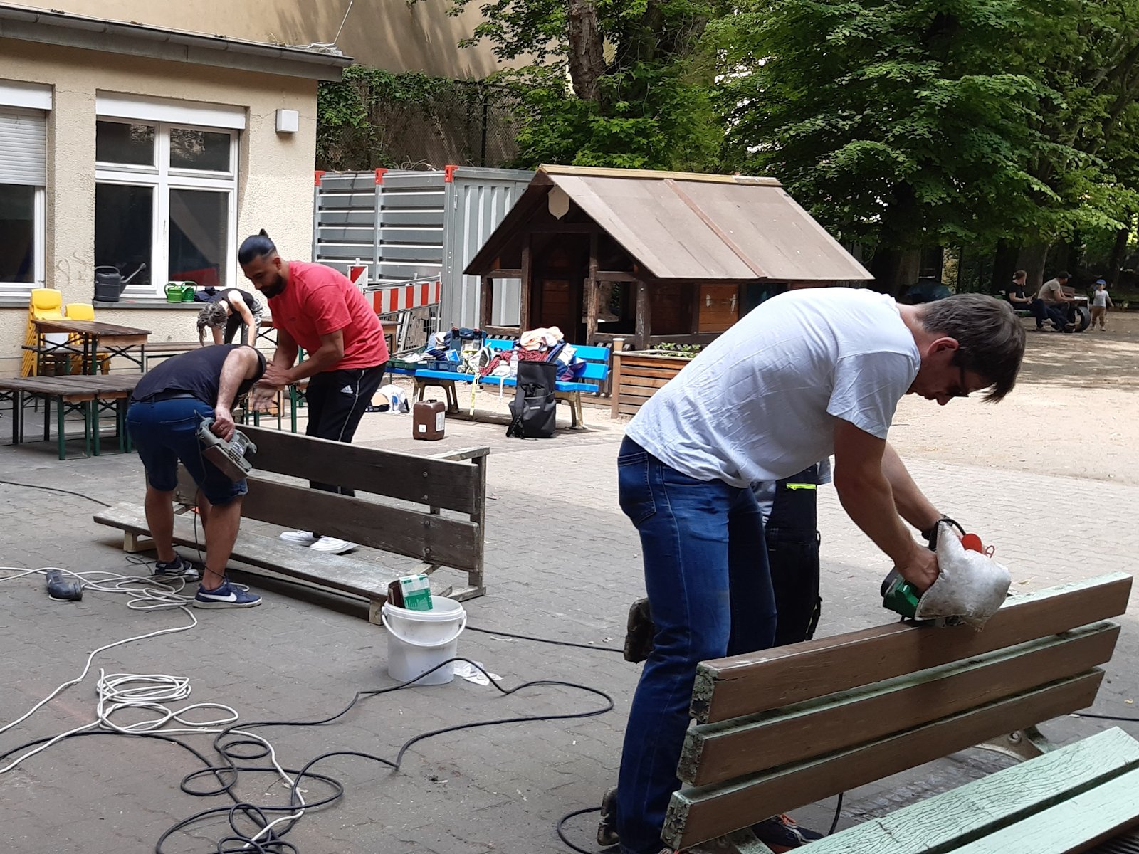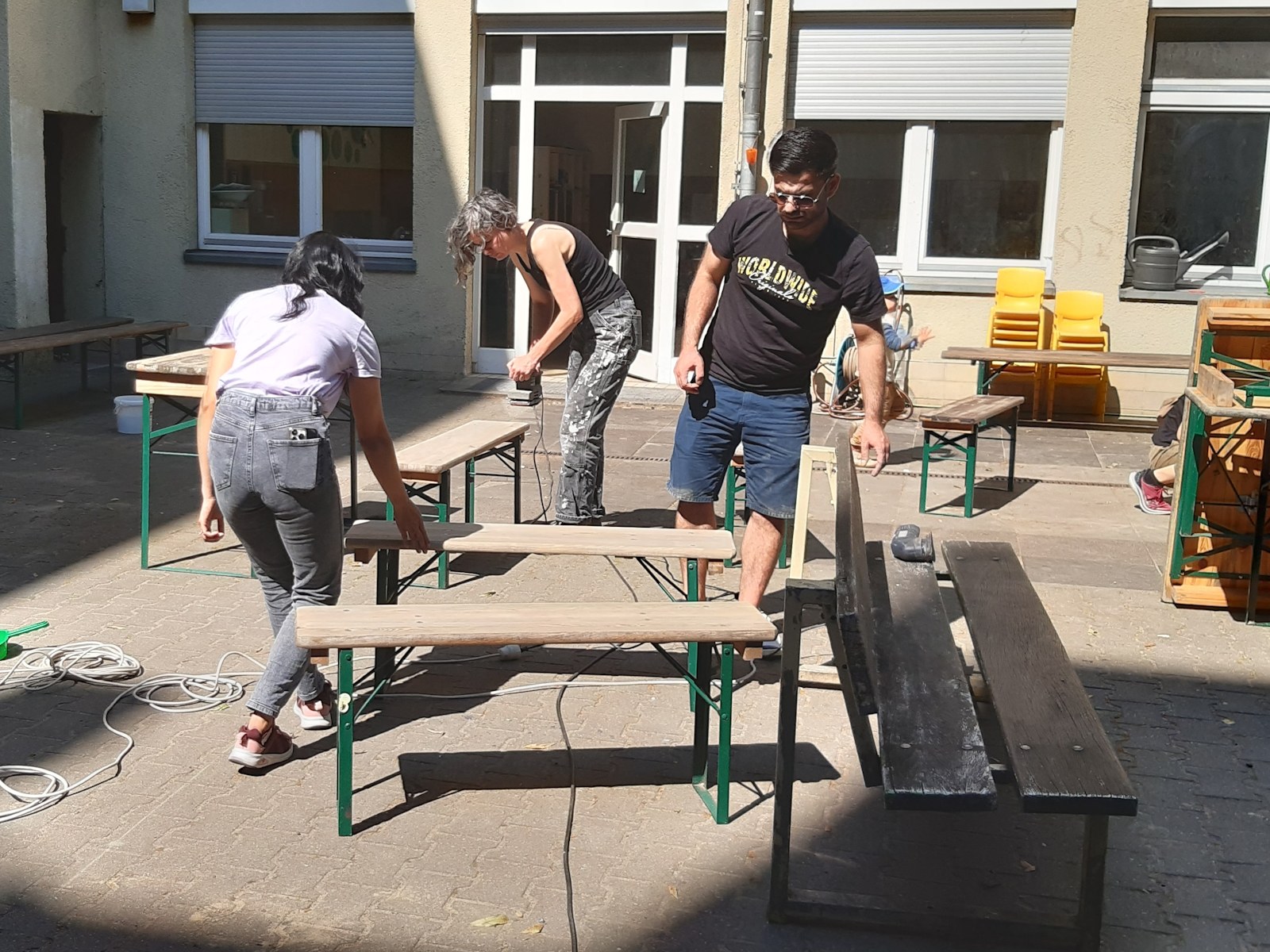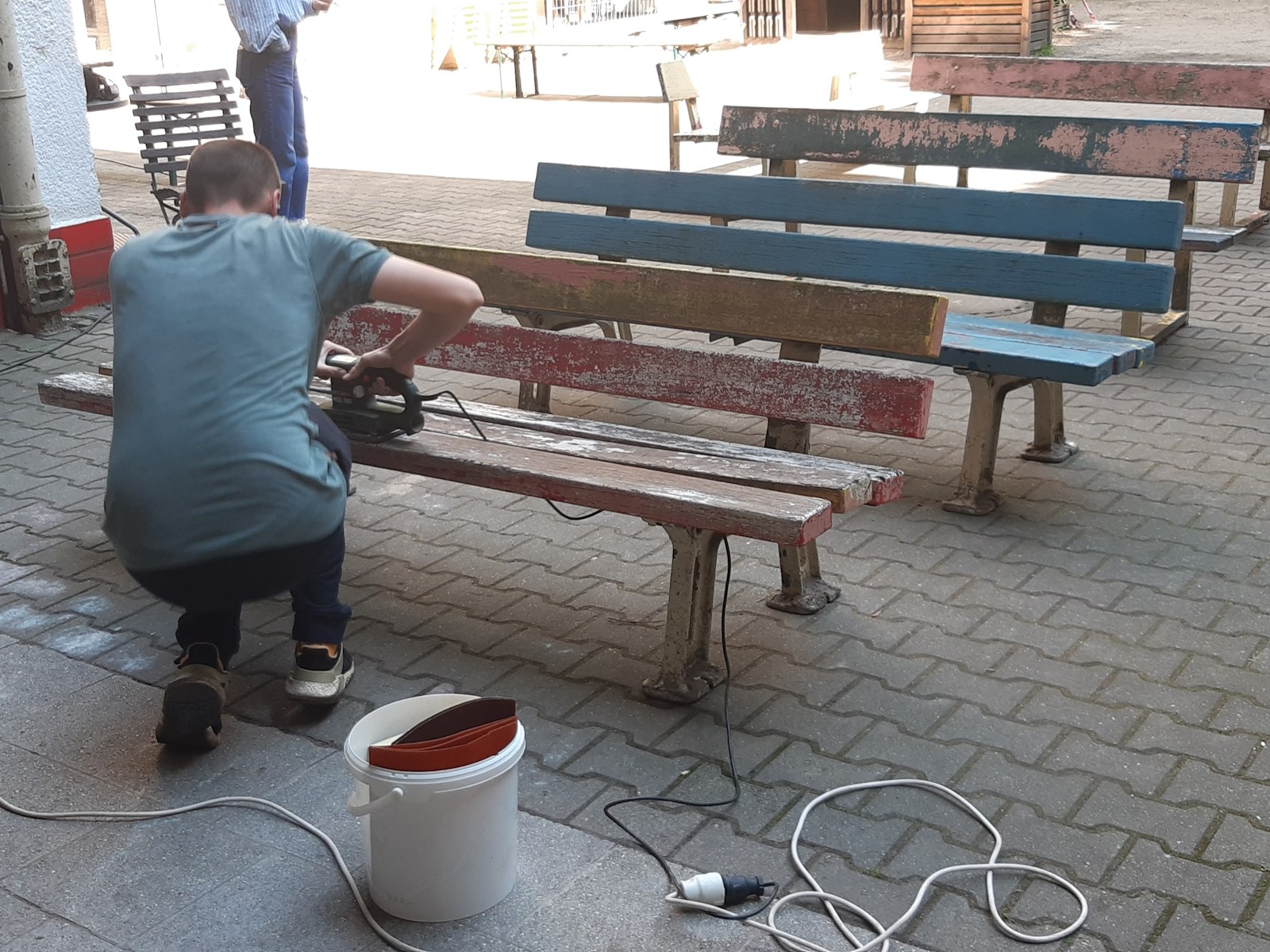 Alle Bänke aus dem Garten wurden zusammengetragen, die alte Farbe abgeschliffen und neu gestrichen. Auch die Bierbänke und andere Gartenmöbel wurden abgeschliffen und frisch lackiert.