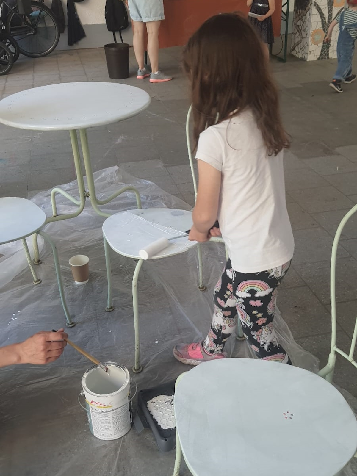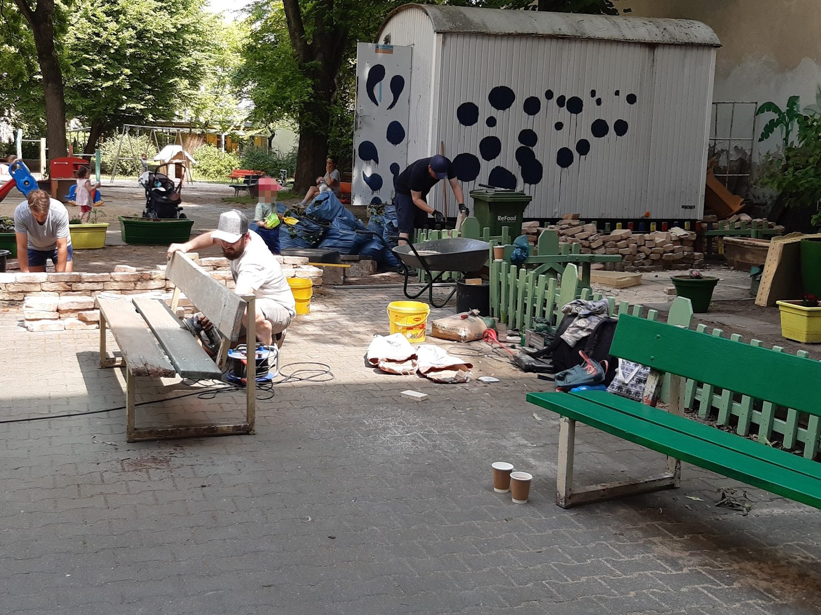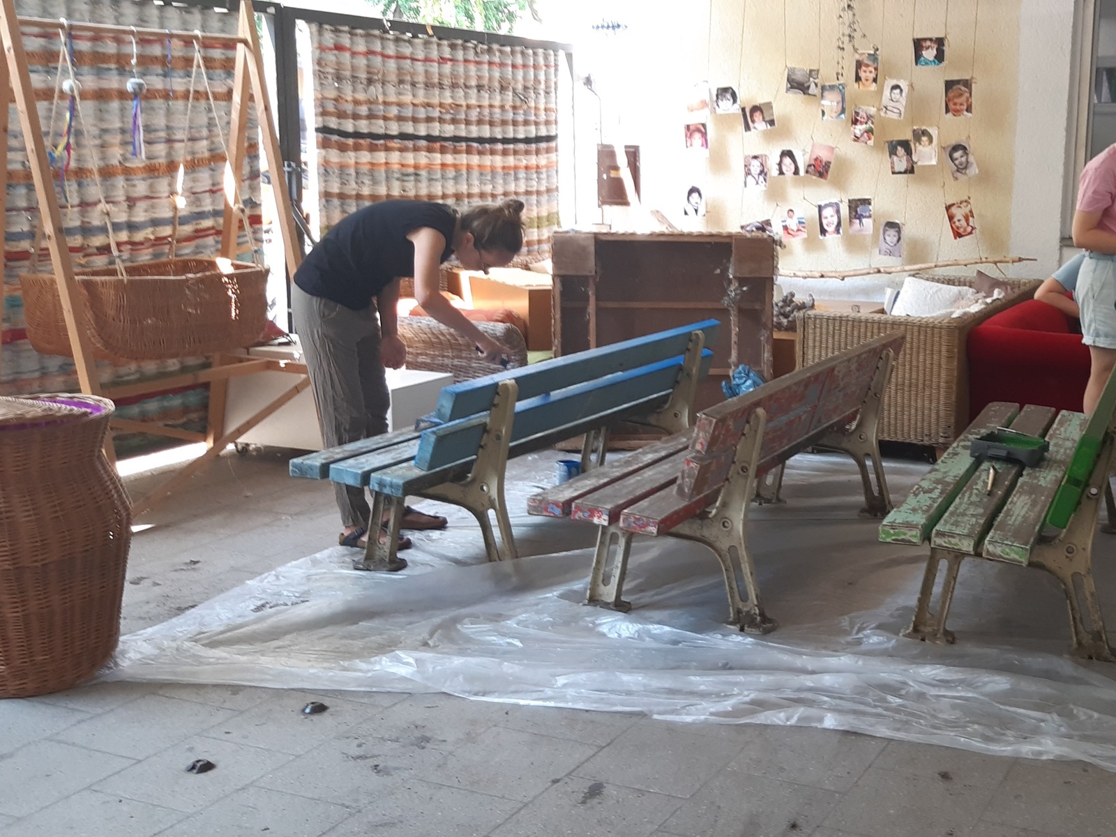 Alle Bänke aus dem Garten wurden zusammengetragen, die alte Farbe abgeschliffen und neu gestrichen. Auch die Bierbänke und andere Gartenmöbel wurden abgeschliffen und frisch lackiert.