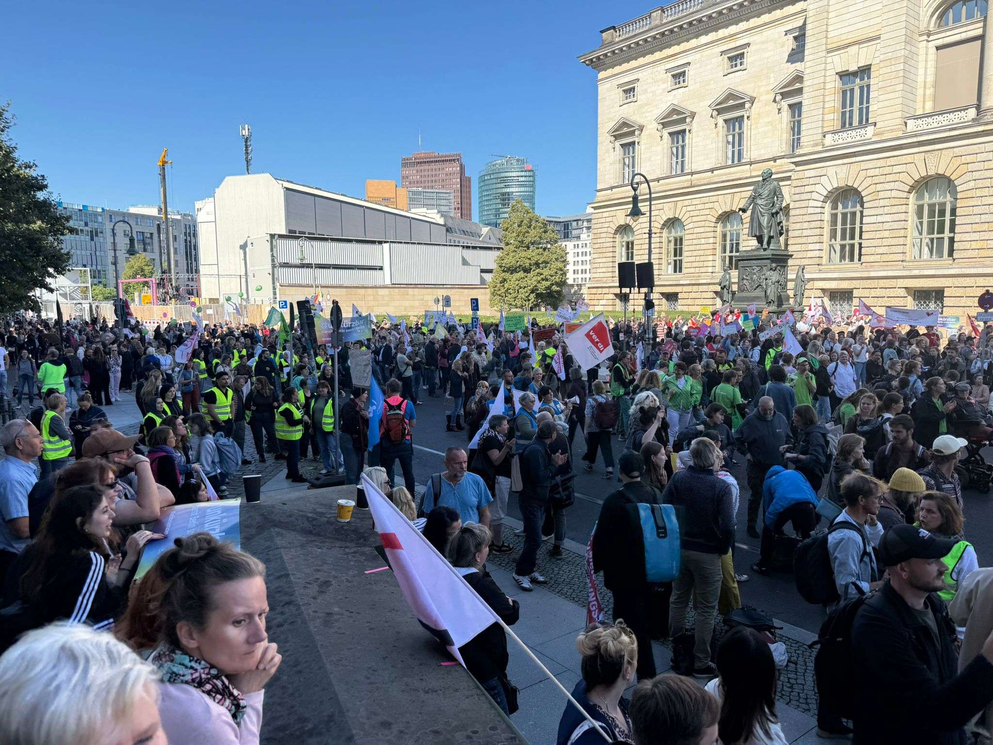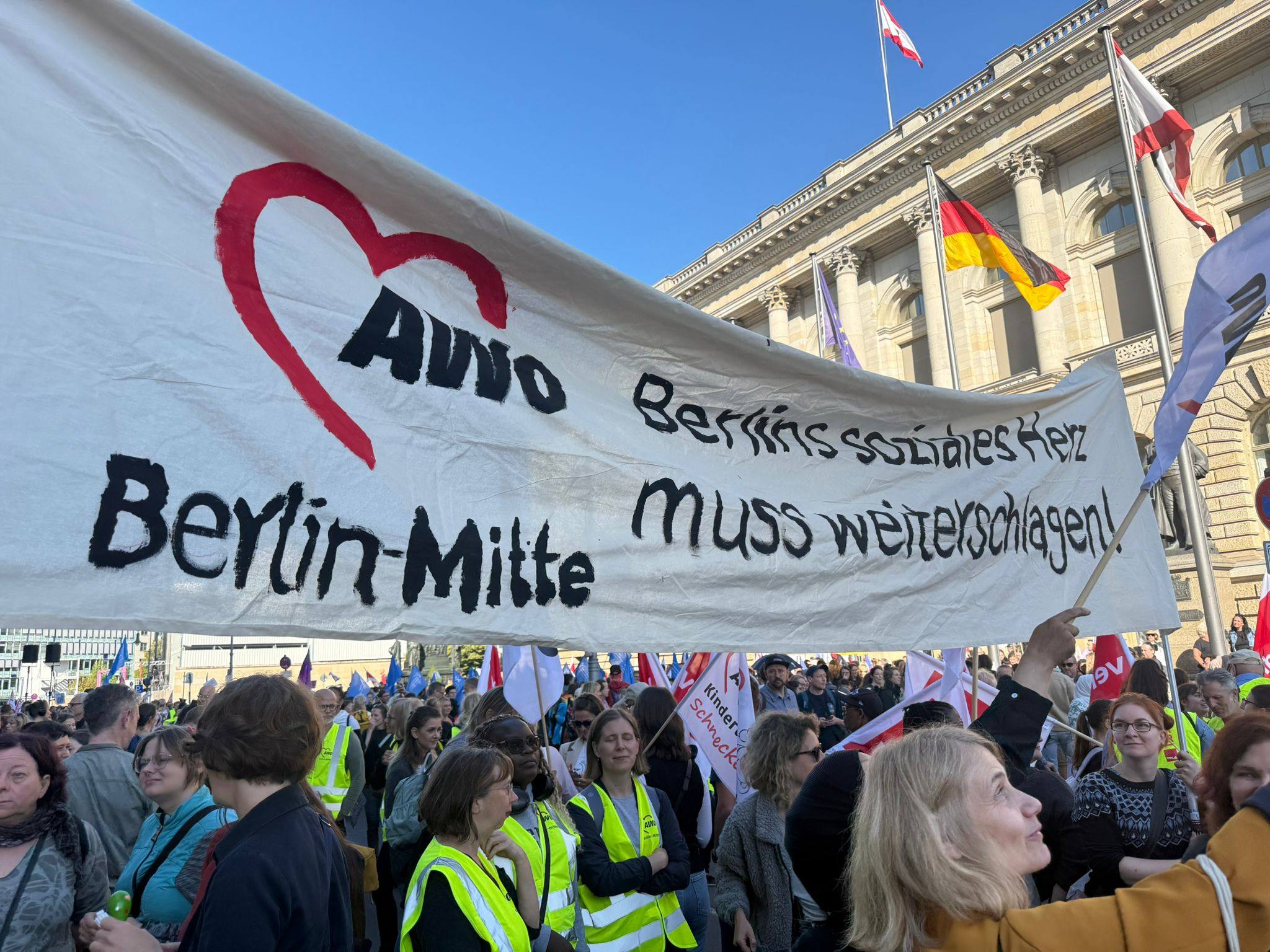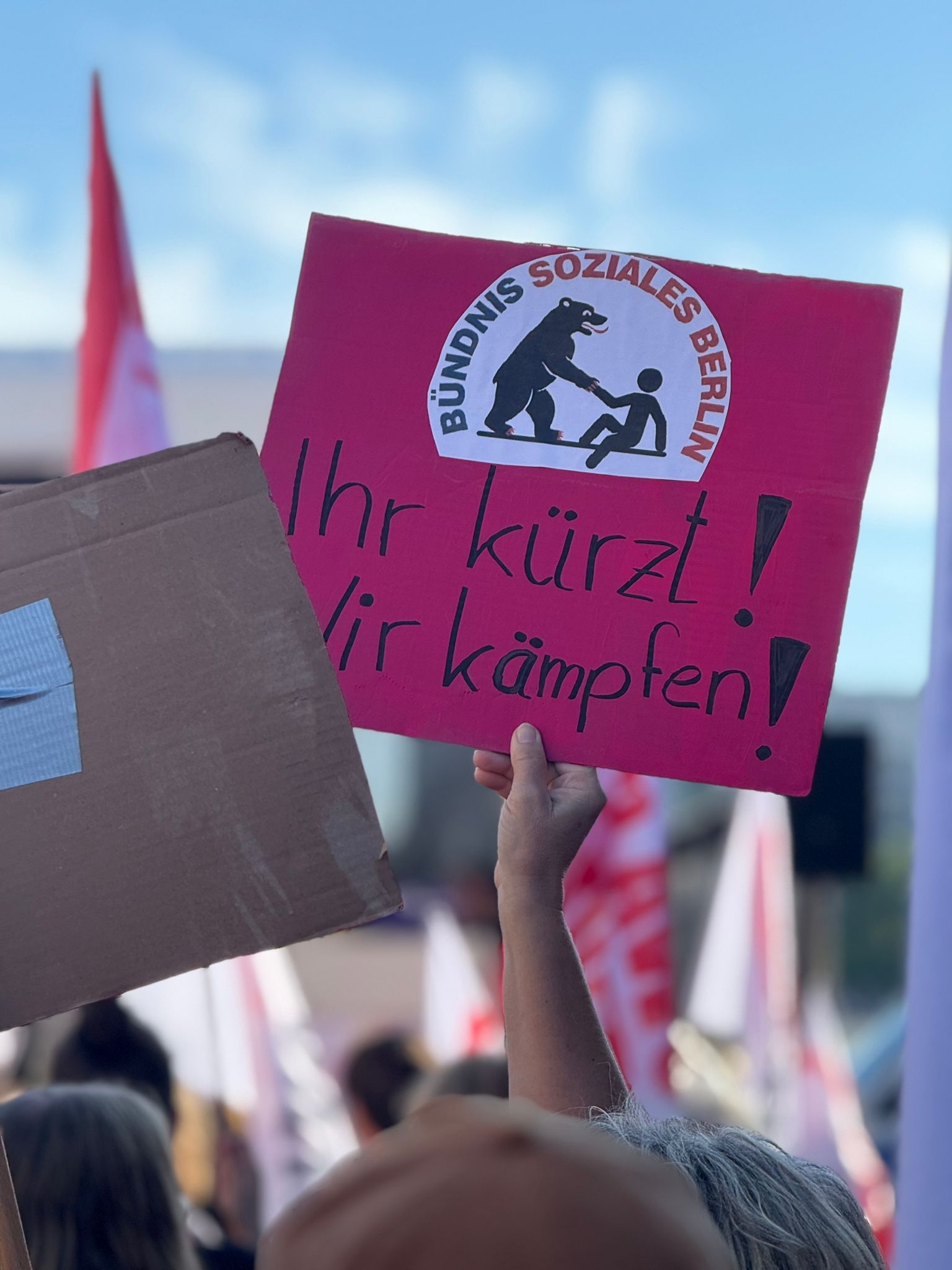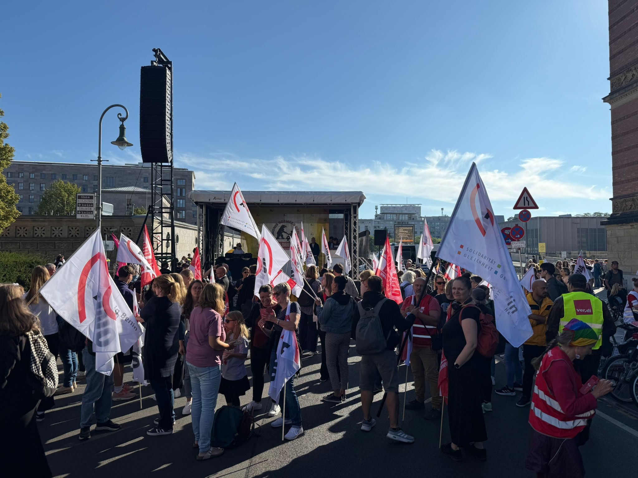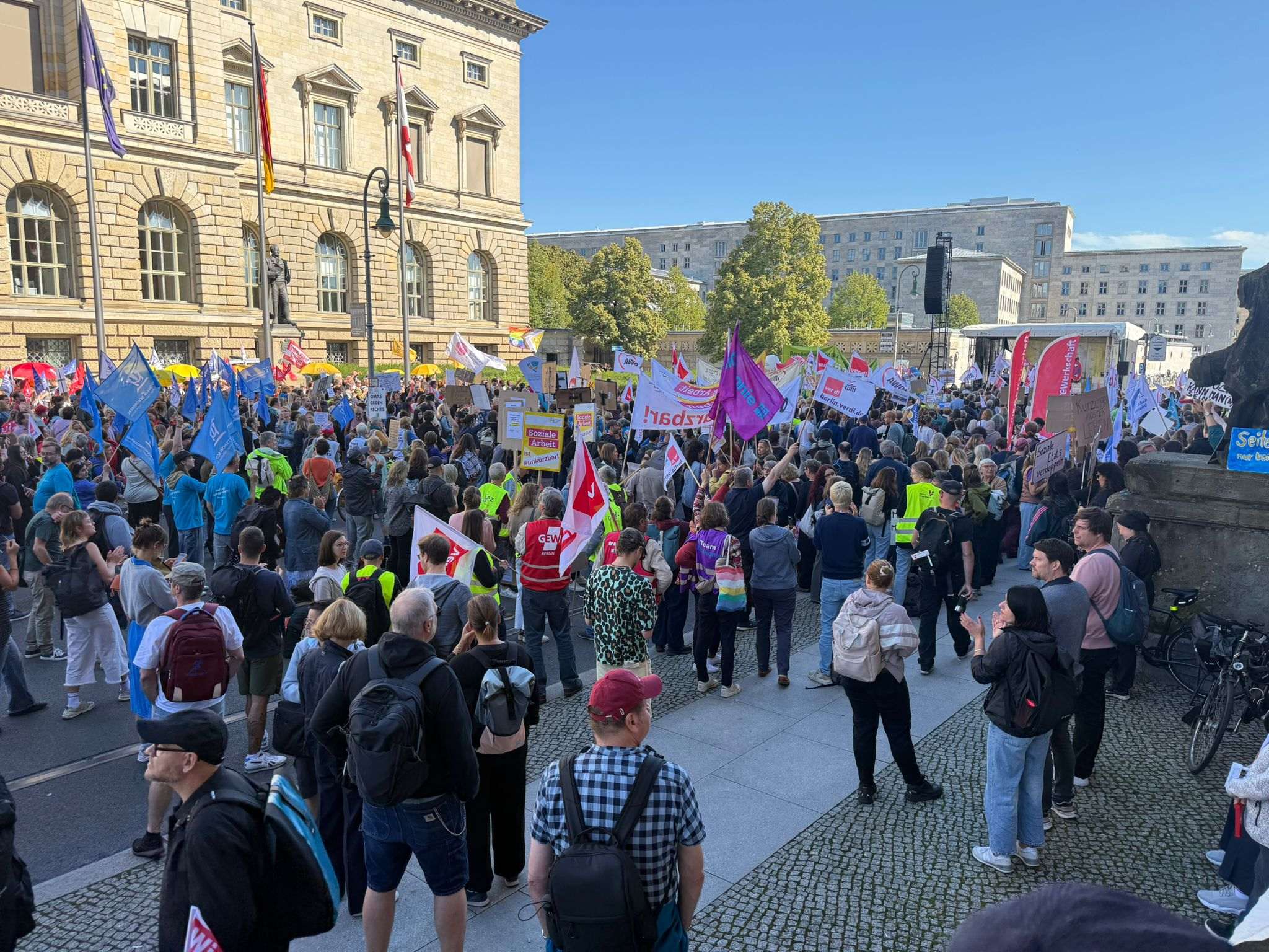 Am 11. September 2025 fand ab 10:00 Uhr unter dem Motto „Berlin darf nicht kaputtgespart werden – #GemeinsamFürEinSozialesBerlin“ eine Großkundgebung des Bündnisses für ein soziales Berlin statt. Mehr als 4000 tausend Demonstrierende setzten ein machtvolles Zeichen gegen die Kürzungspläne des Senats.