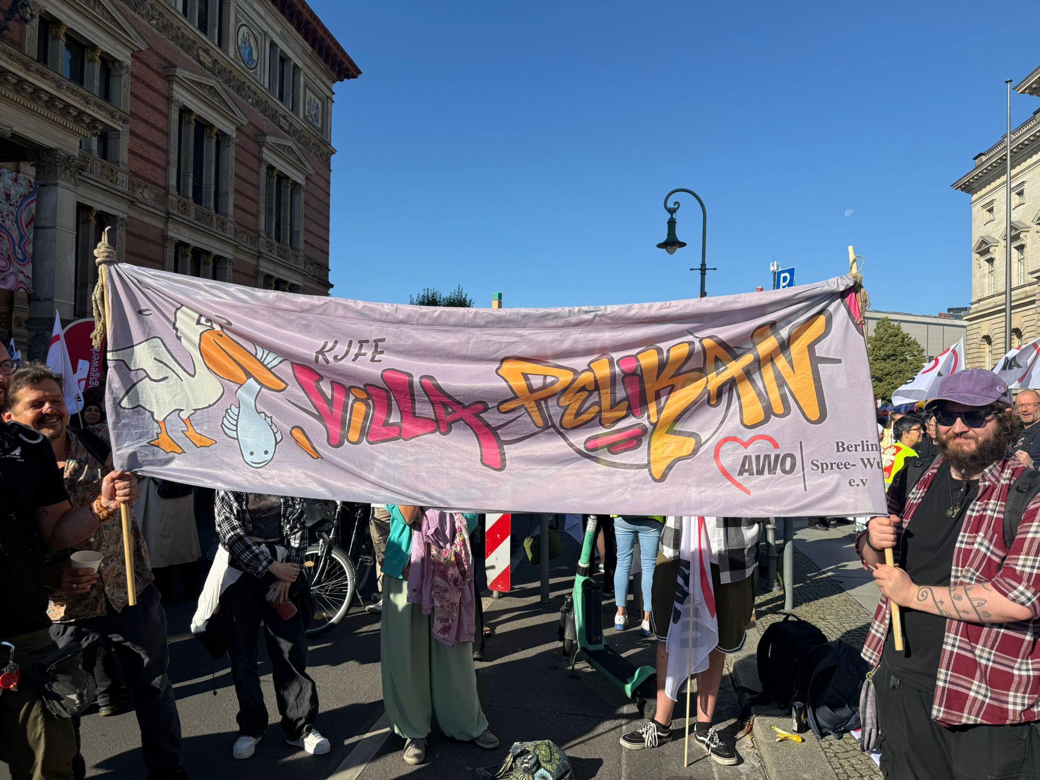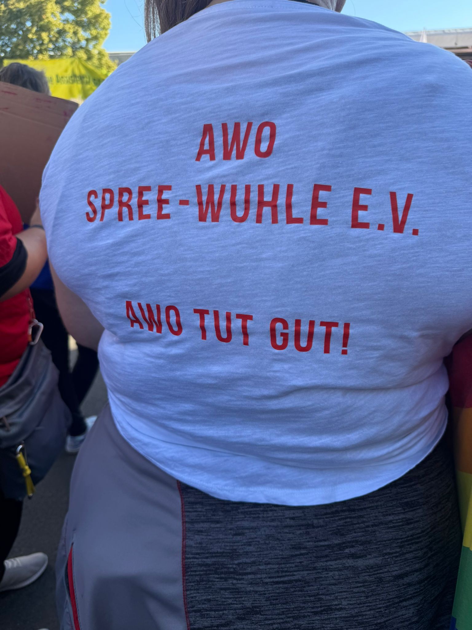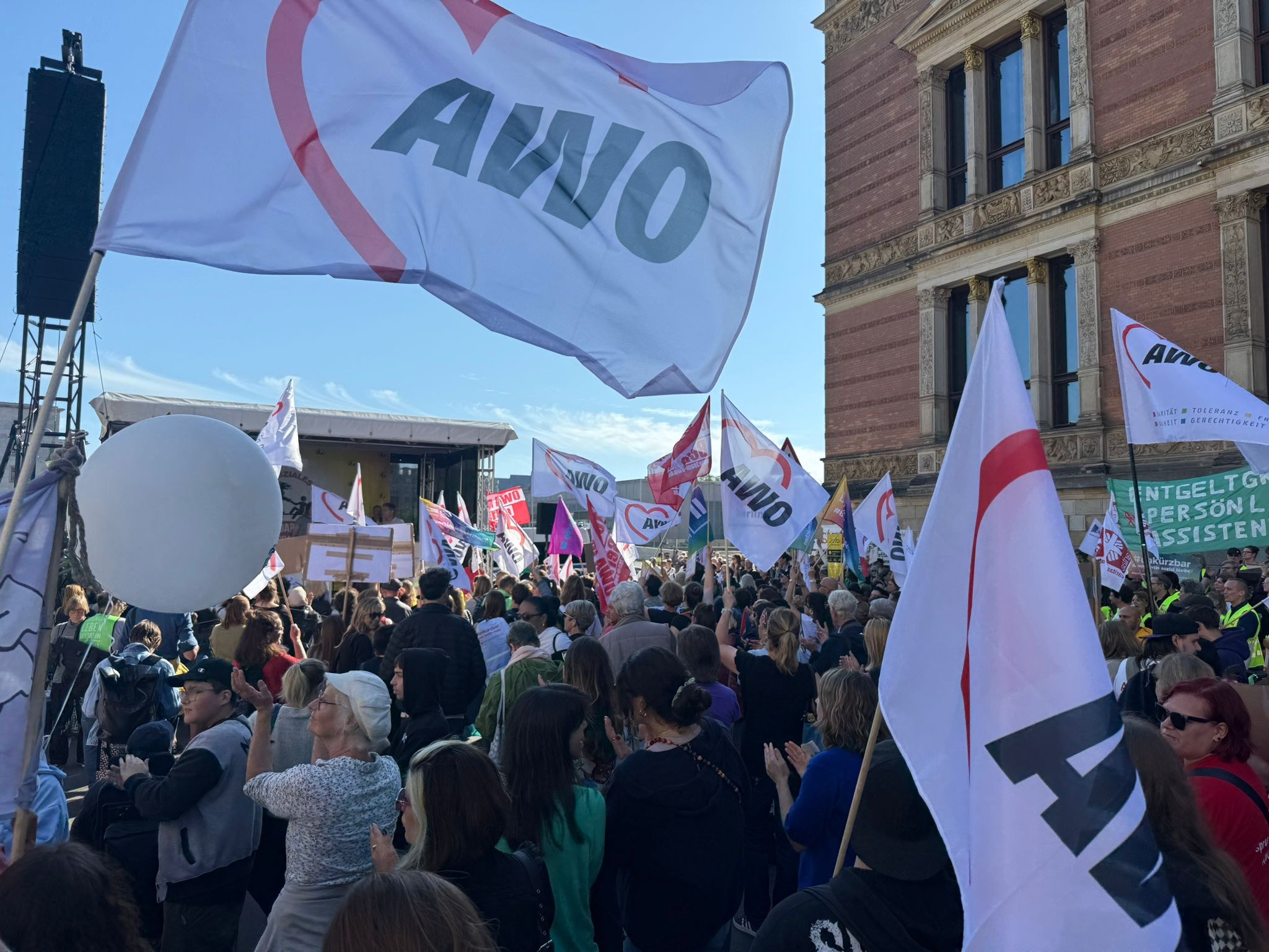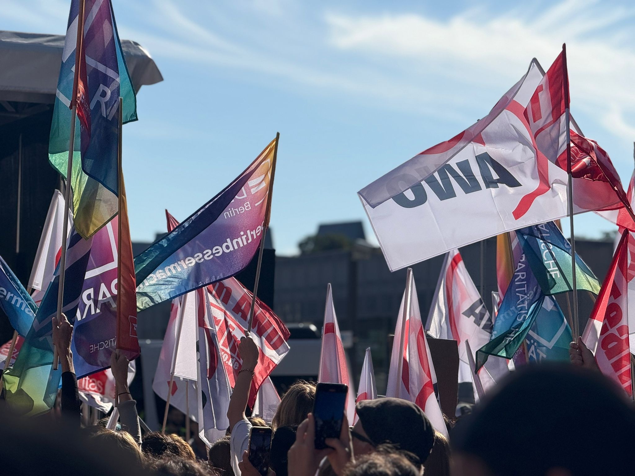 Mit darunter die Kolleg*innen der AWO Spree-Wuhle. Sie machten deutlich, dass sie die Kürzungen im Sozial-, Jugend- und Bildungsbereich nicht hinnehmen wollen und erwarten, dass die Politik muss ihre Verantwortung für ein soziales Berlin ernst nehmen muss.