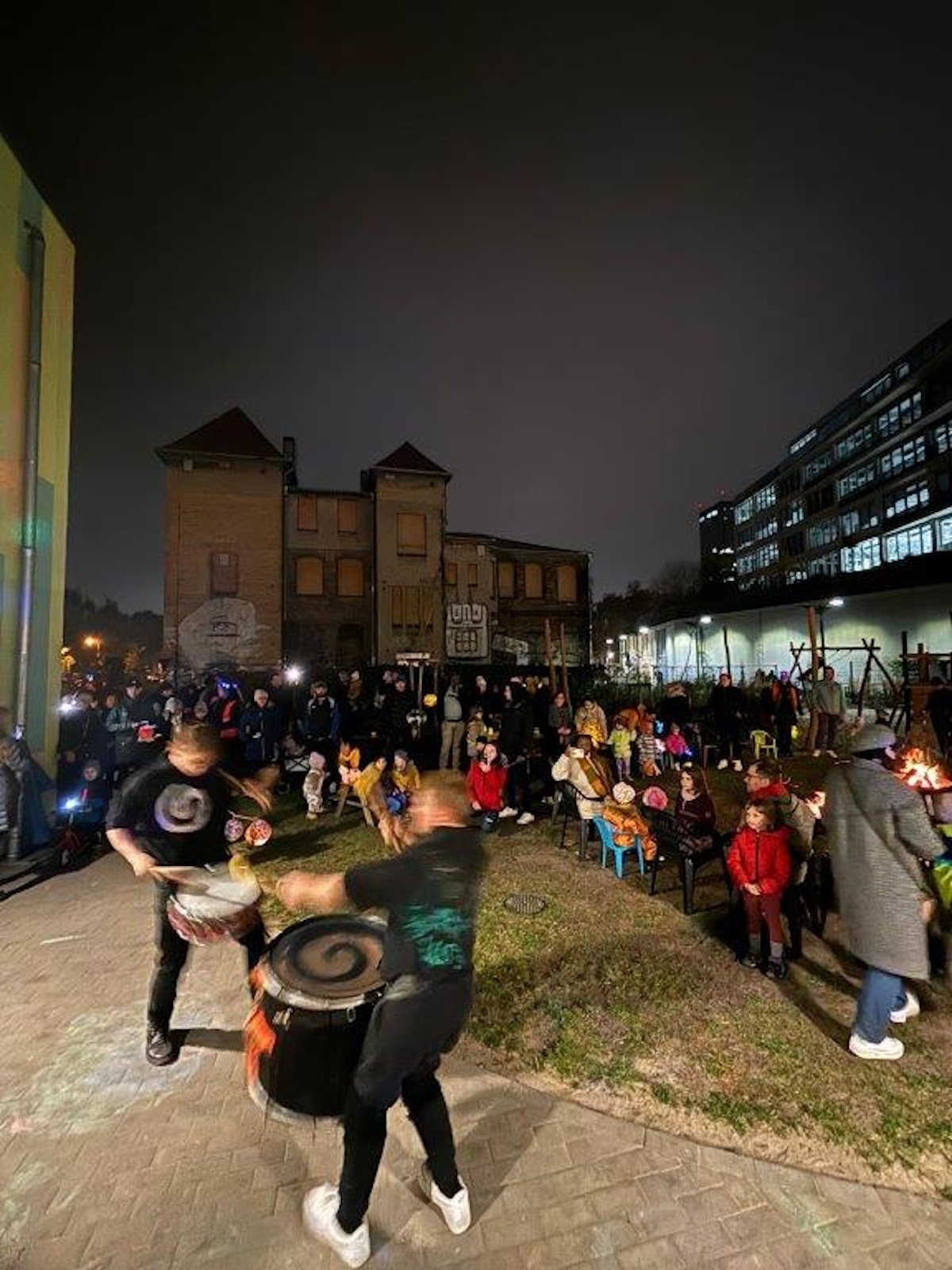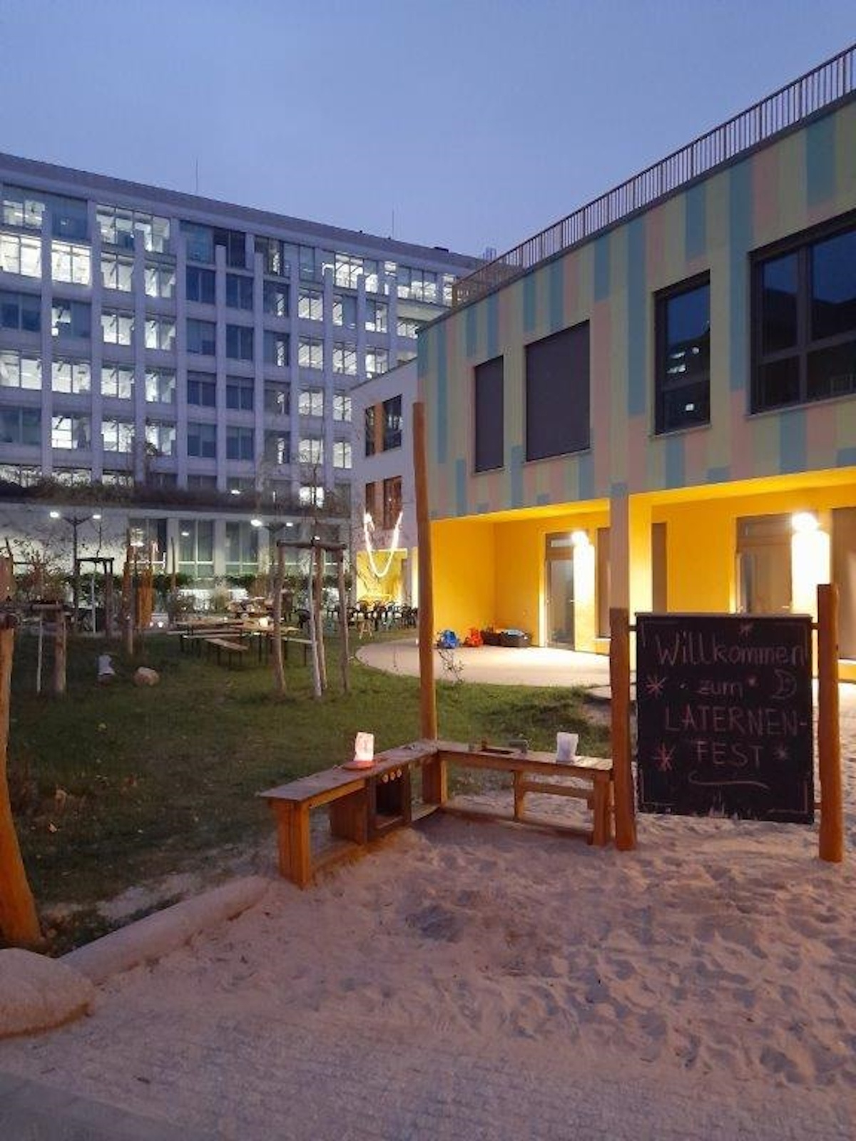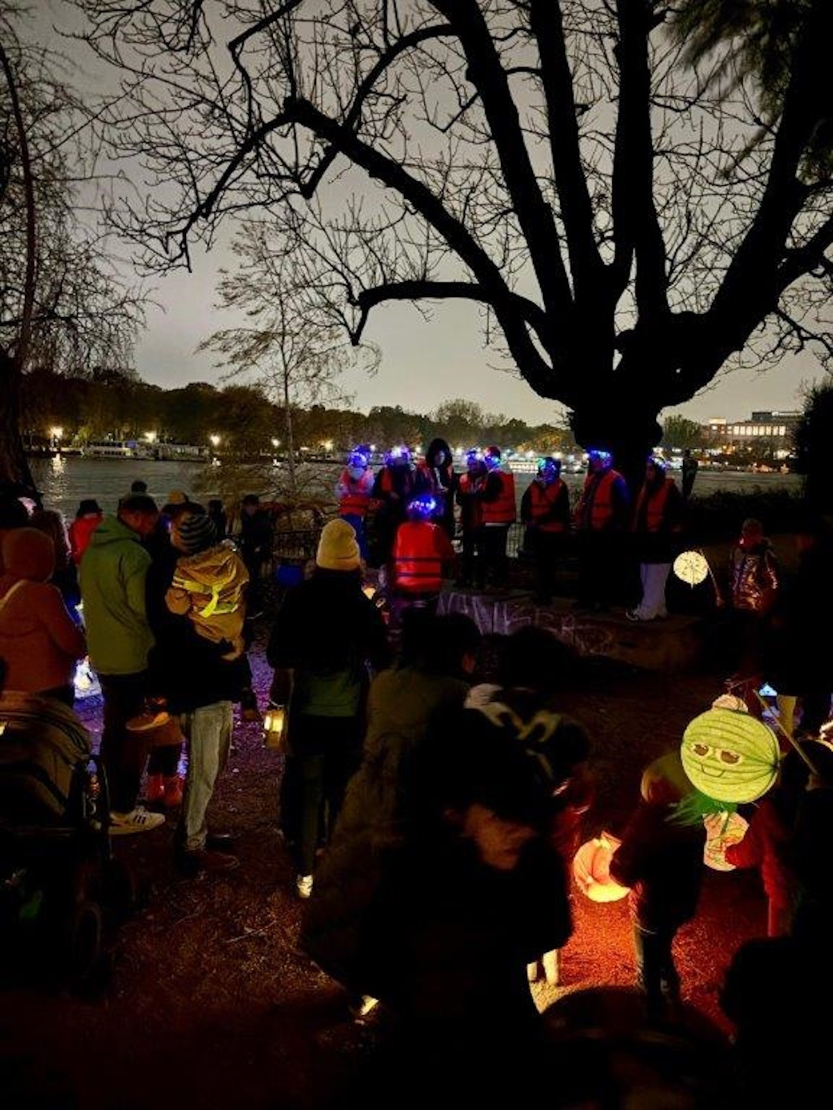 Am Tag darauf waren beim Laternenfest dann auch die Familien dabei. Mit leuchtenden Laternen ging es entlang des Stralauer Spreeufers in Richtung Kita. Unterwegs haben die „Samba Kids“ mit ihren Trommeln für allerbeste Stimmung gesorgt und den kleinen und großen Gästen ordentlich eingeheizt. Zurück auf dem Kita-Gelände konnte am Lagerfeuer duftendes Stockbrot gebacken werden. Zur Stärkung und zum Aufwärmen gab es außerdem Hot-Dogs, Schmalzstullen (alles veggie), warmen Tee und Glühwein für die Erwachsenen.