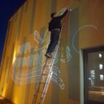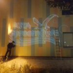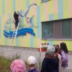 Bevor die erste Sprühdose zum Einsatz kam, konnten die Kinder einen Blick auf die digitale Entwurfsskizze werfen – und gaben begeistert ihr „Okay“. Anschließend entstand das Werk Schritt für Schritt: zunächst per Projektion im Dunkeln, dann mit Pinsel und Farbe zum Leben erweckt. Die Kinder verfolgten gespannt, wie ihre Kita ein neues, unverwechselbares Gesicht bekam.