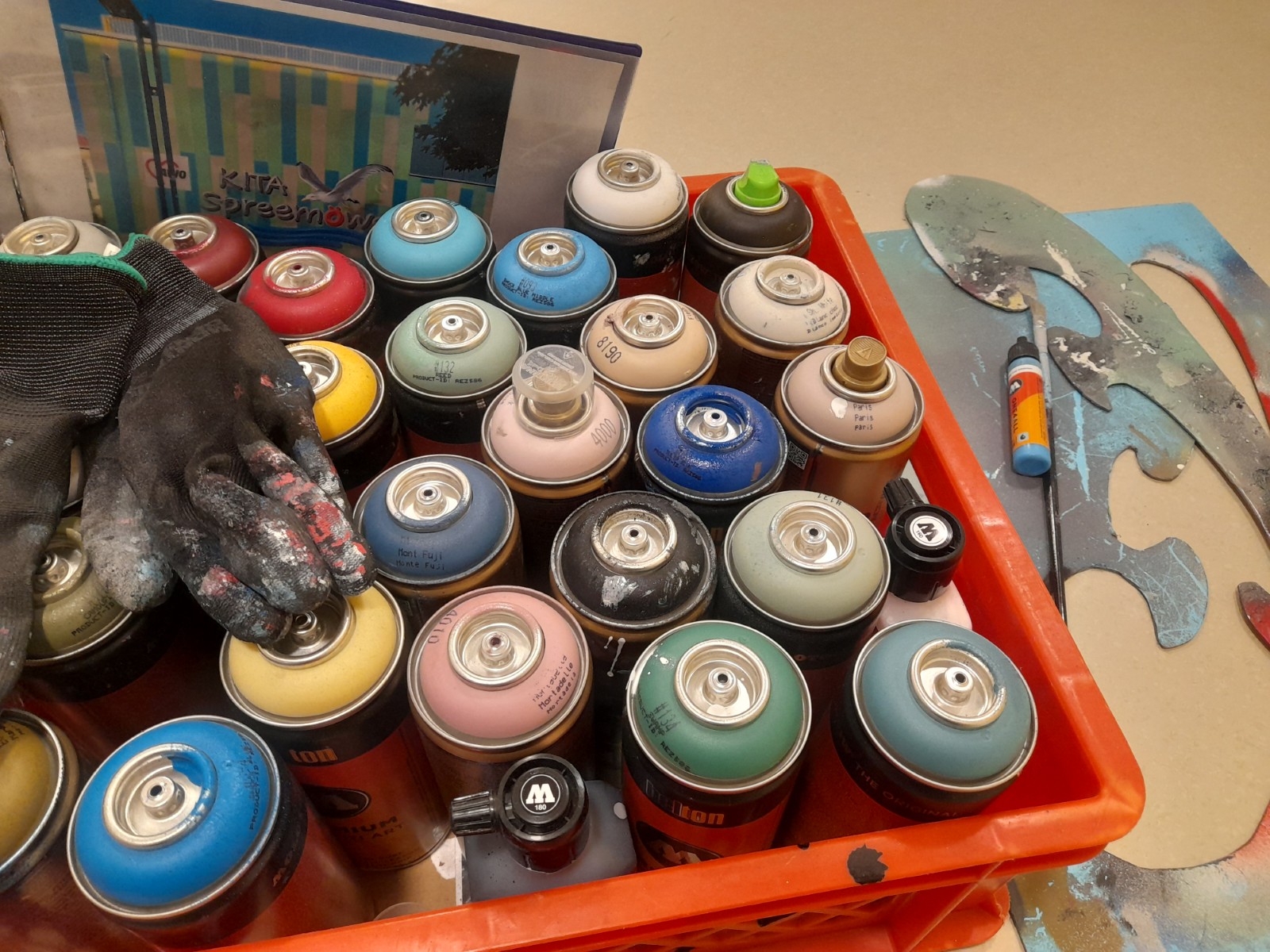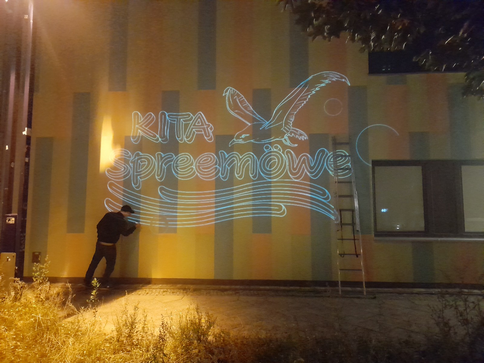 Bevor die erste Sprühdose zum Einsatz kam, konnten die Kinder einen Blick auf die digitale Entwurfsskizze werfen – und gaben begeistert ihr „Okay“. Anschließend entstand das Werk Schritt für Schritt: zunächst per Projektion im Dunkeln, dann mit Pinsel und Farbe zum Leben erweckt. Die Kinder verfolgten gespannt, wie ihre Kita ein neues, unverwechselbares Gesicht bekam.