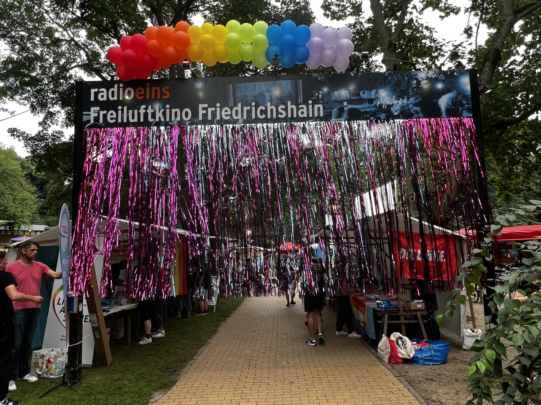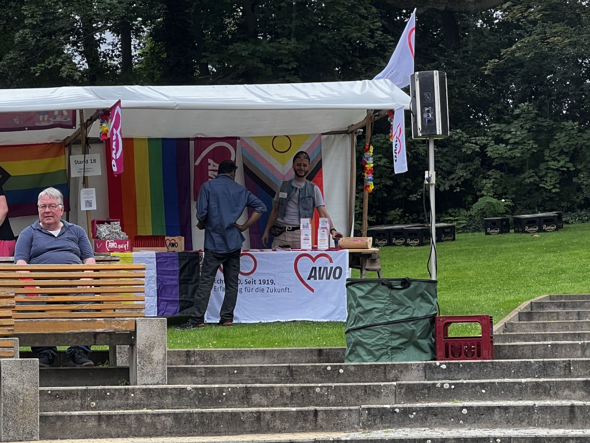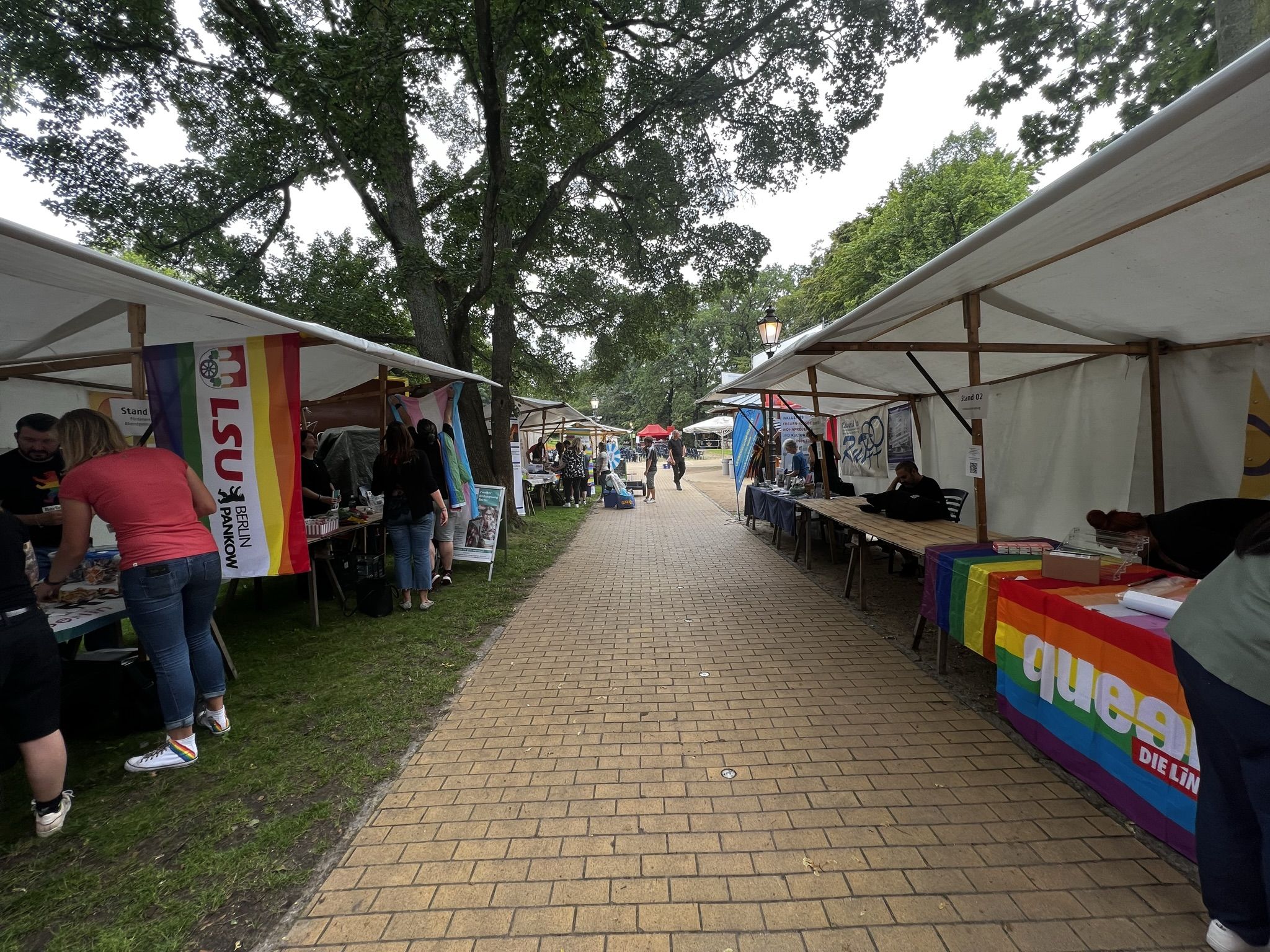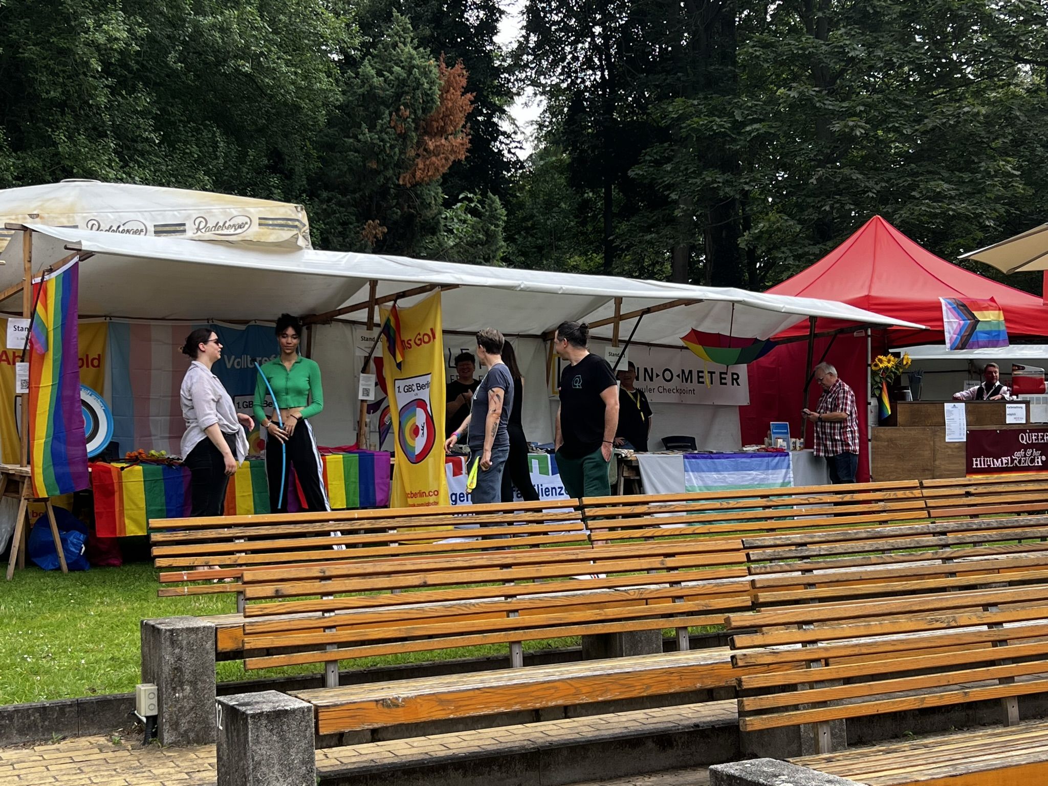 Schönes Wetter gehört zum Parkfest wie selbstverständlich dazu und selbst wenn es kurz regnet, scheint immer wieder die Sonne. Über den ganzen Nachmittag strömten mehr als 5.000 Besucher*innen ins Freiluftkino im Friedrichshain, um sich an den Ständen der meist ehrenamtlichen Projekte und freien Träger der queeren Szene, der Parteien und Organisationen zu unterschiedlichsten Themen zu informieren.