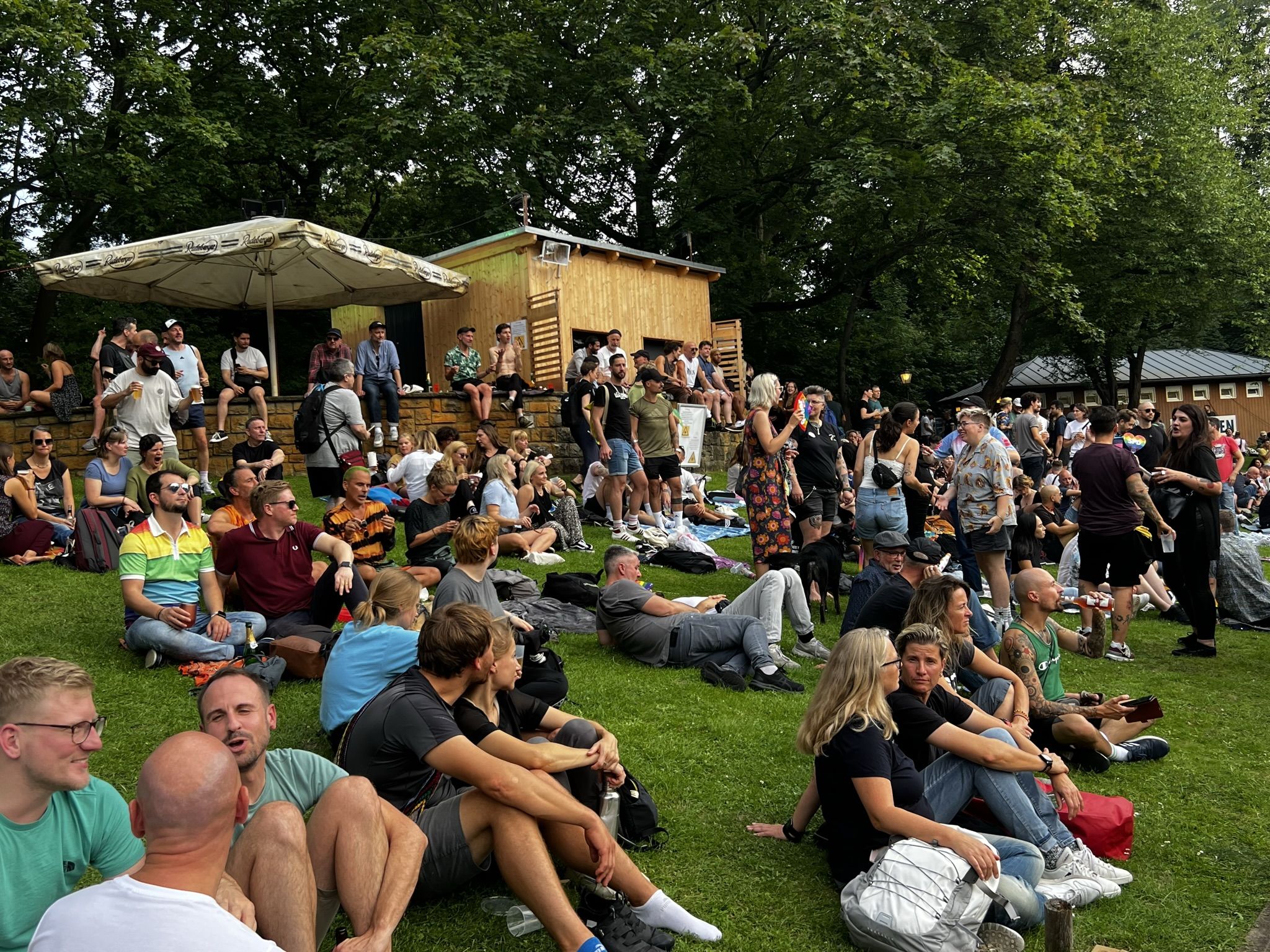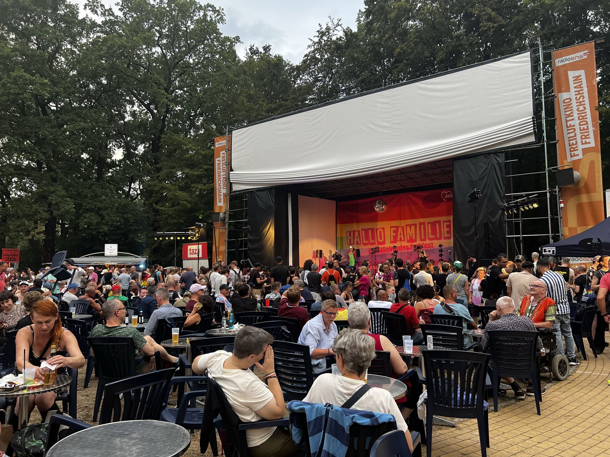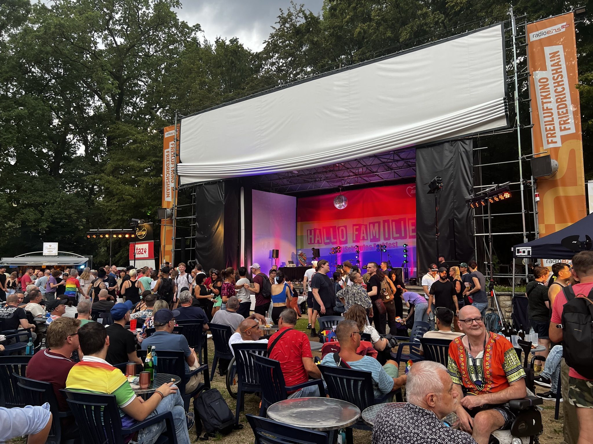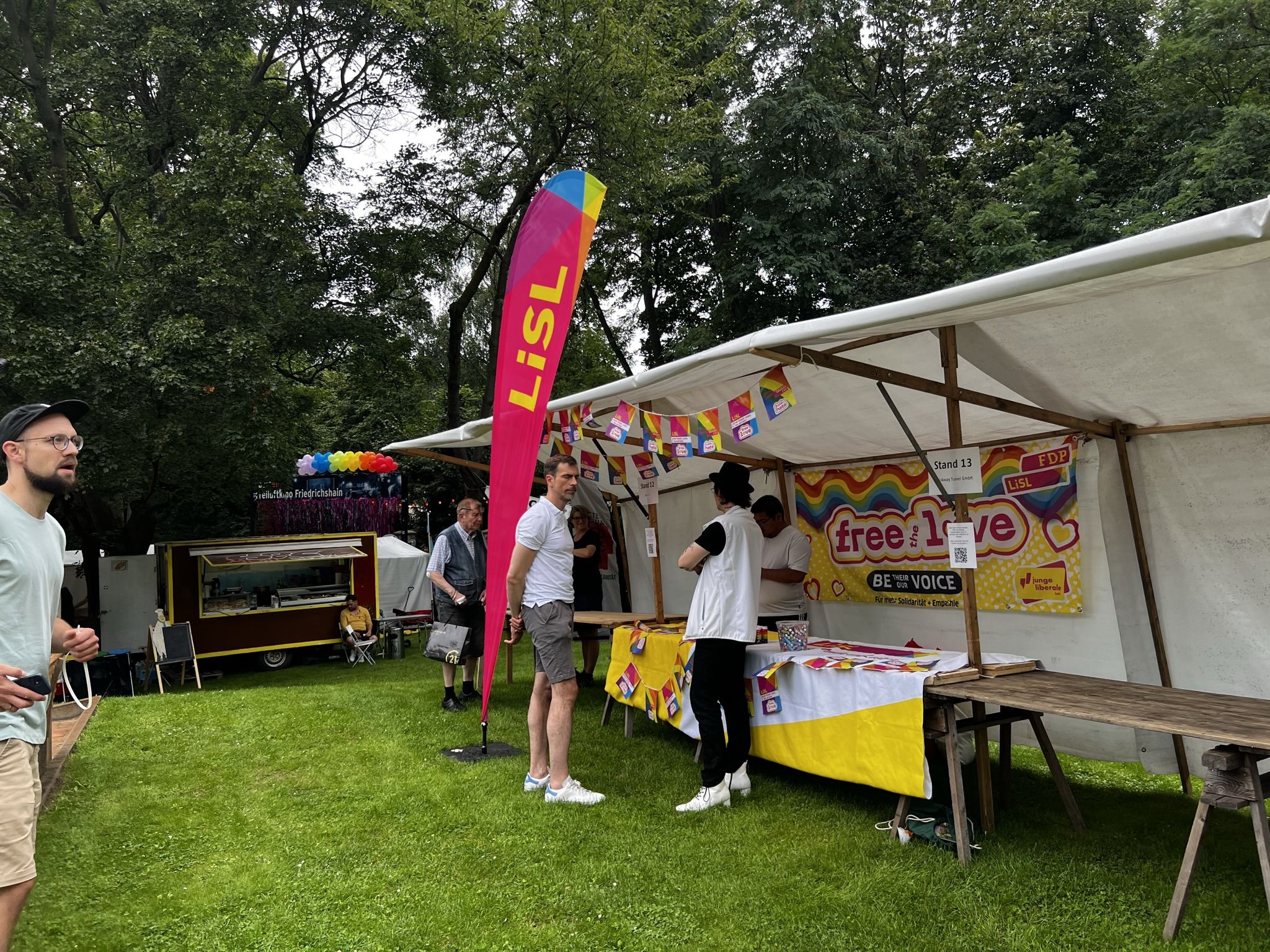 Schönes Wetter gehört zum Parkfest wie selbstverständlich dazu und selbst wenn es kurz regnet, scheint immer wieder die Sonne. Über den ganzen Nachmittag strömten mehr als 5.000 Besucher*innen ins Freiluftkino im Friedrichshain, um sich an den Ständen der meist ehrenamtlichen Projekte und freien Träger der queeren Szene, der Parteien und Organisationen zu unterschiedlichsten Themen zu informieren.