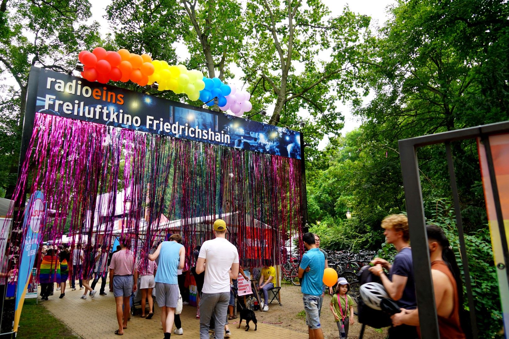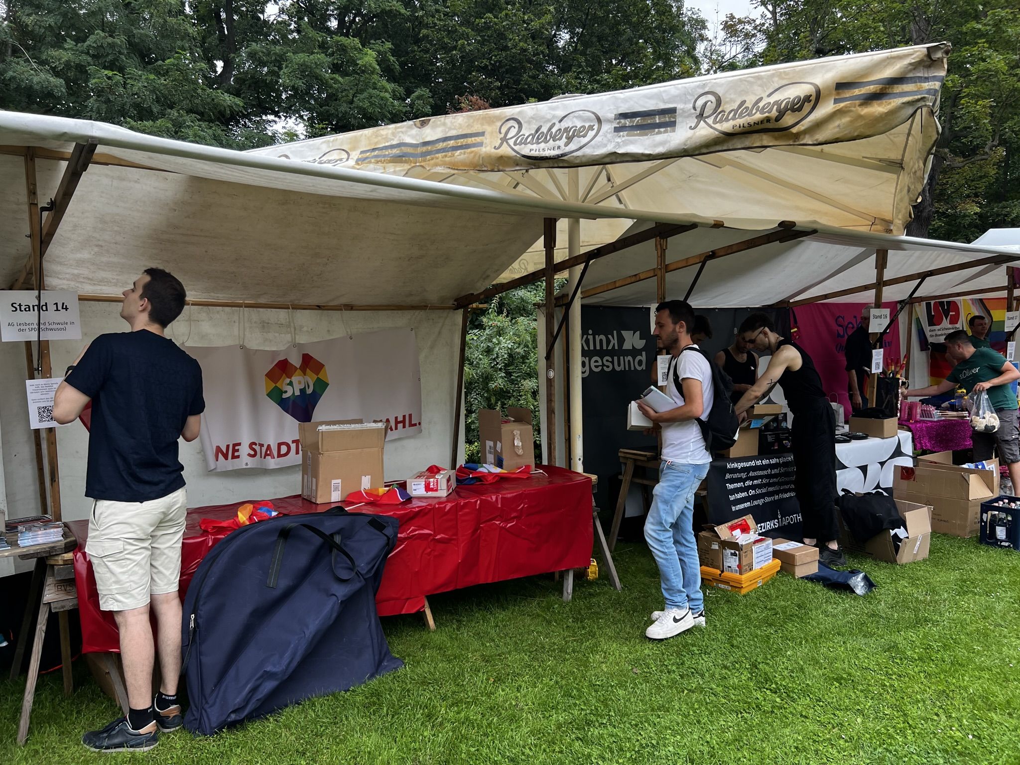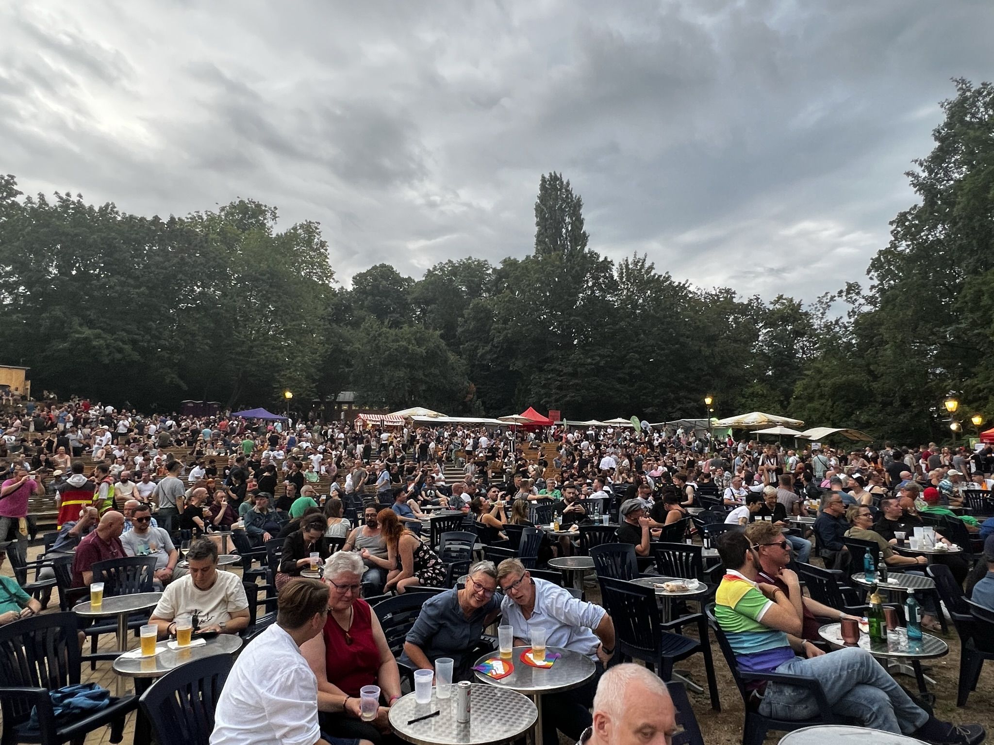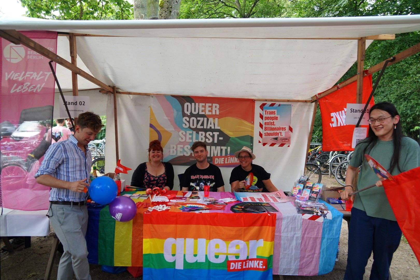 Schönes Wetter gehört zum Parkfest wie selbstverständlich dazu und selbst wenn es kurz regnet, scheint immer wieder die Sonne. Über den ganzen Nachmittag strömten mehr als 5.000 Besucher*innen ins Freiluftkino im Friedrichshain, um sich an den Ständen der meist ehrenamtlichen Projekte und freien Träger der queeren Szene, der Parteien und Organisationen zu unterschiedlichsten Themen zu informieren.