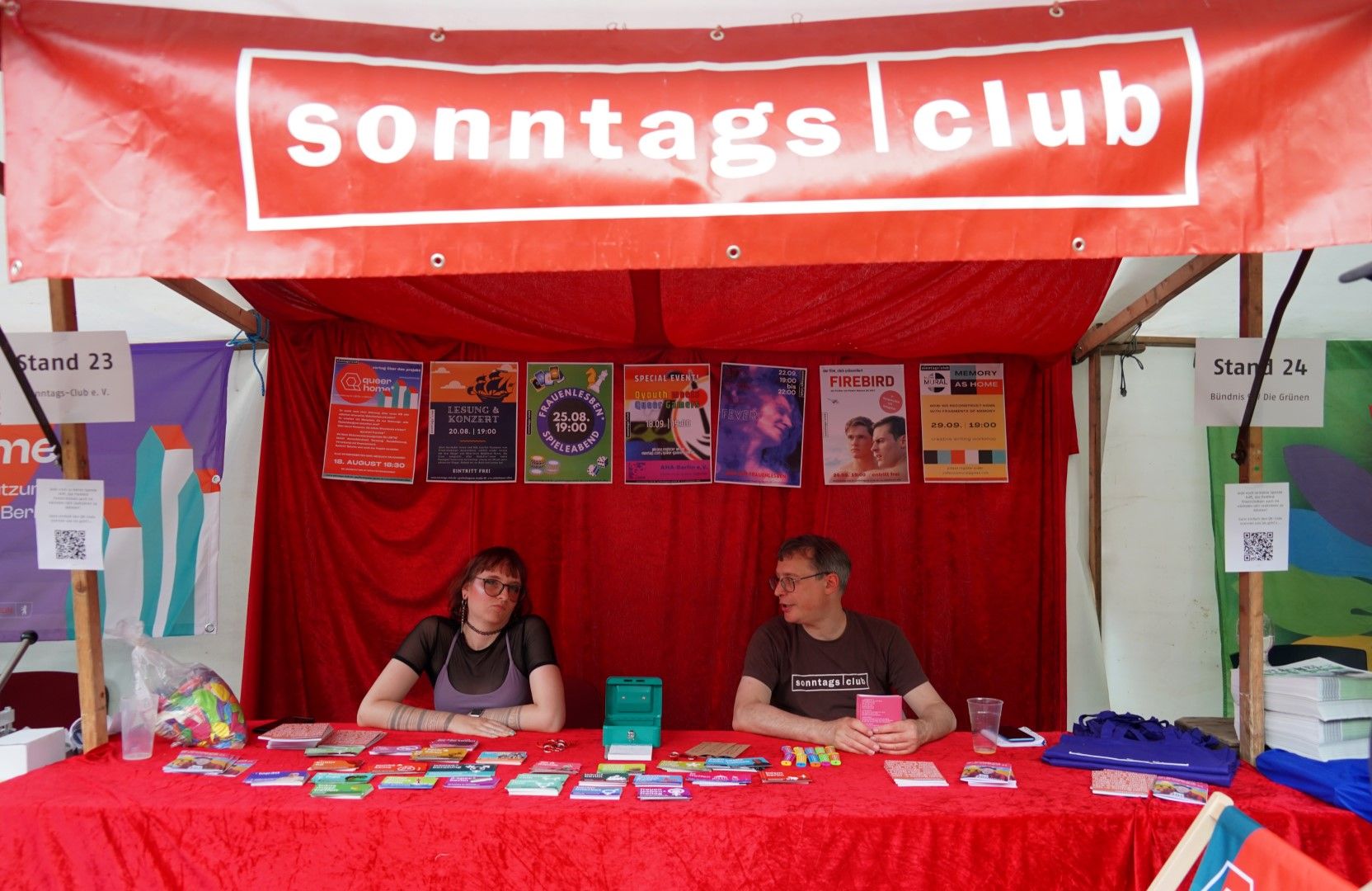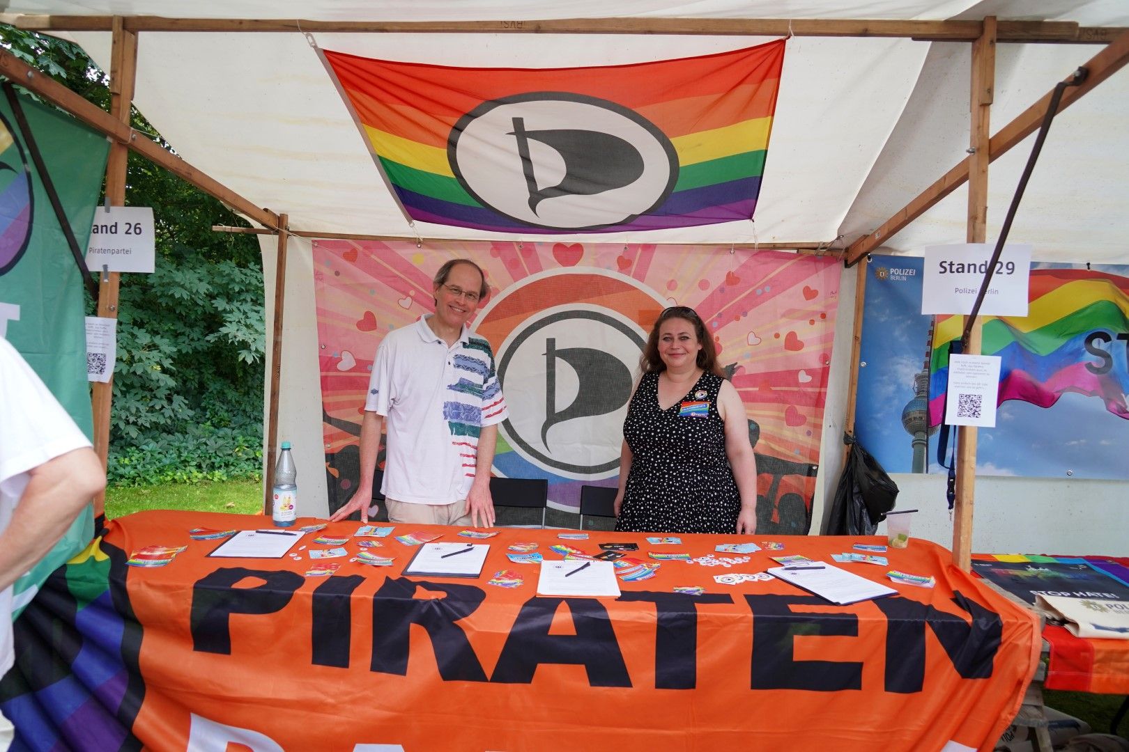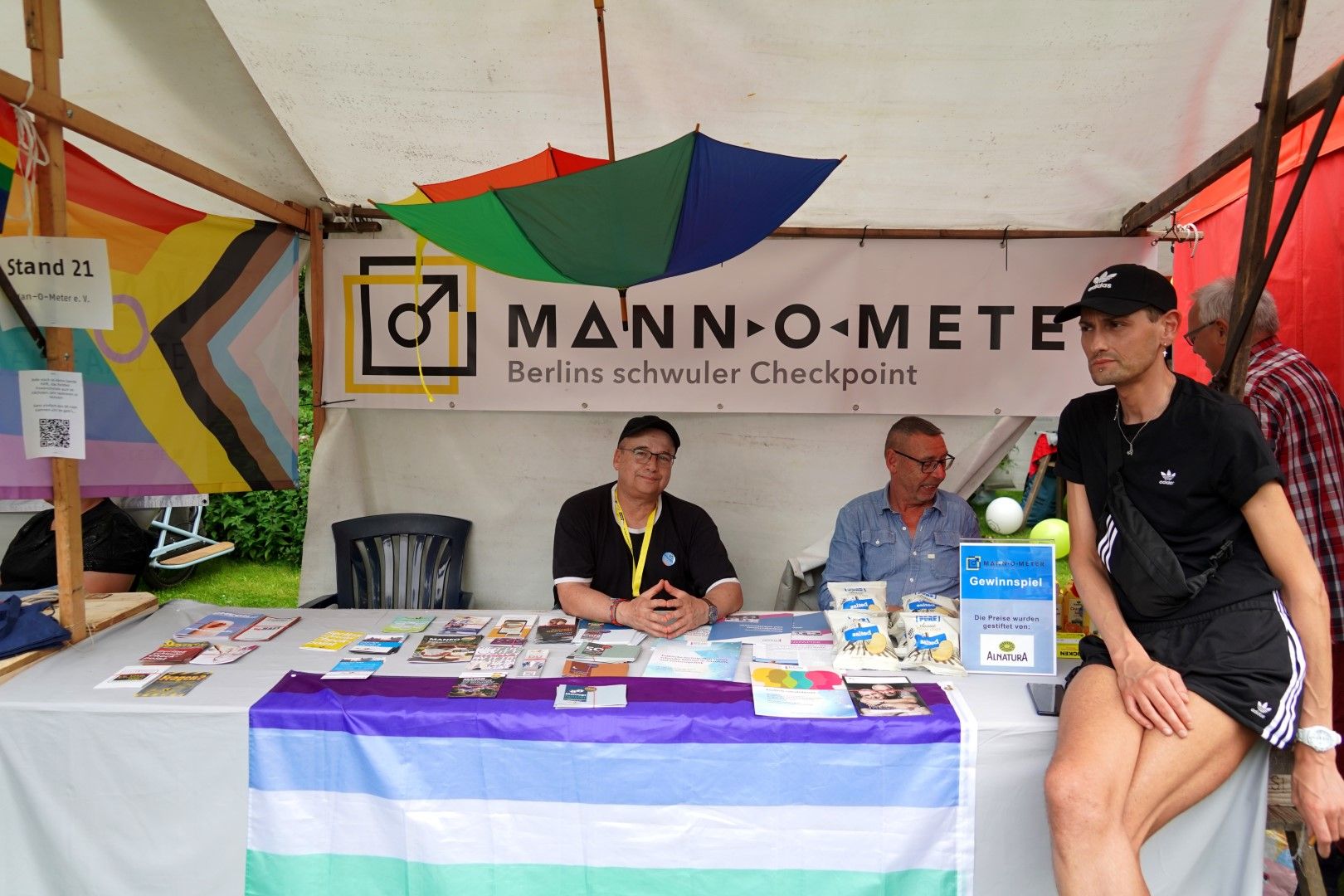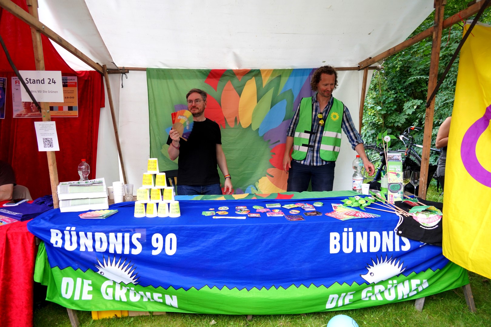 Schönes Wetter gehört zum Parkfest wie selbstverständlich dazu und selbst wenn es kurz regnet, scheint immer wieder die Sonne. Über den ganzen Nachmittag strömten mehr als 5.000 Besucher*innen ins Freiluftkino im Friedrichshain, um sich an den Ständen der meist ehrenamtlichen Projekte und freien Träger der queeren Szene, der Parteien und Organisationen zu unterschiedlichsten Themen zu informieren.