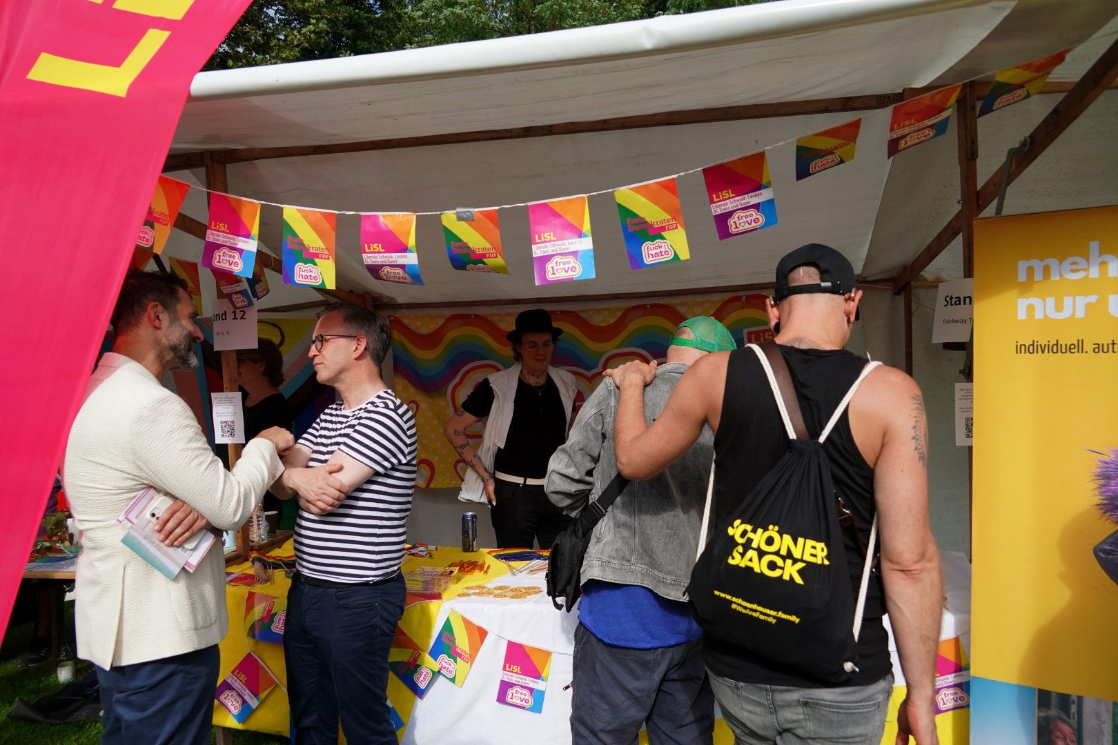 Unser Fest ist ein Ort, an dem wir alle zusammenkommen, um die Vielfalt und Einzigartigkeit unserer Gemeinschaft zu feiern. Wir glauben an Liebe, Akzeptanz und Respekt für alle, unabhängig von Geschlecht, Identität oder Herkunft. Diskriminierung hat hier keinen Platz. Wir sind stolz darauf, eine sichere und einladende Umgebung für jeden zu bieten, der mit uns feiern möchte.“