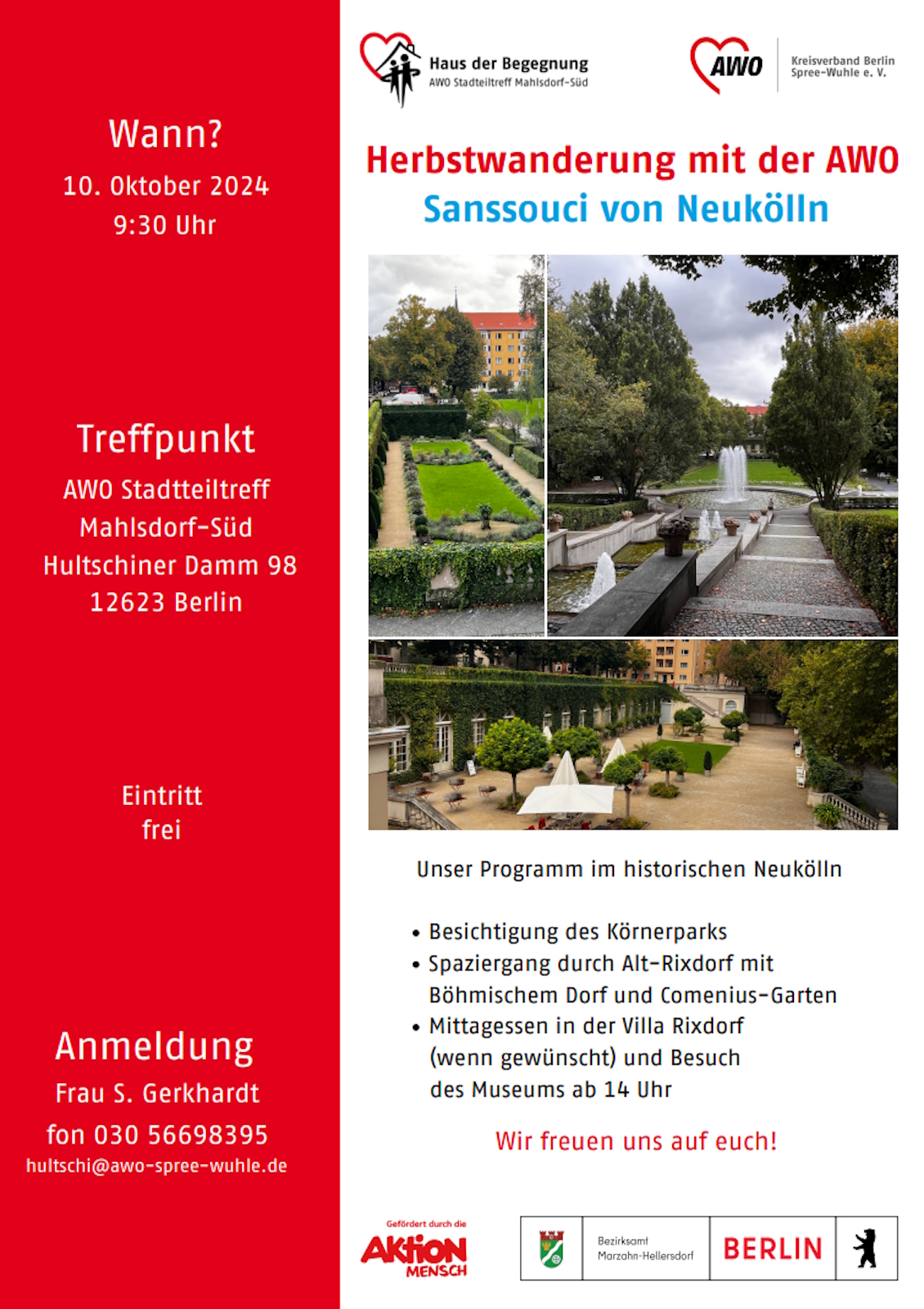 Das Haus der Begegnung – AWO Stadtteiltreff hatte am 17. Oktober 2024 im Rahmen des von der Aktion Mensch geförderten Projekts „Vielfalt durch Begegnung erlebbar machen“ zu einer Herbstwanderung ins historische Neukölln eingeladen.