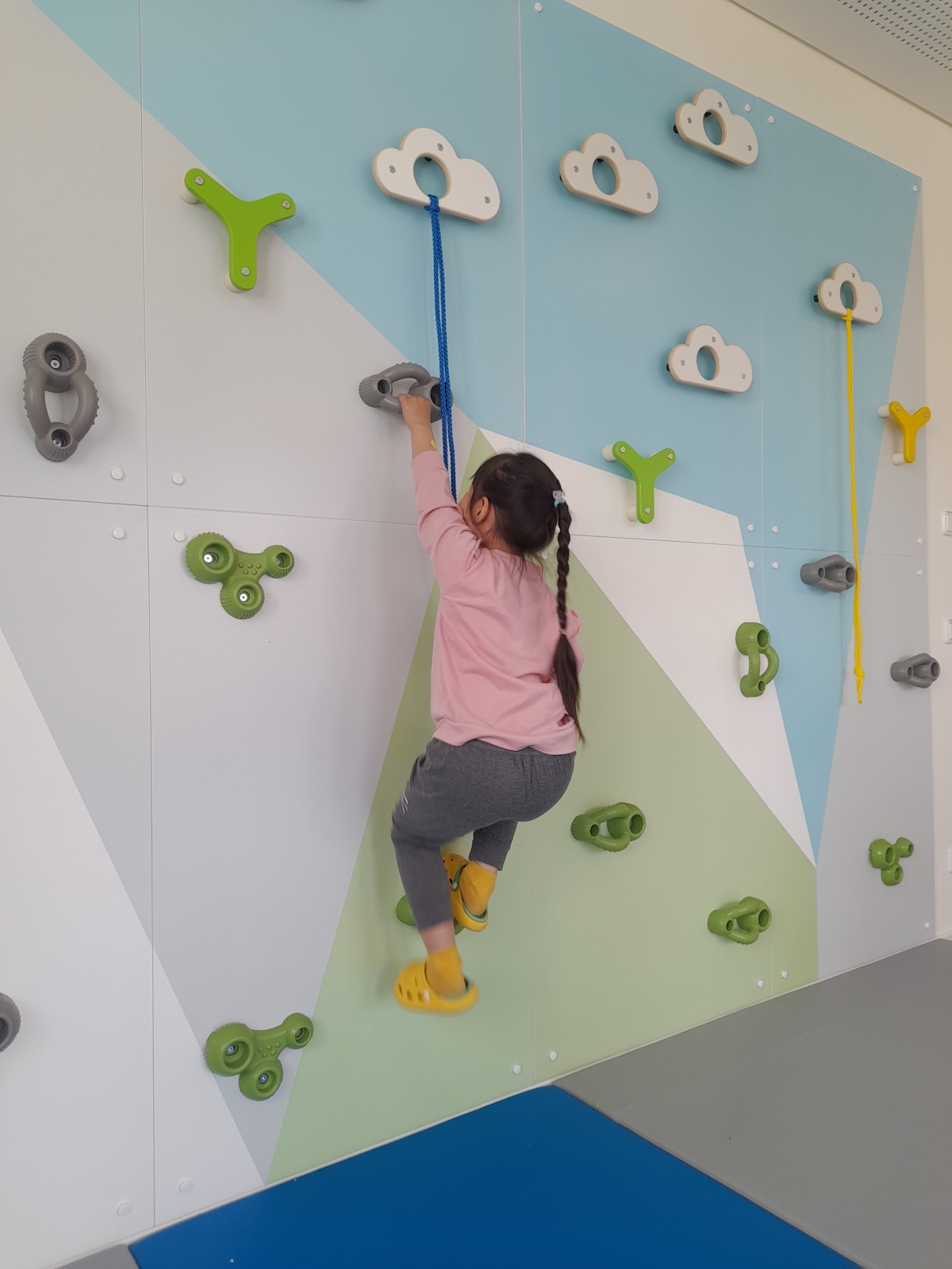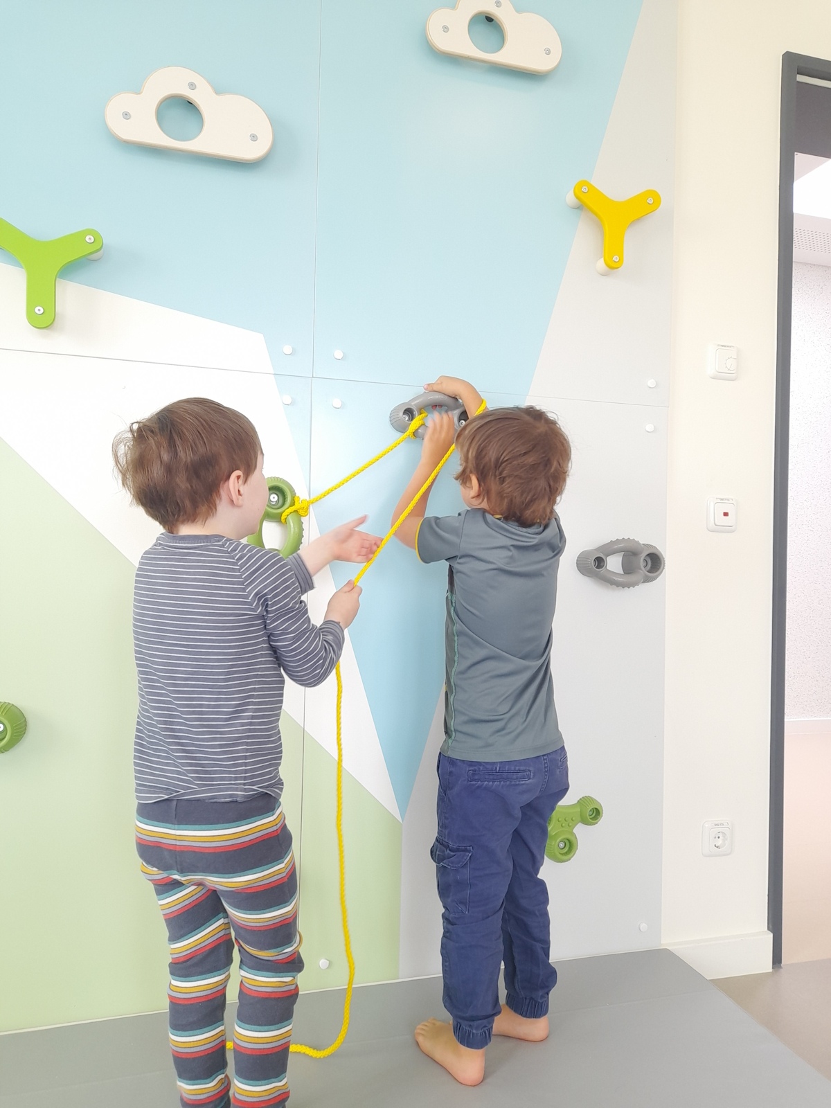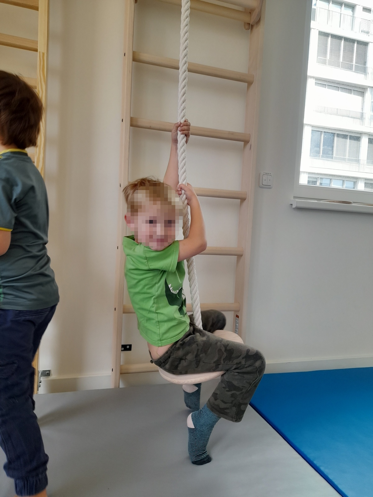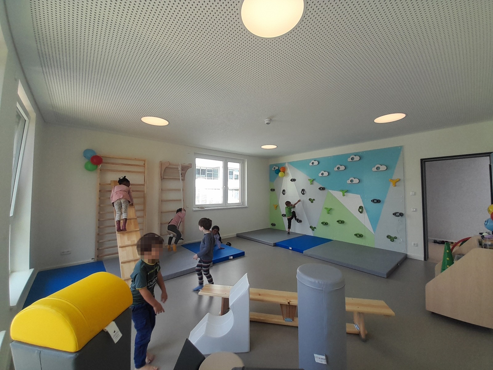 Am 12. Juni wurde nach langer Wartezeit endlich der neu eingerichtete Bewegungsraum eingeweiht. Mit einem Sandsäckchen als symbolischer Eintrittskarte durften die ersten Kinder in kleinen Gruppen die neuen Turn- und Klettergeräte ausprobieren. Beim Klettern, Springen, Hangeln, Rutschen, Schaukeln und Schwingen waren besonders konditionelle und koordinative Fähigkeiten gefragt. Doch Bewegungsförderung geht auch mit sozialem Lernen einher, z.B. abwarten, bis man an der Reihe ist, Hindernisse gemeinsam bewältigen, Tricks und Kniffe austauschen, einander Mut zusprechen, sich gemeinsam über Erfolge freuen, Rücksicht nehmen, Absprachen treffen und einander trösten, wenn sich ein Kind verletzt hat. Nach einer kurzen Trinkpause wurden in einer Gesprächsrunde wichtige Verhaltensregeln zur Unfallprävention aufgefrischt.
