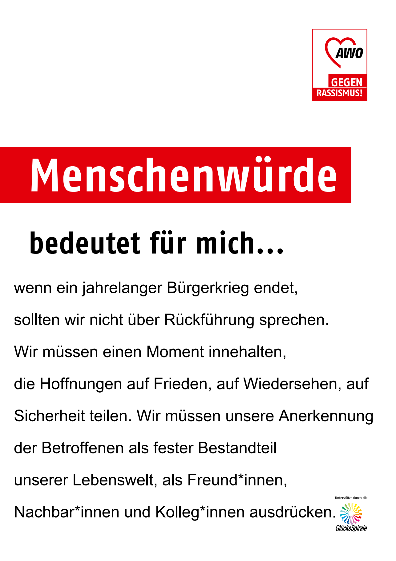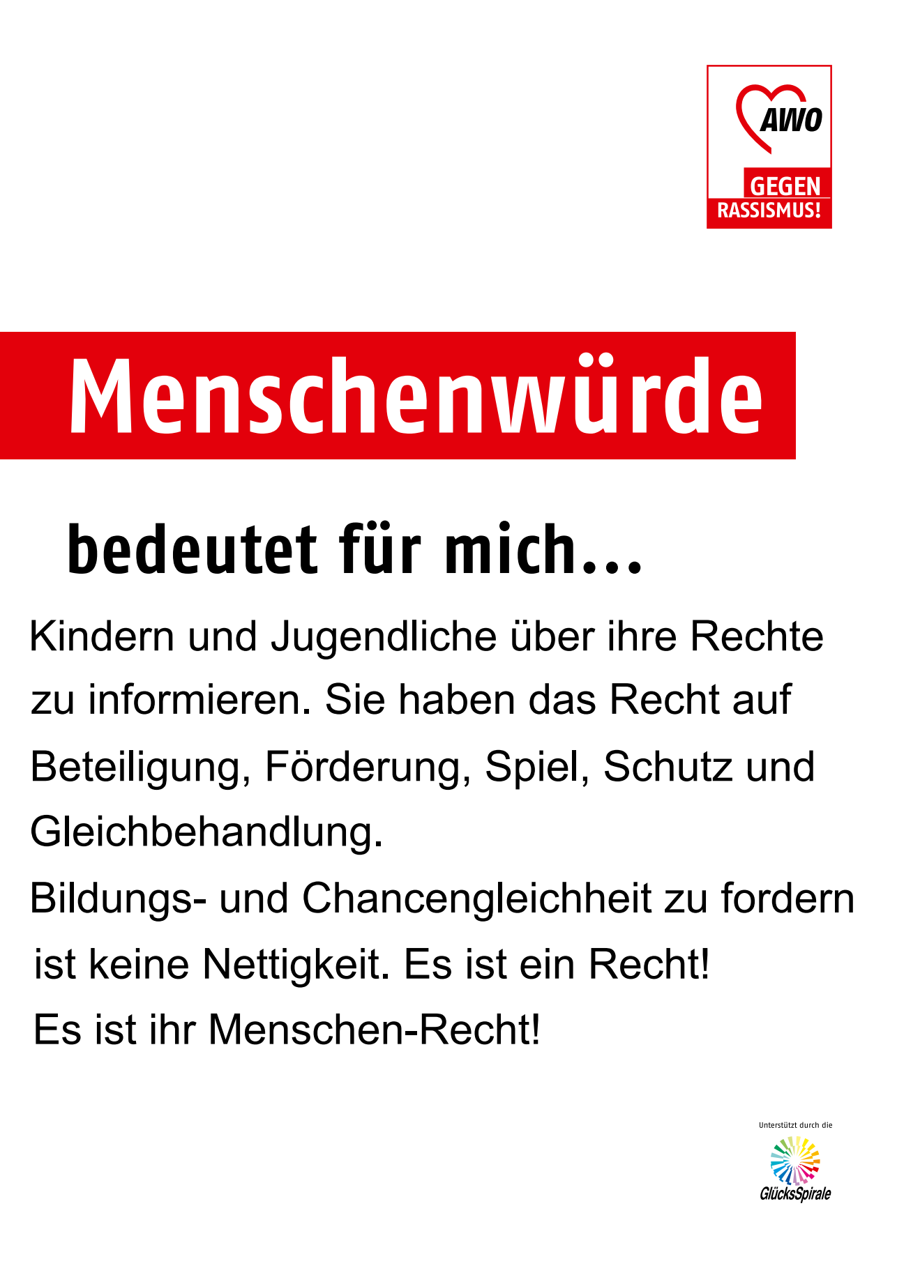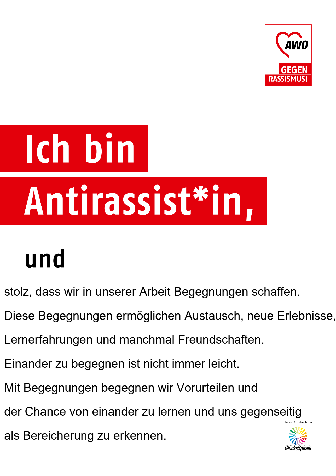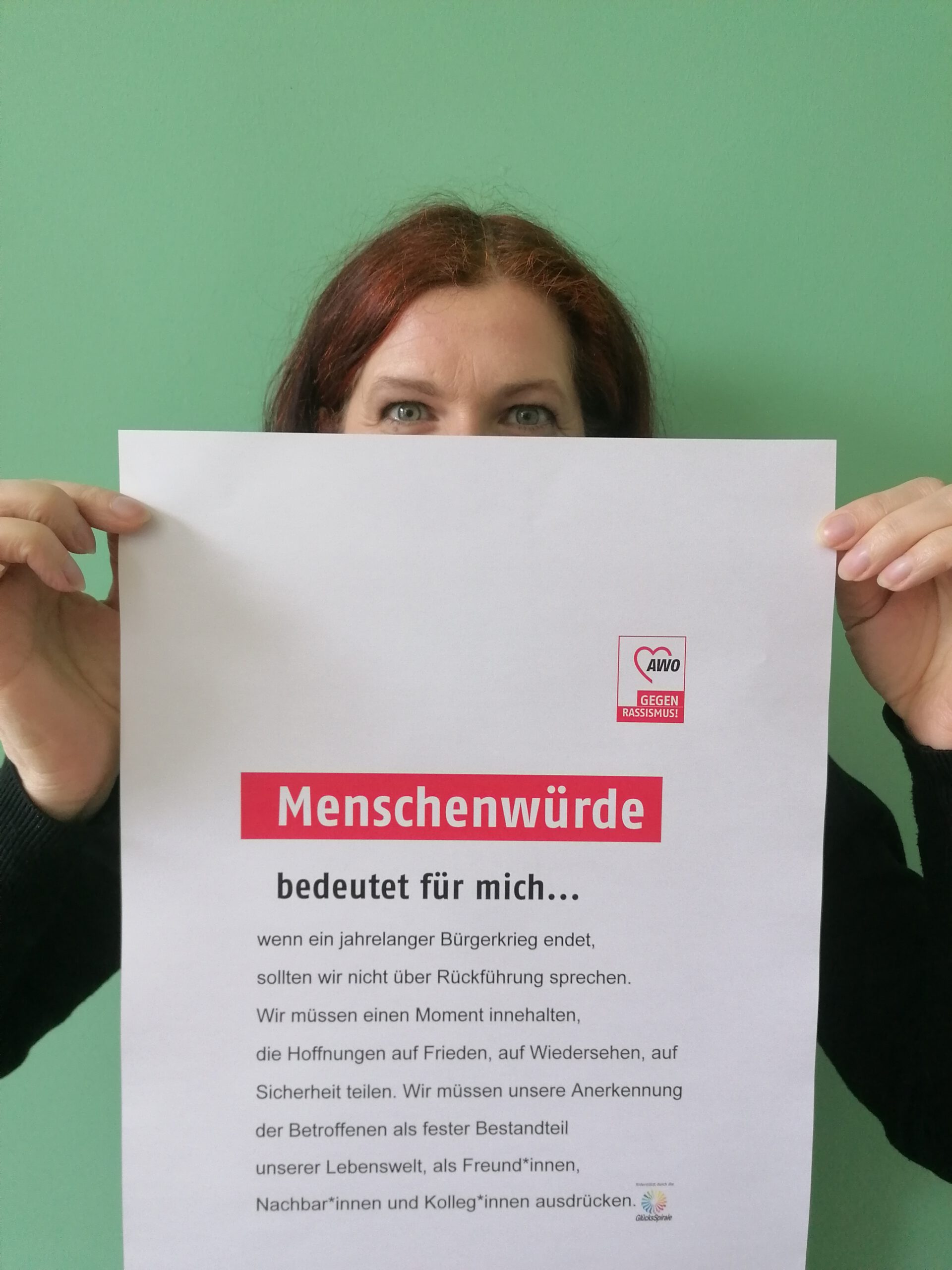 Der Internationale Tag gegen Rassismus am 21. März setzt seit Jahren ein klares Zeichen gegen Diskriminierung in unserer Gesellschaft. Die Einrichtungen der AWO Spree-Wuhle beteiligen sich mit verschiedenen Aktionen in der Internationalen Woche gegen Rassismus. In diesem Jahr nahmen auch die Mitarbeiter*innen der AWO Geschäftsstelle an einer Aktion teil. Für die bundesweite AWO – Plakat Aktion wurden eigene Statements formuliert, die bewusst machen wollen, dass Rassismus ein Thema ist, dass alle betrifft!