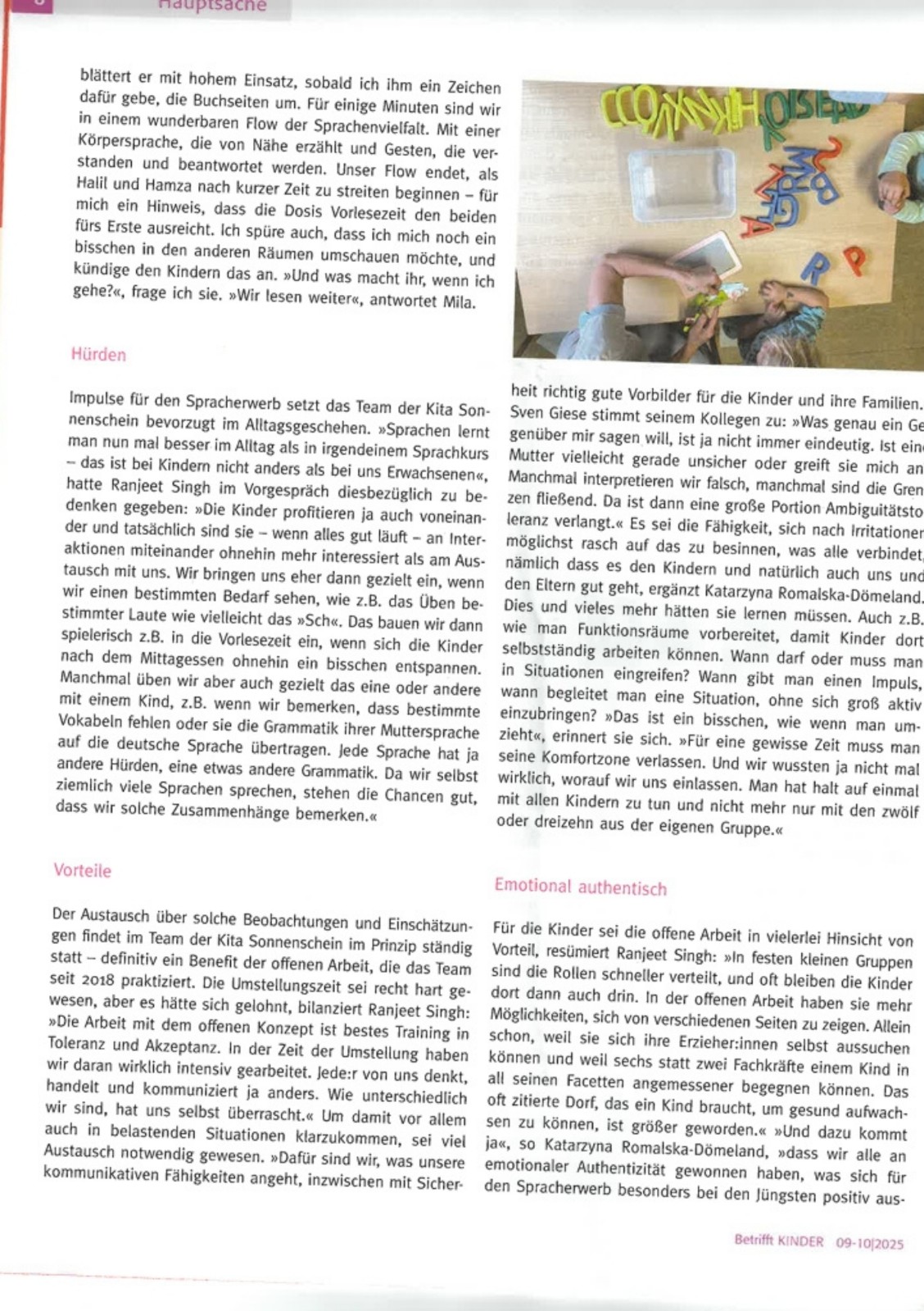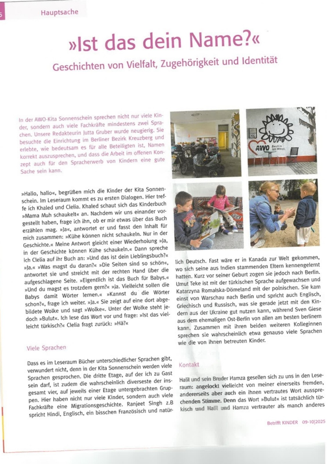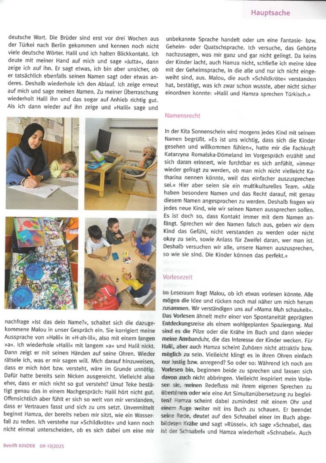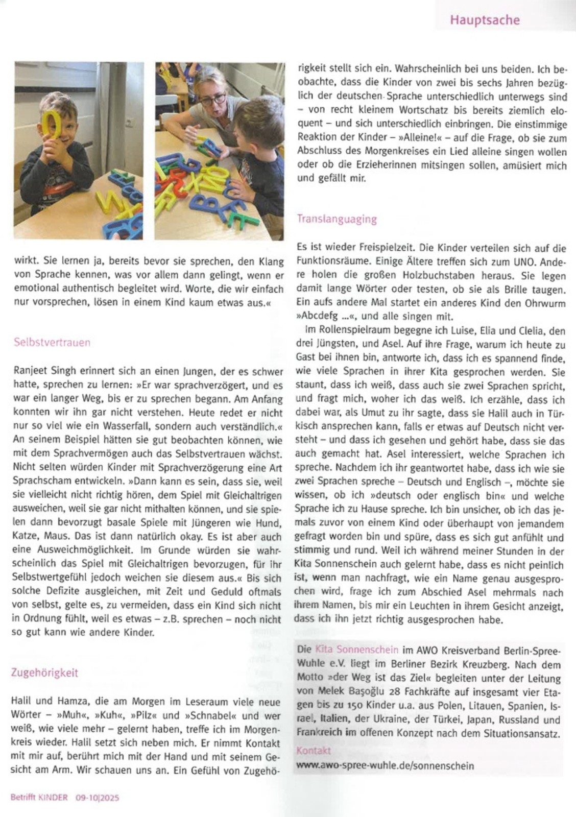 In Ausgabe 9-10/25 des Praxisjournals für Bildung und Beziehung in der frühen Kindheit „Betrifft KINDER“ ist ein Beitrag über unsere Kita Sonnenschein in Kreuzberg erschienen, wo nicht nur viele Kinder, sondern auch viele Fachkräfte mindestens zwei Sprachen sprechen.