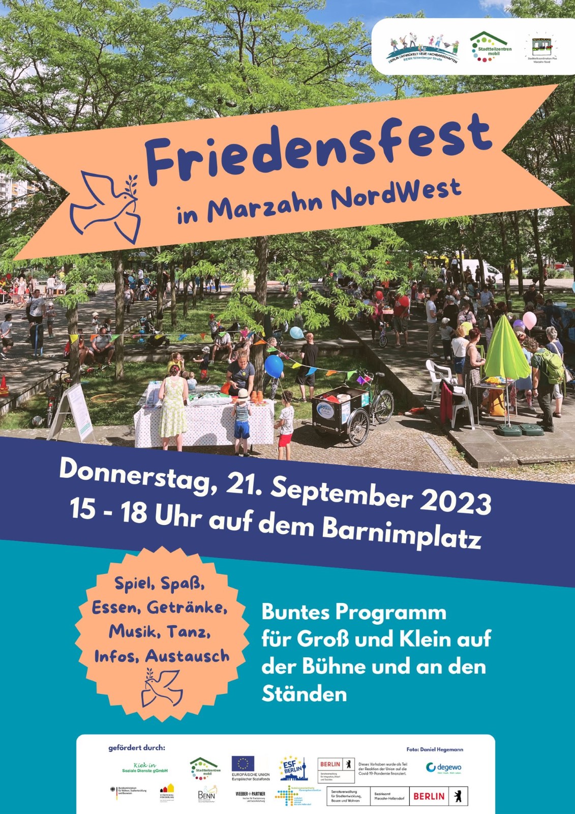 Alljährlich laden BENN und Stadtteilkoordination Plus Marzahn NordWest, alle Bürgerinnen, Bürger und Aktive in Marzahn NordWest zum Friedensfest auf dem Barnimplatz ein.