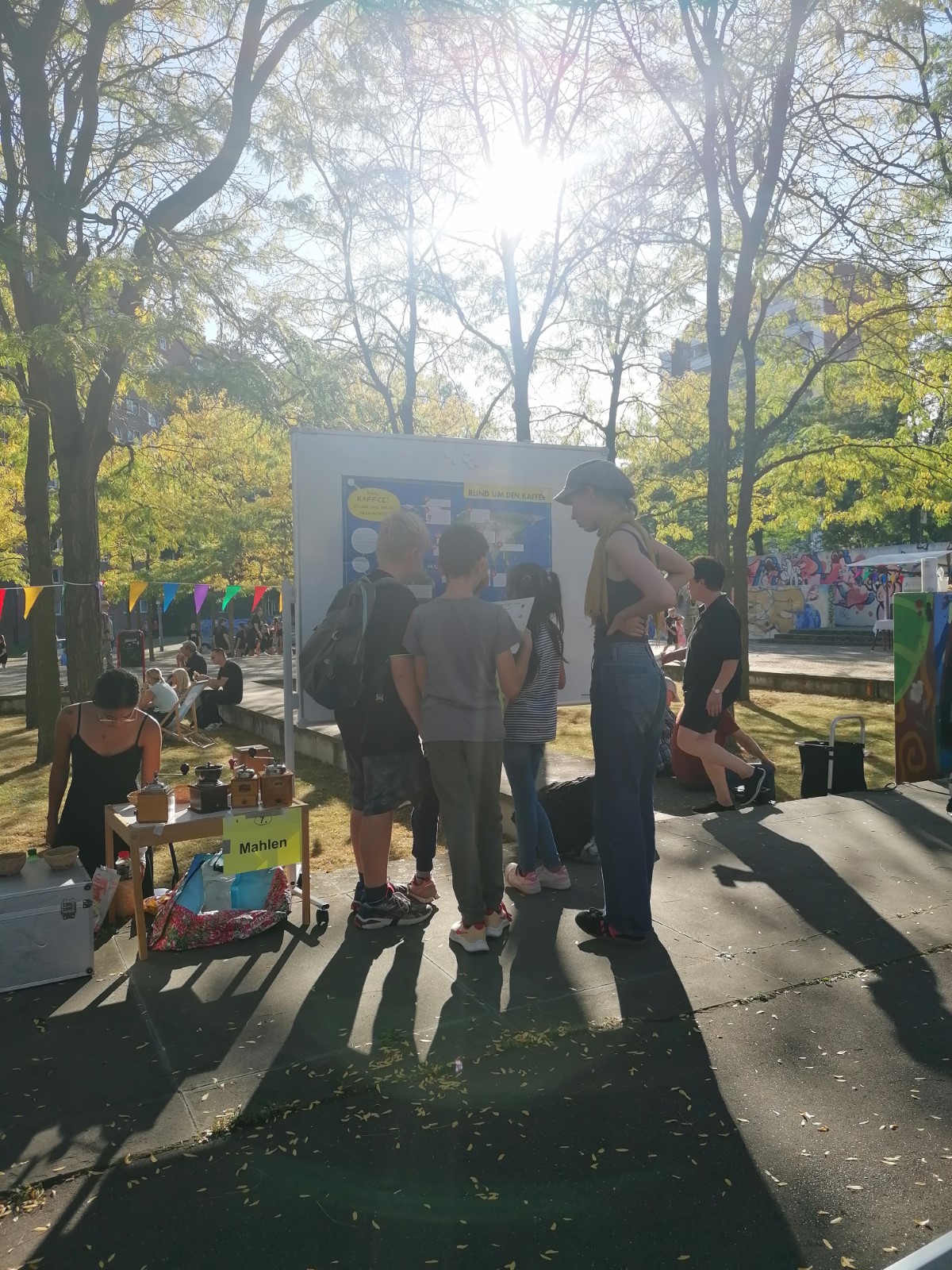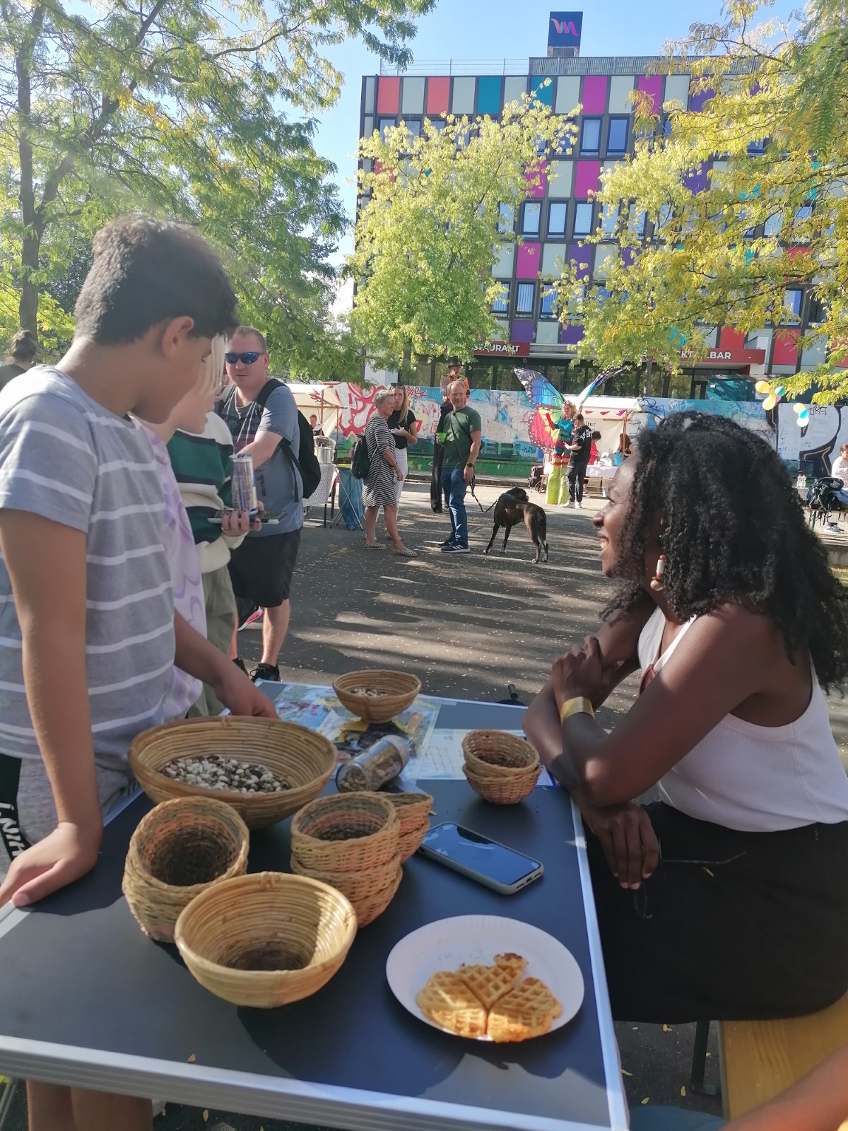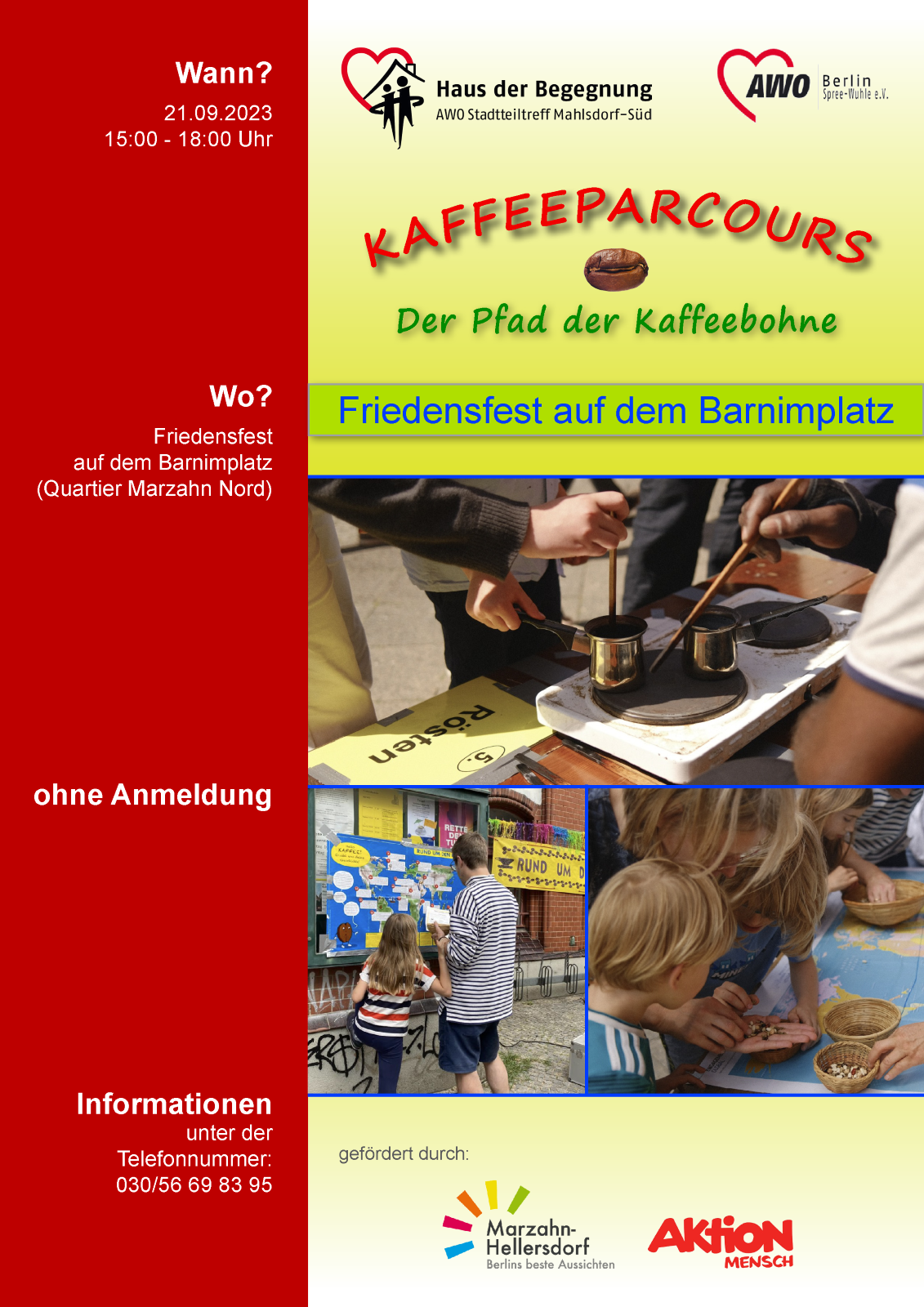 Das Haus der Begegnung AWO Stadtteiltreff Mahlsdorf-Süd mit seinem Projekt „Kulturelle Vielfalt durch Begegnung erlebbar machen“ beteiligte sich am 21. September in Kooperation mit „mehrSicht e.V.“ und deren Kaffeeparcours – einer Aktion zum Welthandel – am Friedensfest auf dem Barnimplatz. Das Projekt „Kulturelle Vielfalt“ wird von Aktion Mensch unterstützt.