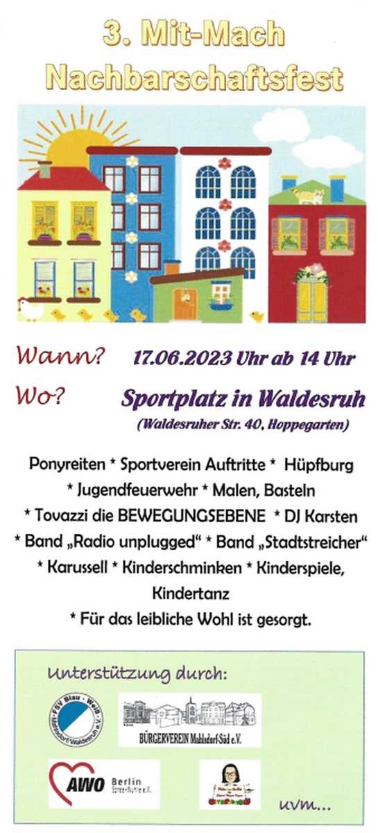 Am 17. Juni fand das Mitmach-Nachbarschaftsfest auf dem Sportplatz in Waldesruh statt, ein buntes Programm mit Musikbühne, Ponyreiten, Feuerwehr u.v.m. wurde geboten.