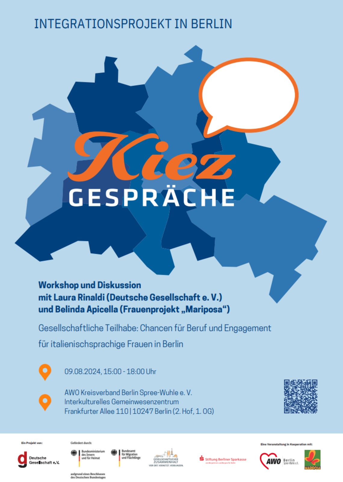 Am 09. August 2024 fand im Frauenprojekt Mariposa die Veranstaltung „Kiezgespräche“ mit Laura Rinaldi, Referentin für Kultur & Gesellschaft der Deutsche Gesellschaft e. V. (Verein zur Förderung politischer, kultureller und sozialer Beziehungen in Europa) zum Thema „Gesellschaftliche Teilhabe: Chancen für Beruf und Engagement für italienischsprachige Frauen in Berlin“ statt.