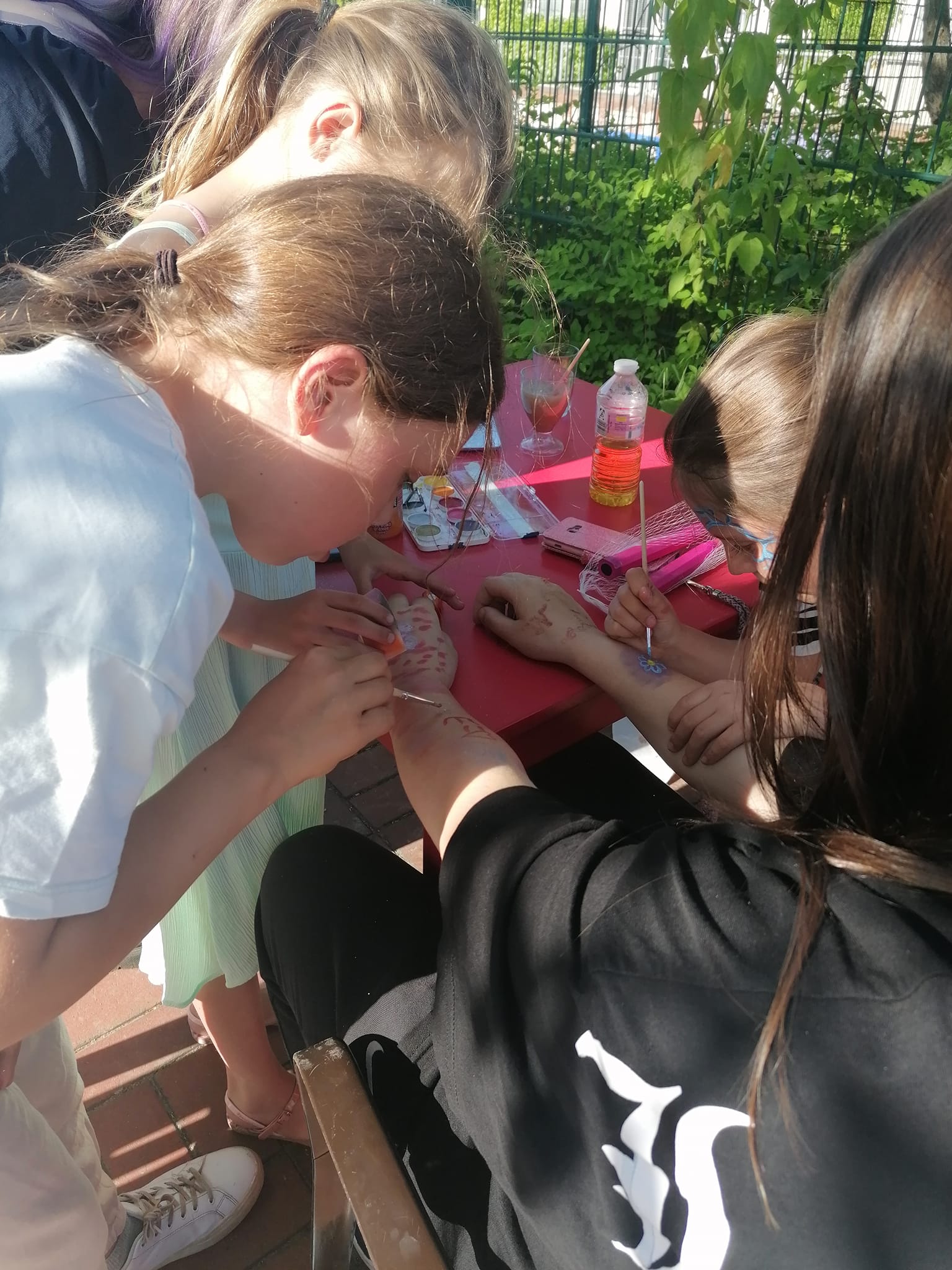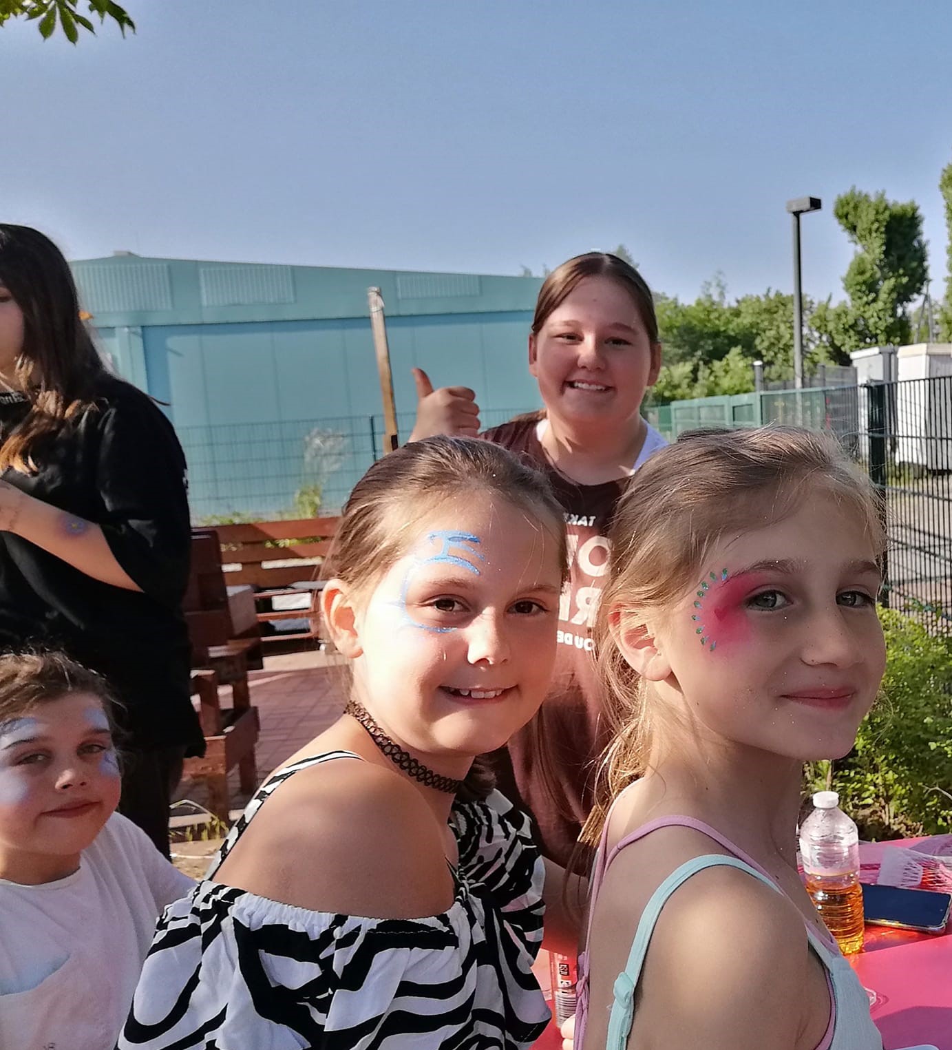 Ein besonderes Highlight des Nachmittags aber war das kreative Schminken und Bemalen. Niemand ging an diesem Tag ohne ein neues Outfit nach Hause, selbst die Betreuer*innen erhielten ein neues Gesicht 😉