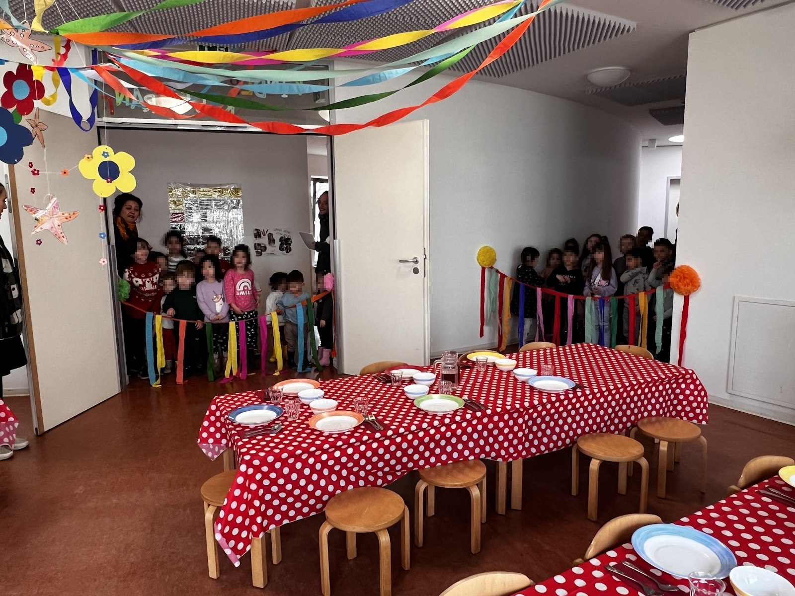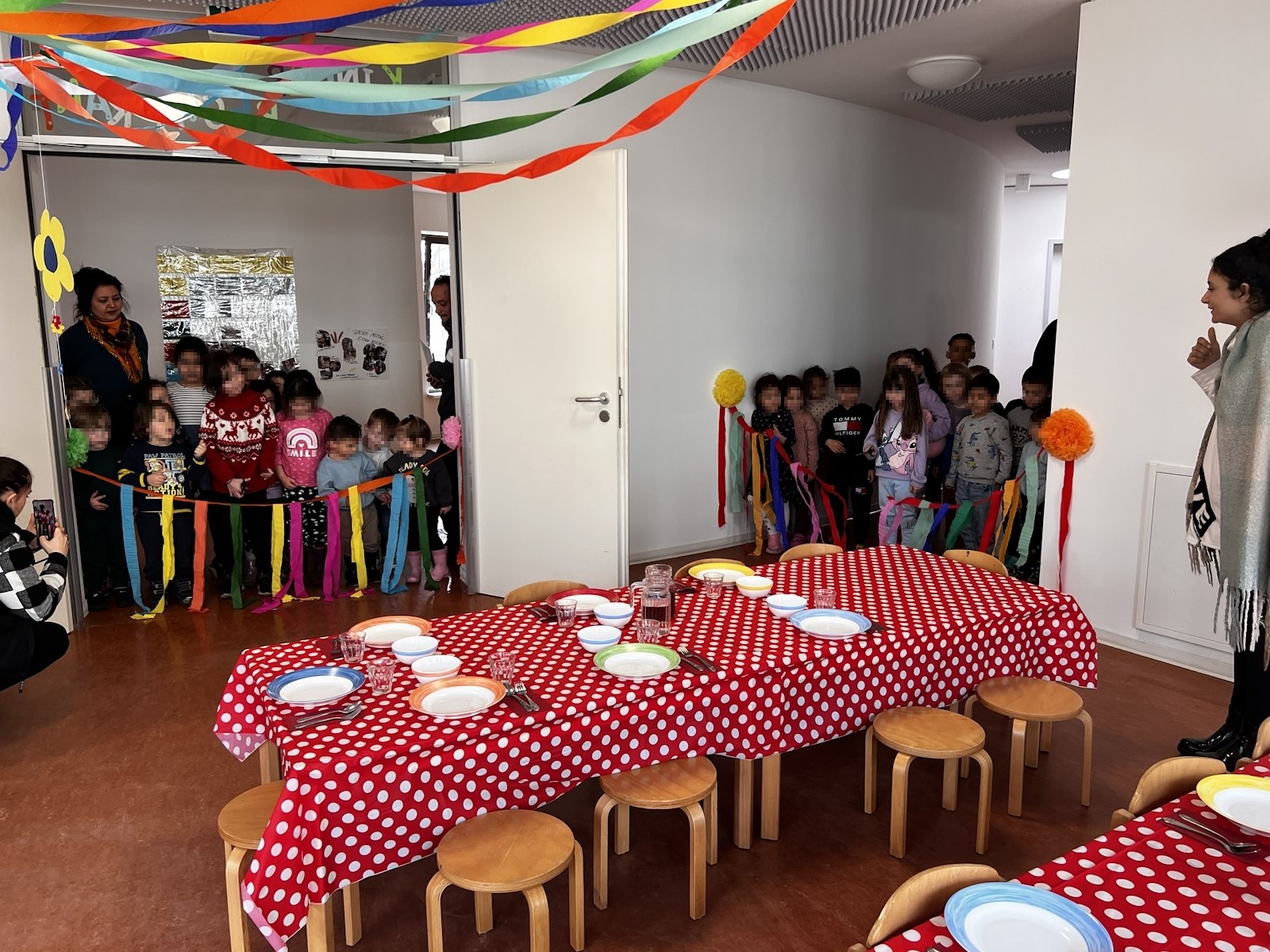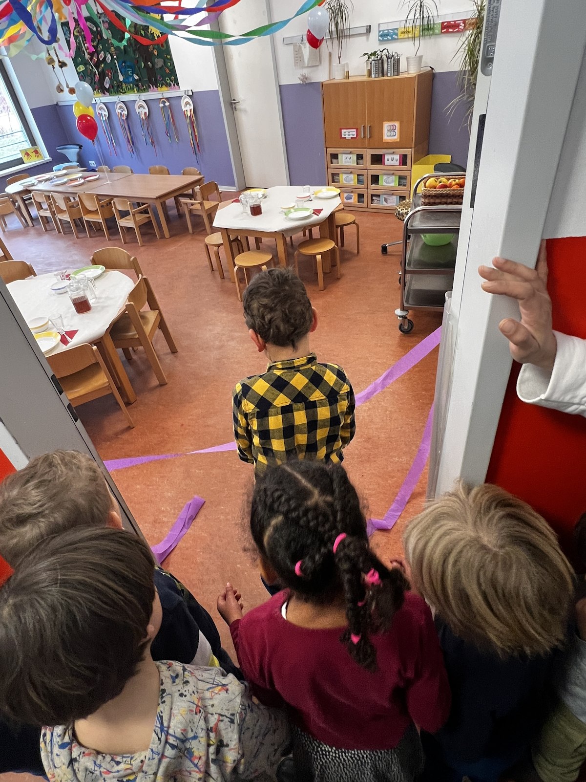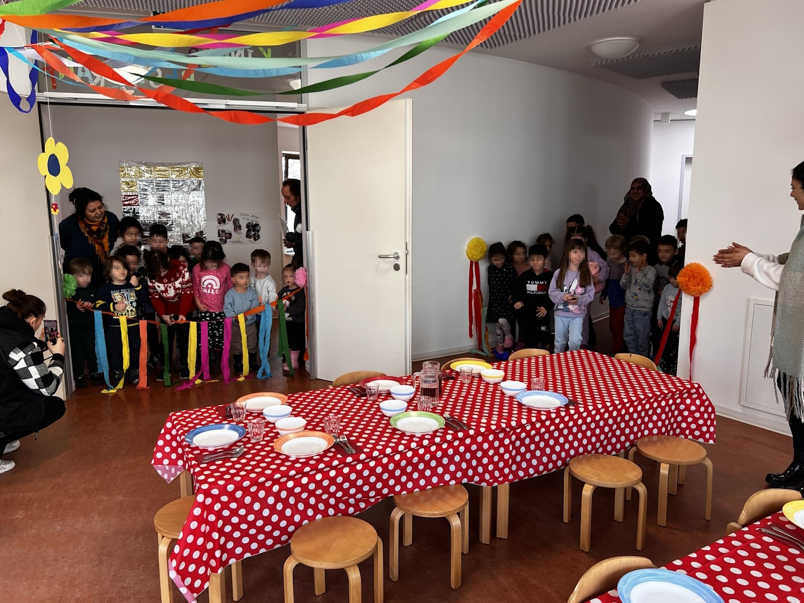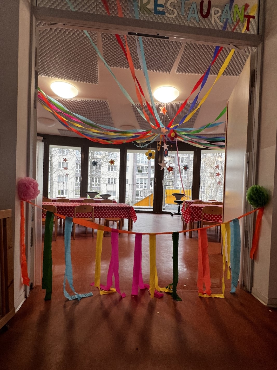 Am 11. März war es dann so weit, zur Mittagszeit versammelten sich alle Kinder vor den Restaurants, wo Bänder noch den Zugang zu den Restaurants auf beiden Etagen des Neubaus versperrten. Dann war der Moment gekommen, wie bei einer richtigen Eröffnung wurden die Bänder zerschnitten und gaben den Weg frei, dass die Kinder ihre Restaurants erobern konnten. Die Freude über die bunt gestalteten Räume und die festlich geschmückten Tische war groß, alle Kinder suchten sich einen Platz an den kleinen größeren Tischen.