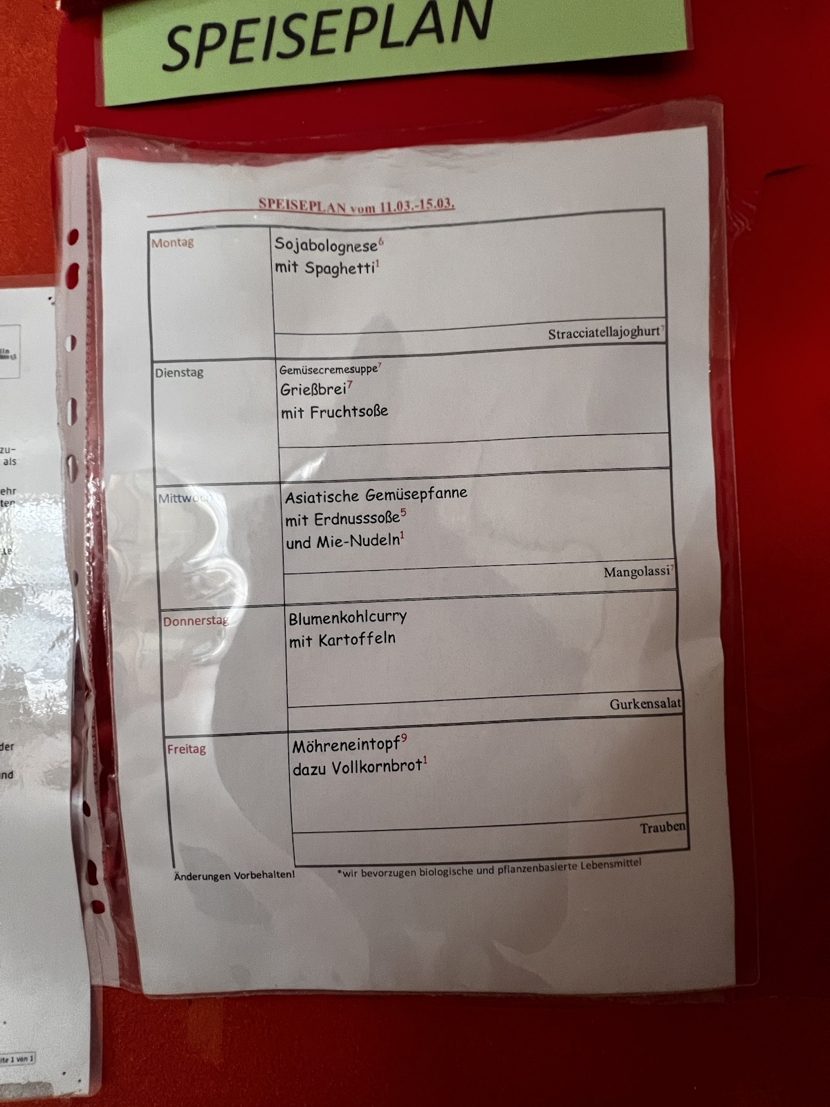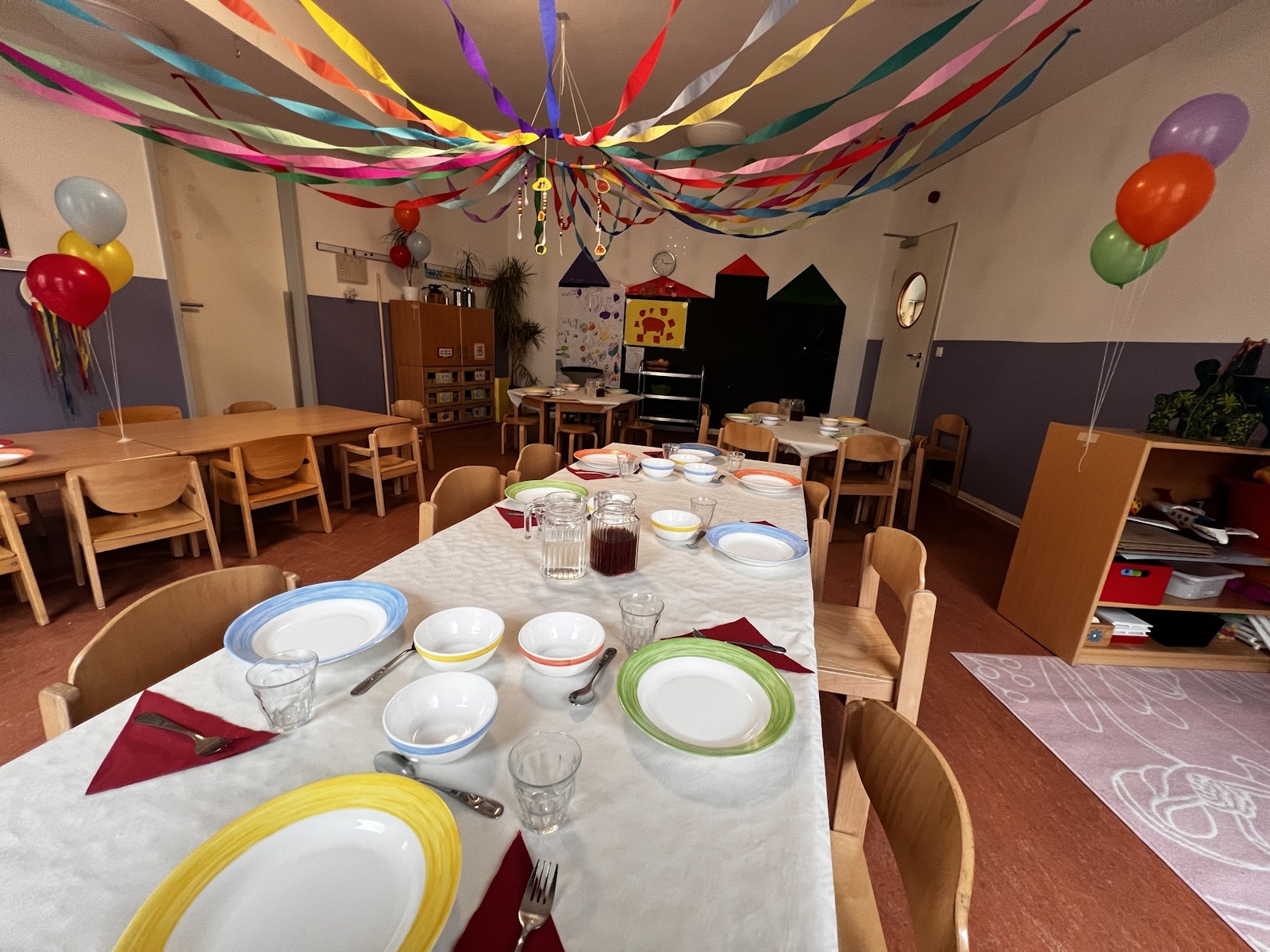 Es gab Spaghetti mit Sojabolognese und allen schmeckte es sehr gut. Gesunde Ernährung gehört zum Konzept der Kita. Und zur gesunden Ernährung gehört nicht nur ein gesundes Essensangebot, sondern auch die Atmosphäre rund ums Essen. Deshalb wurden die Restaurants hell und freundlich und bunt gestaltet, mit einem freien Blick in den Garten.