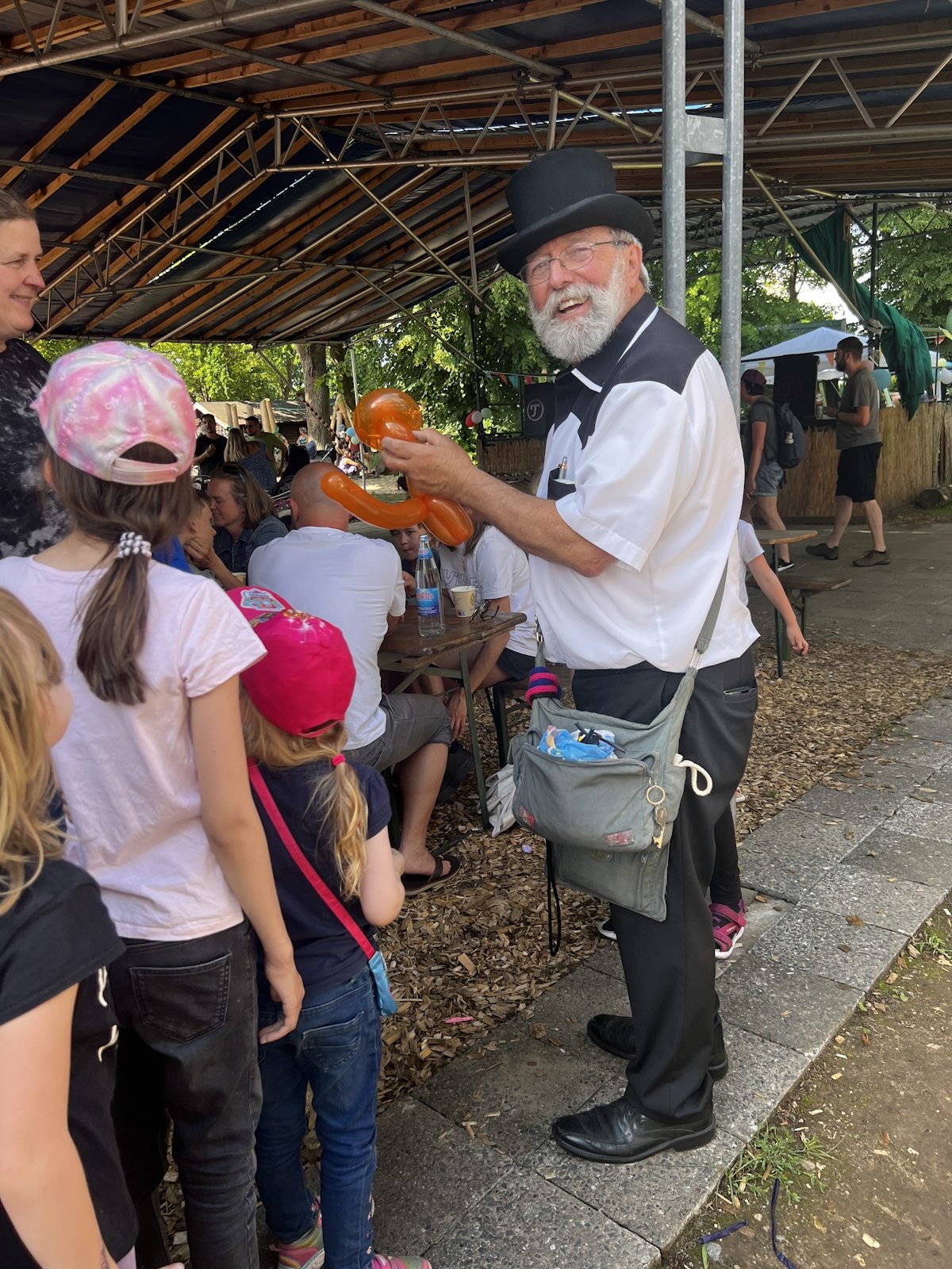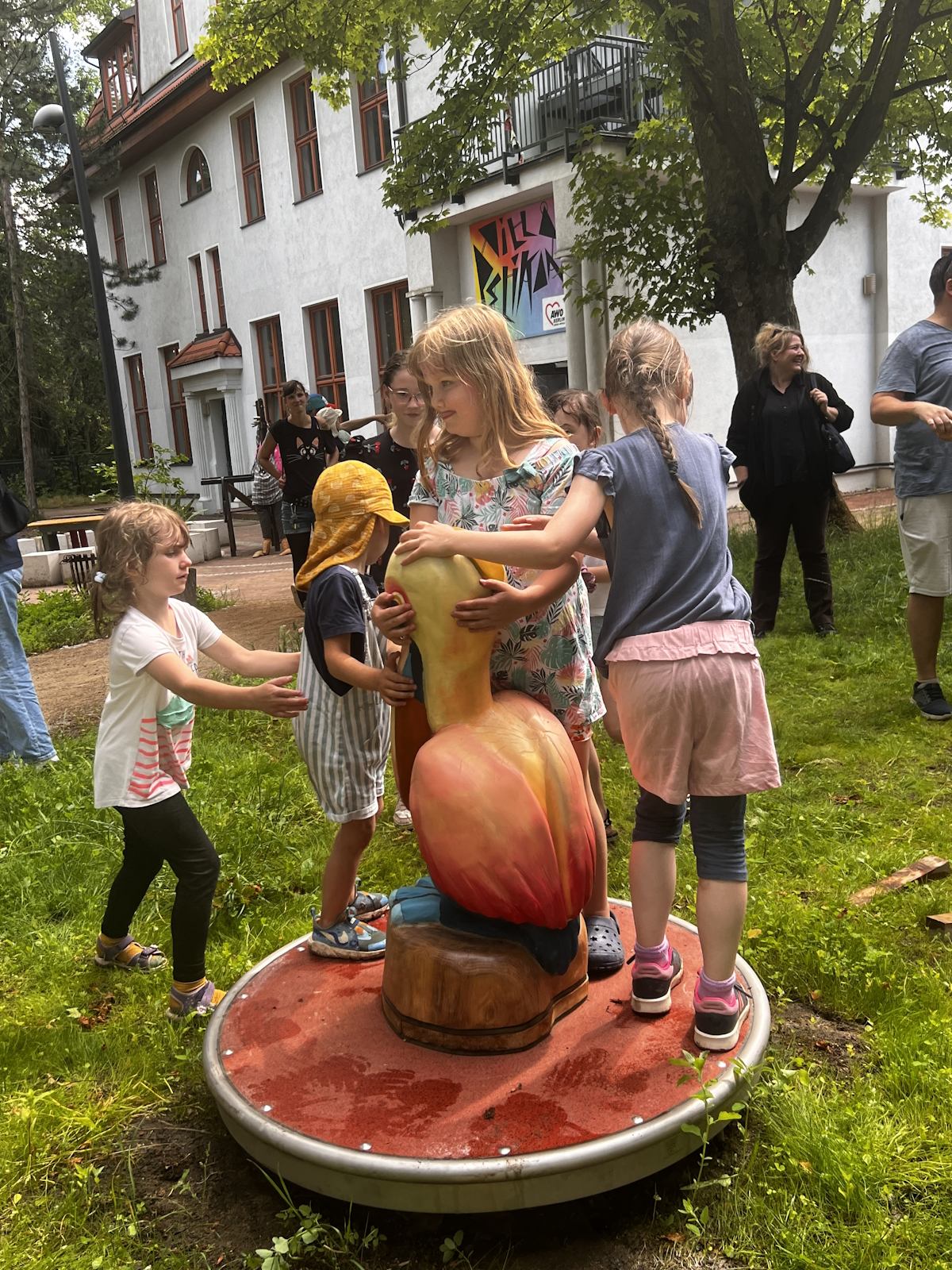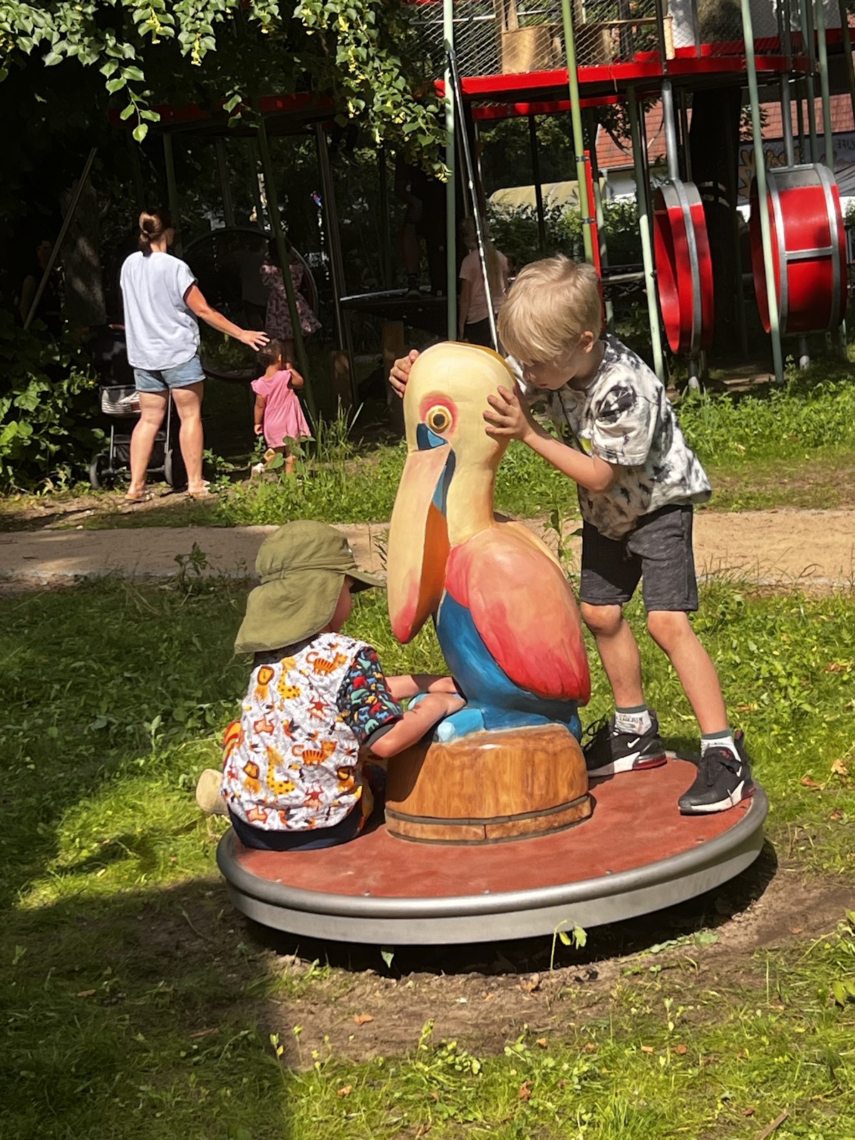 Es war auch der richtige Zeitpunkt, ein bis zuletzt noch gehütetes Geheimnis zu lüften – einen wunderschönen bunten Pelikan auf einer Drehscheibe für Kinder. Diese wurde sofort begeistert in Besitz genommen. Danach ging es weiter mit dem schönen Fest, einem bunten Programm und vielen Akteur*innen aus dem ganzen Bezirk Marzahn-Hellersdorf und der AWO Spree-Wuhle.