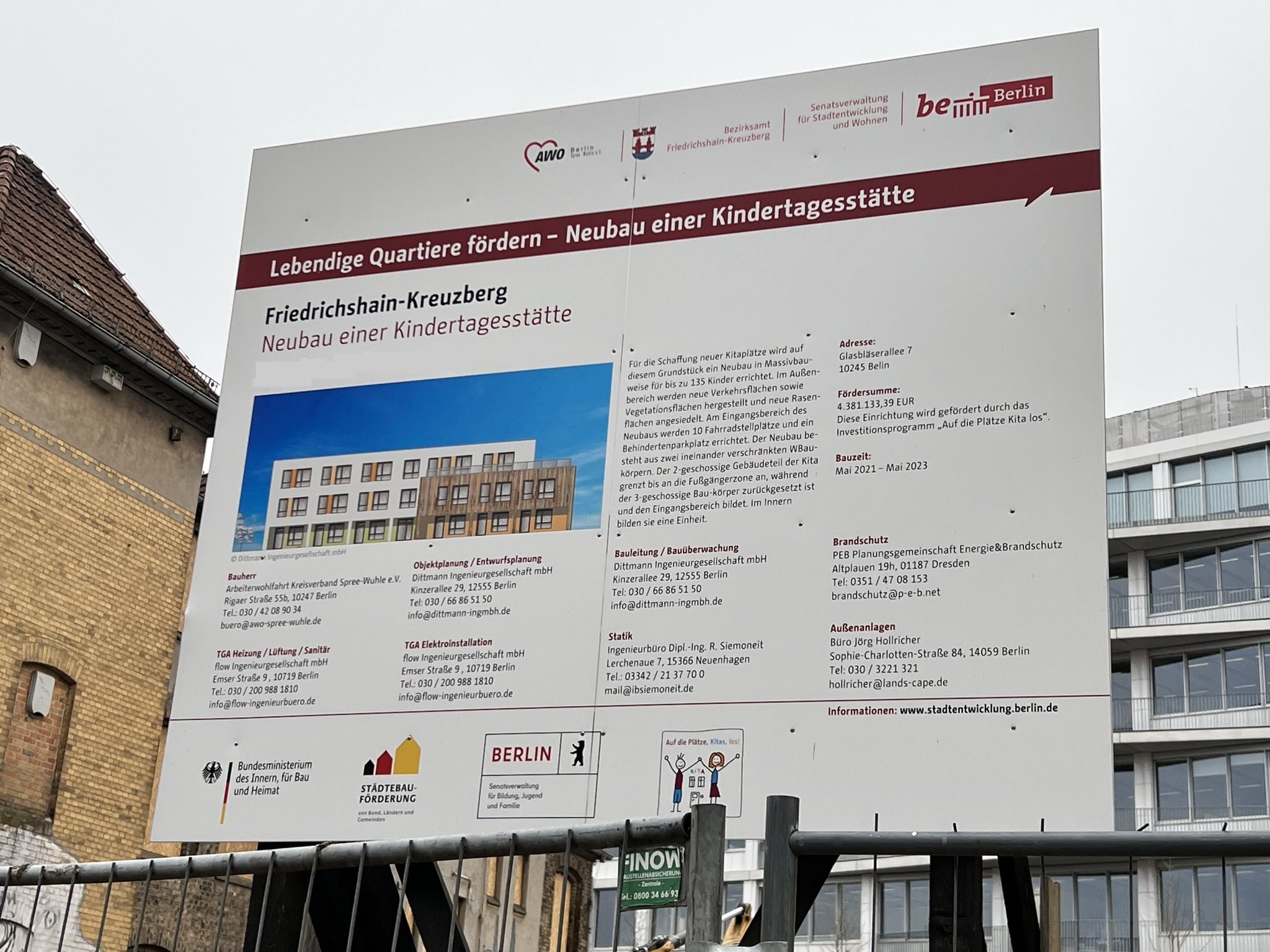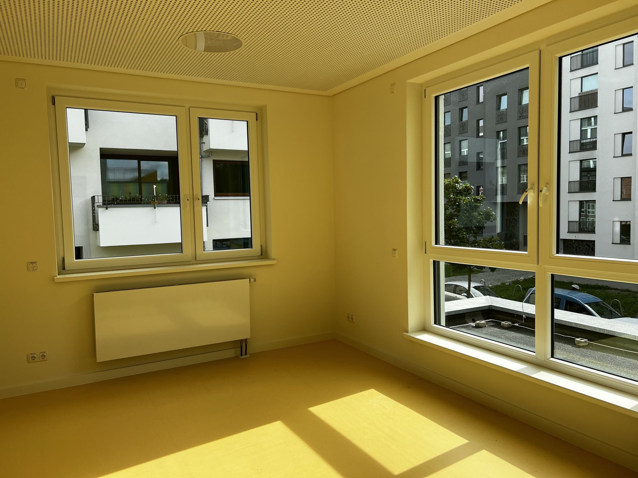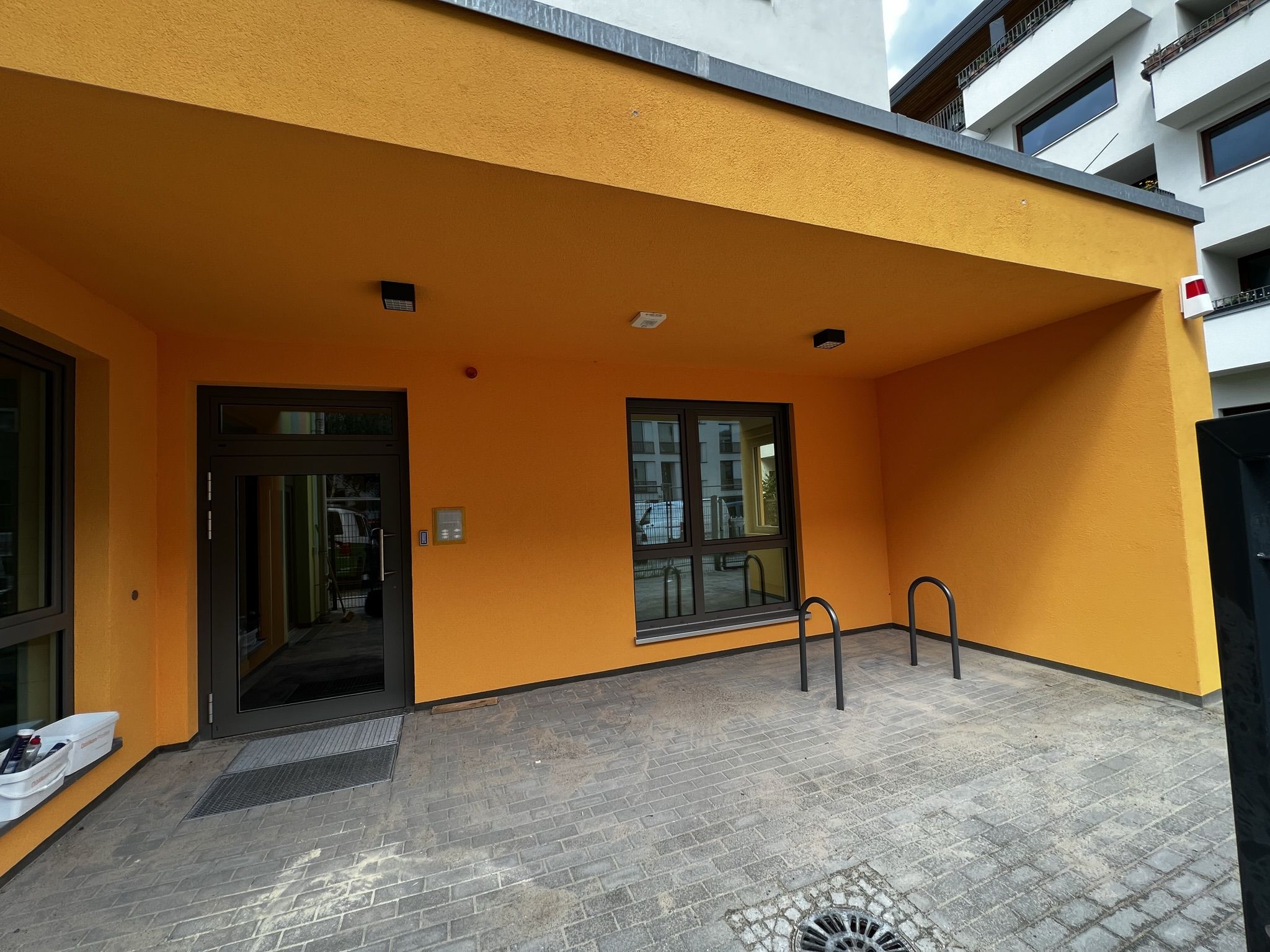 Die Kitaleiterin empfängt den Besuch in ihrem neuen, noch leeren Büro. Sie sitzt zukünftig direkt am, in warmem Orange gehaltenen, Eingangsbereich der Kita. Das große Fenster ihres Büros öffnet den Blick auf die Straße und auf Fahrradständer – Parkplatz für Friedrichshainer Elterntaxis.