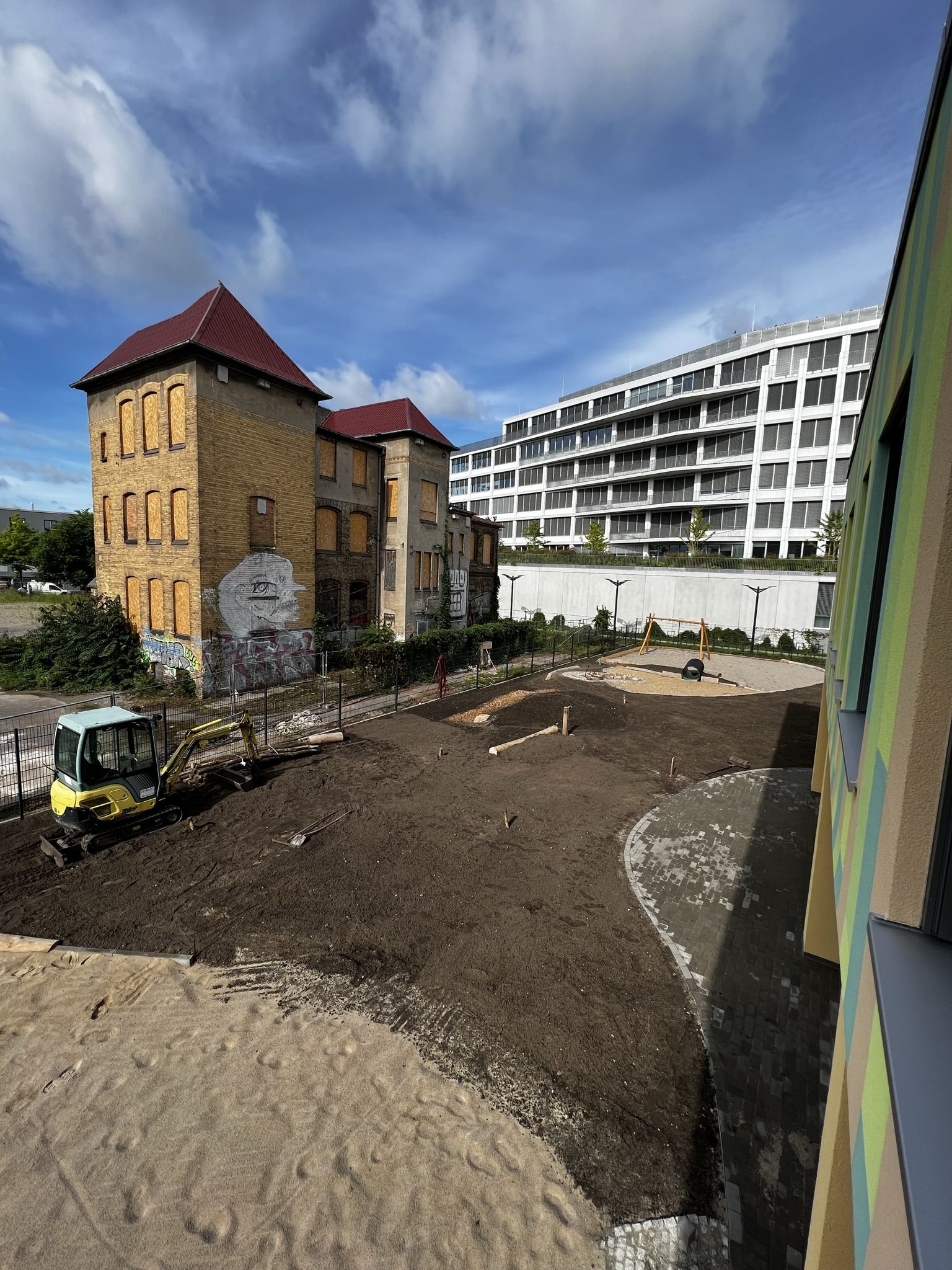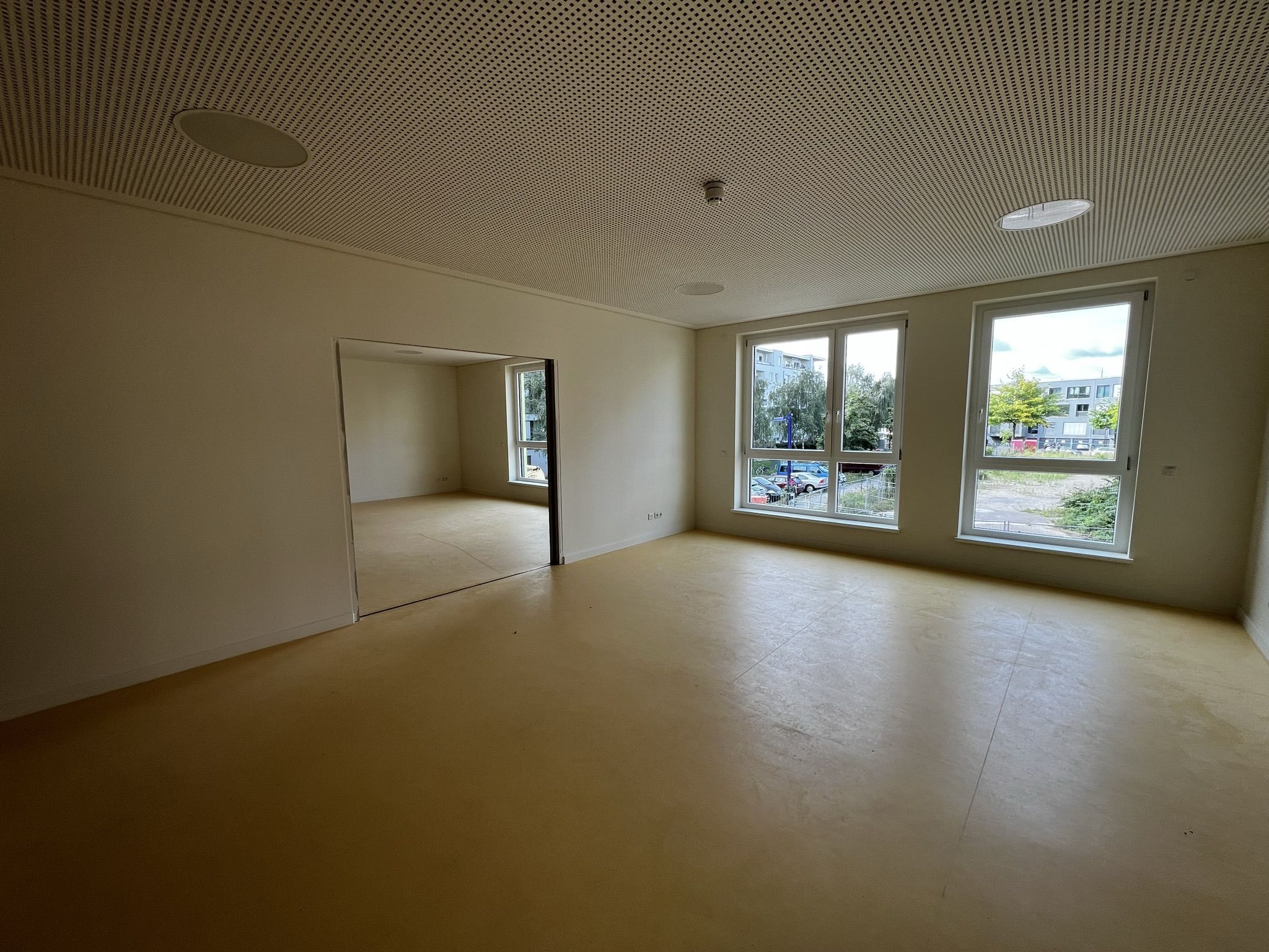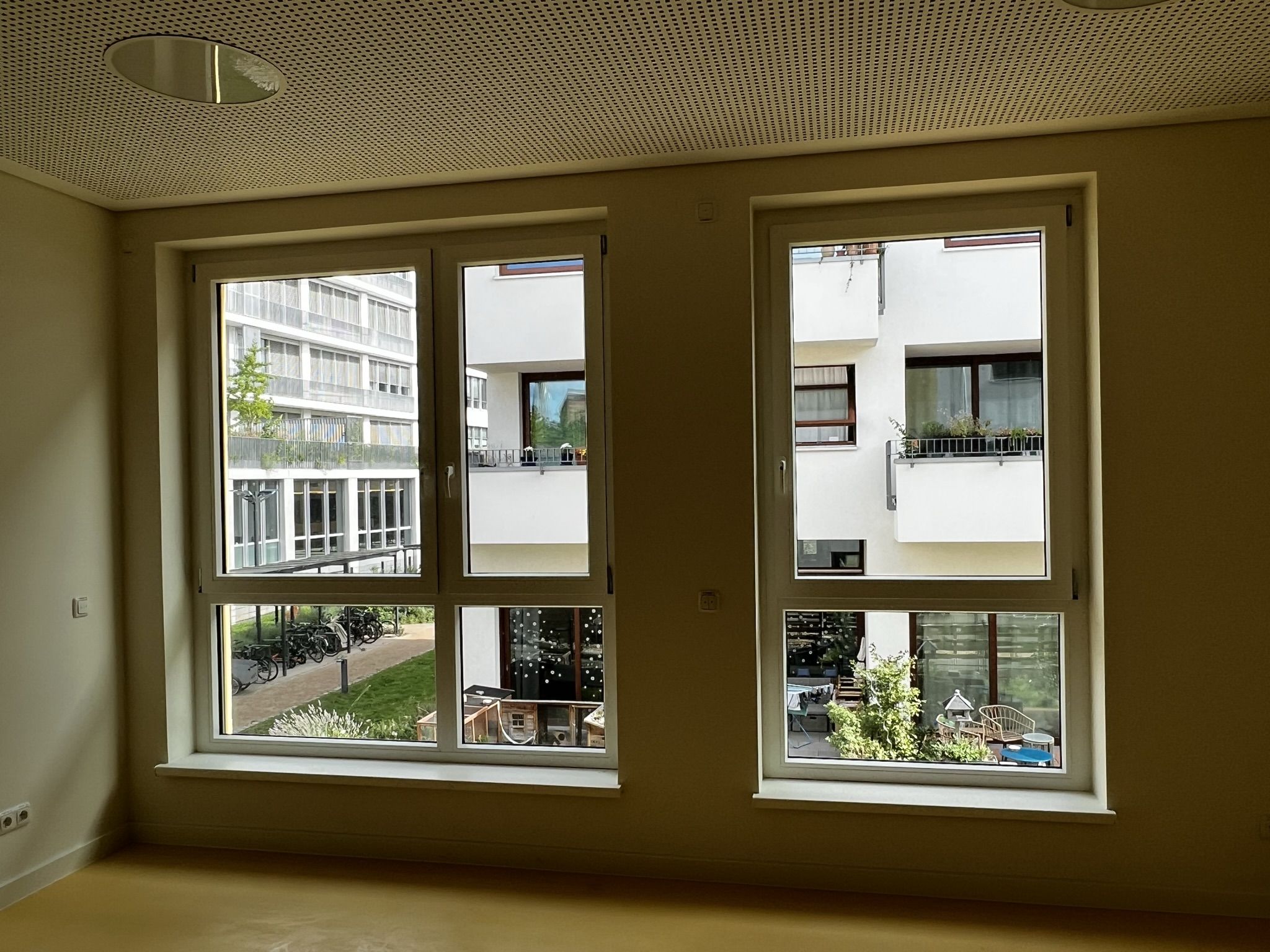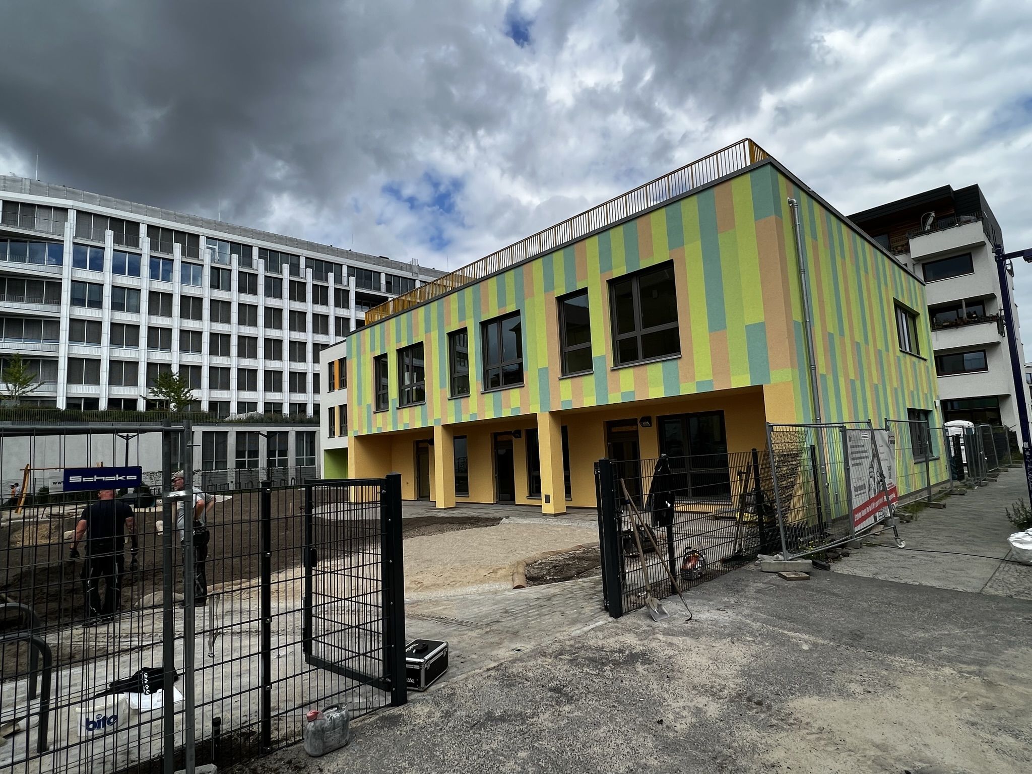 Die Kitaleiterin empfängt den Besuch in ihrem neuen, noch leeren Büro. Sie sitzt zukünftig direkt am, in warmem Orange gehaltenen, Eingangsbereich der Kita. Das große Fenster ihres Büros öffnet den Blick auf die Straße und auf Fahrradständer – Parkplatz für Friedrichshainer Elterntaxis.