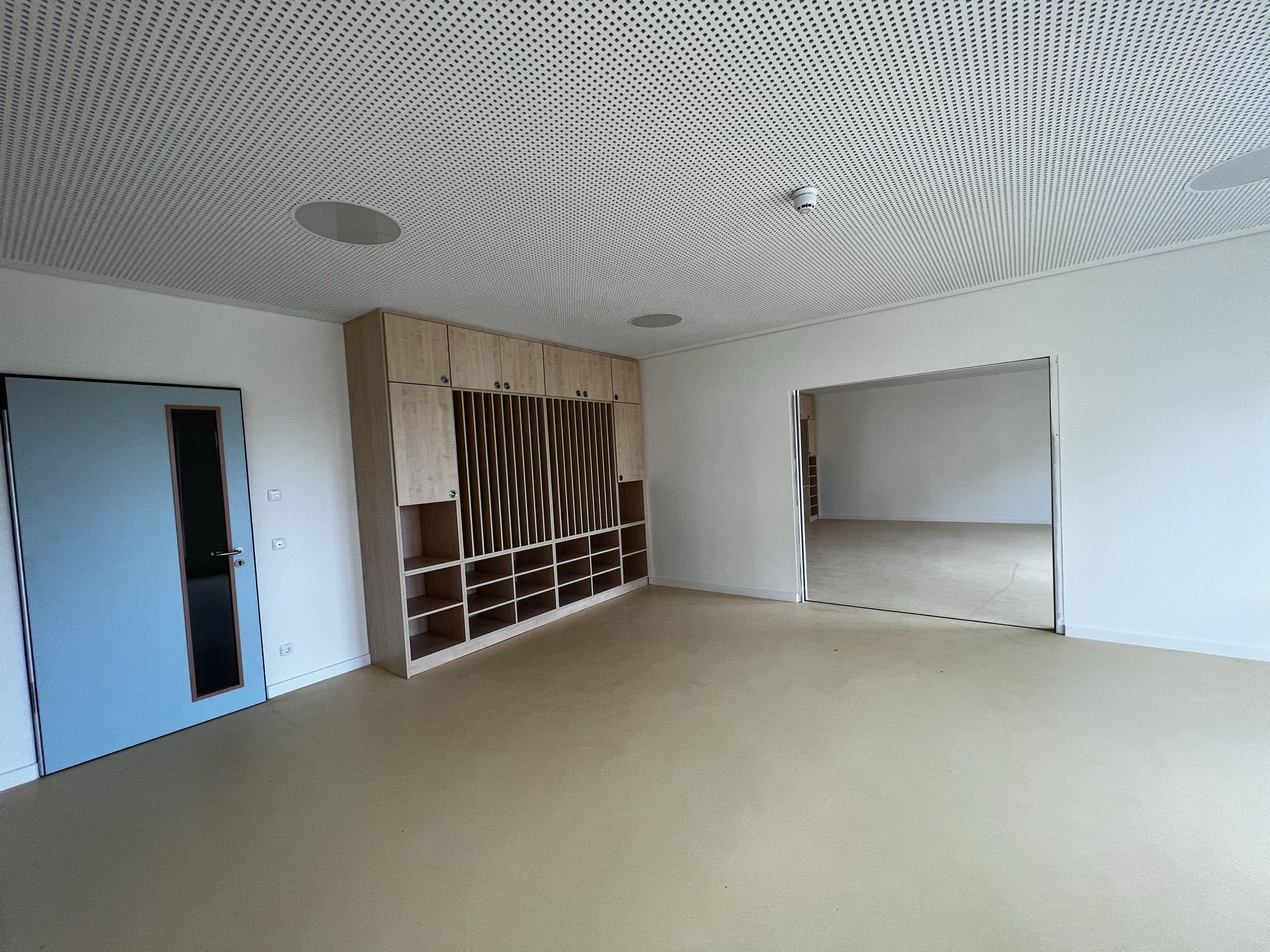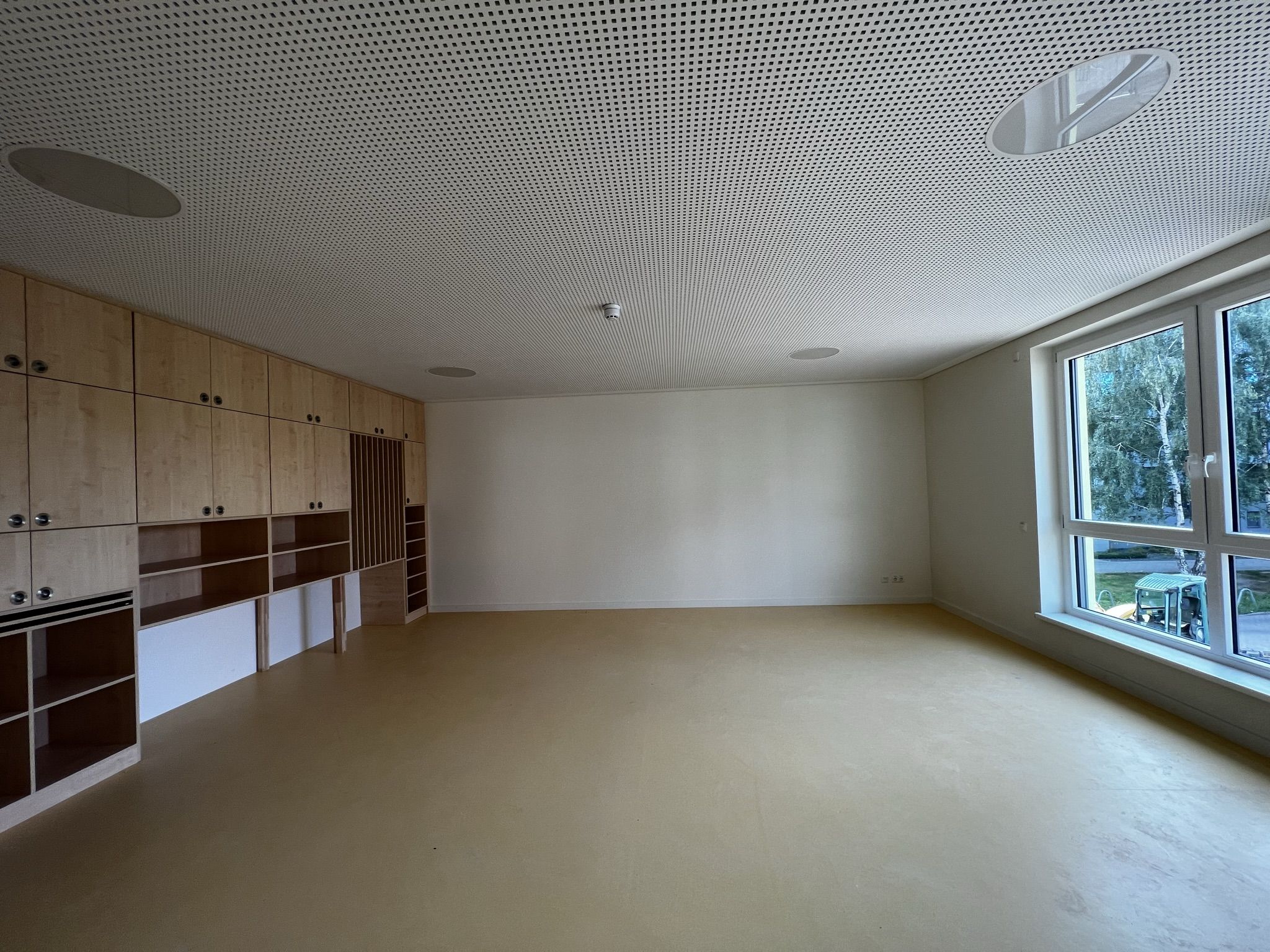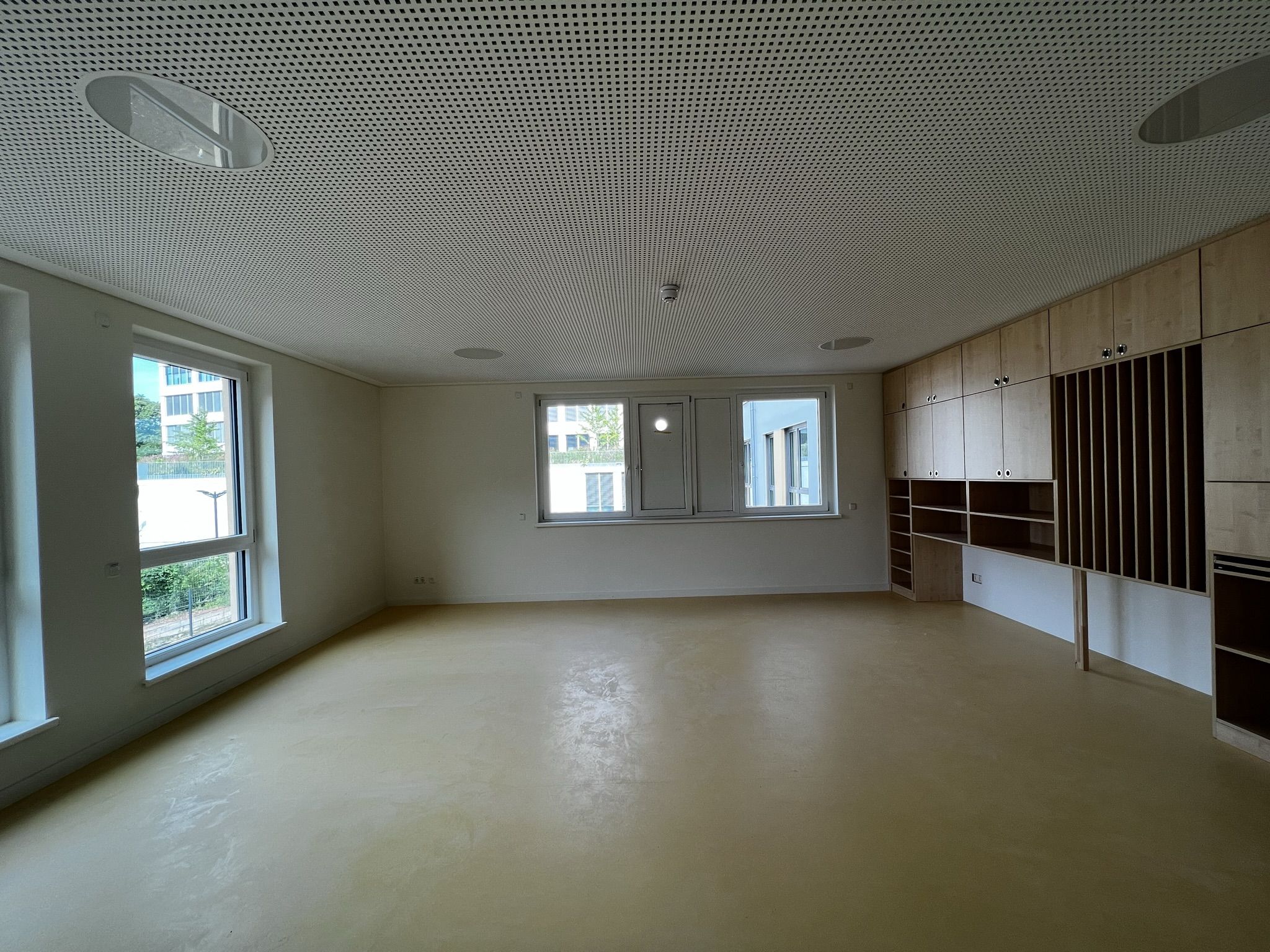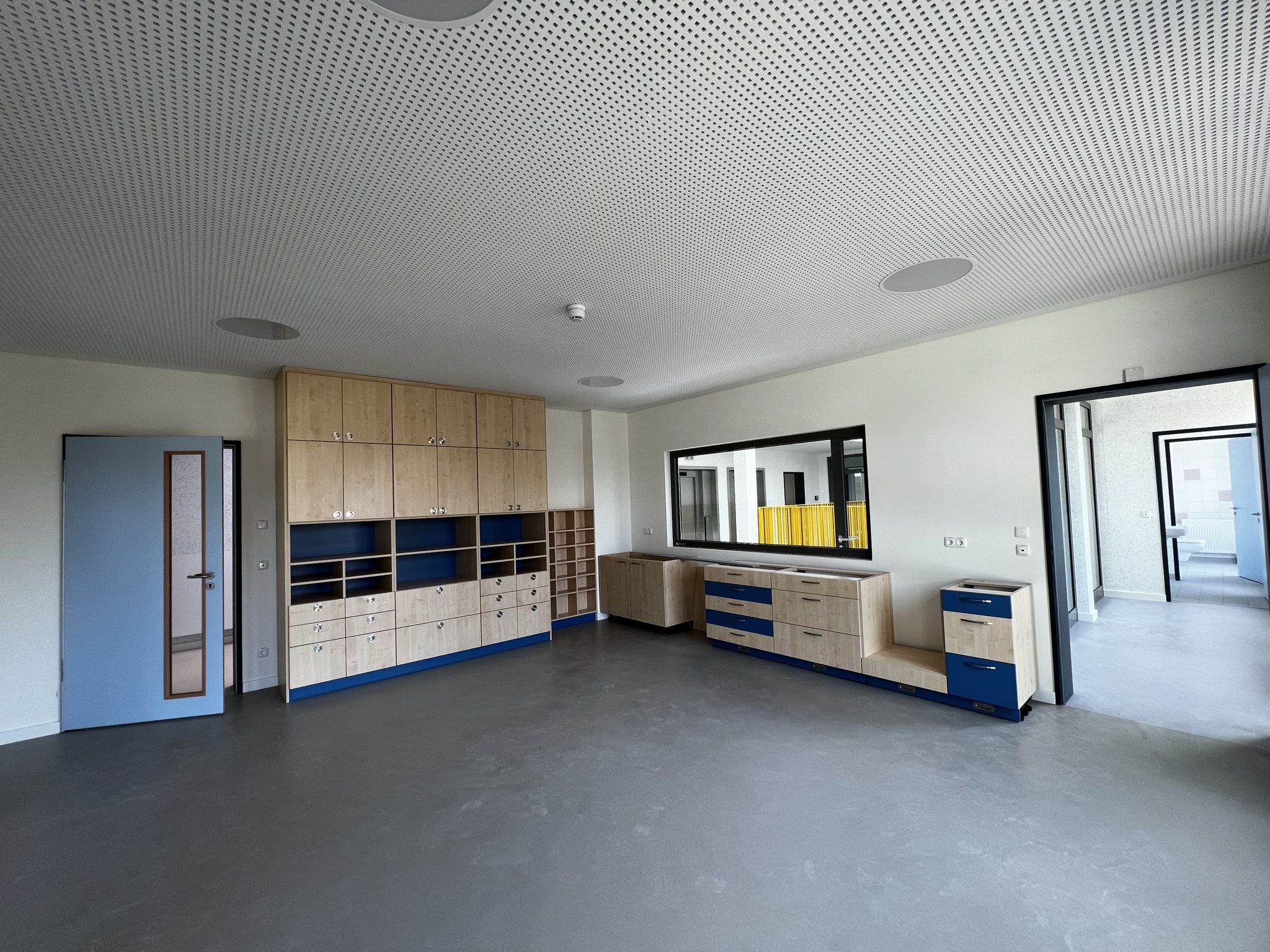 Der weitere Rundgang zeigt in der ersten Etage zunächst den Personalraum in der Morgensonne. Noch sind die Türen der Funktionsräume des offenen Konzepts mit Tesaband beschriftet und offenbaren so die zukünftige Bestimmung der Räume. Da gibt es ein Atelier, einen Bauraum, eine Bibliothek, einen Raum für kleine Forscher, eine Kinderküche und einen Theaterraum. Die maßgefertigten Möbel sind fest installiert, das andere Mobiliar und die Ausstattung werden in der nächsten Zeit folgen.