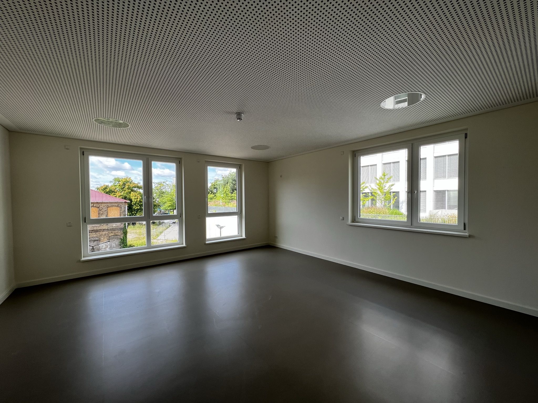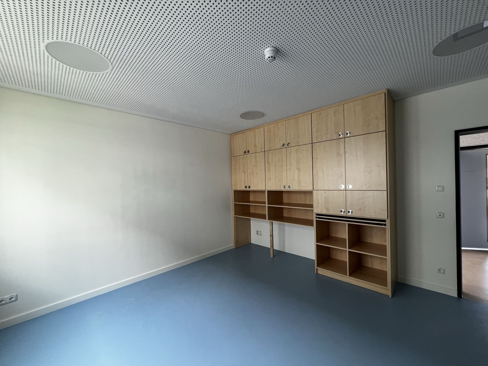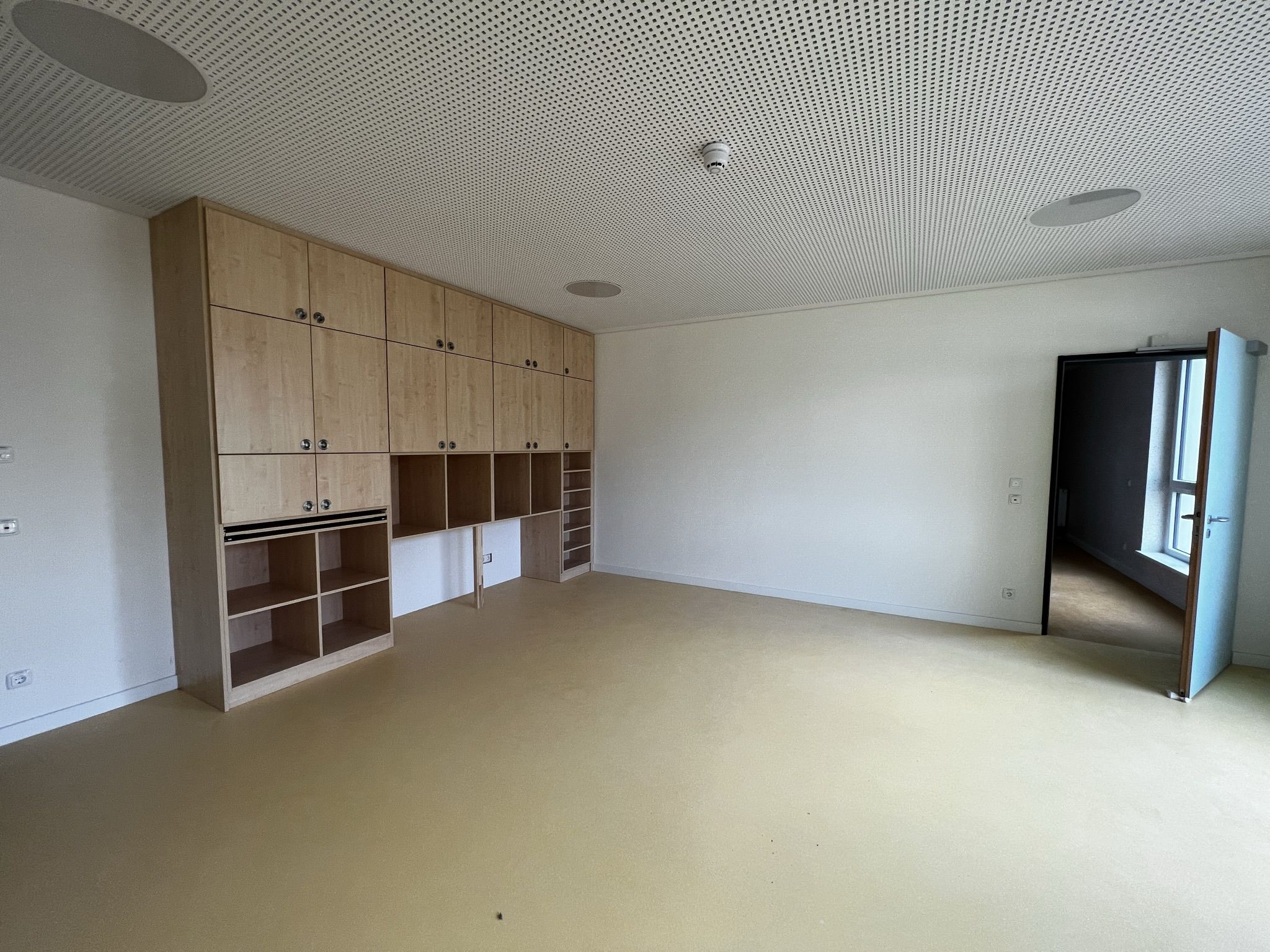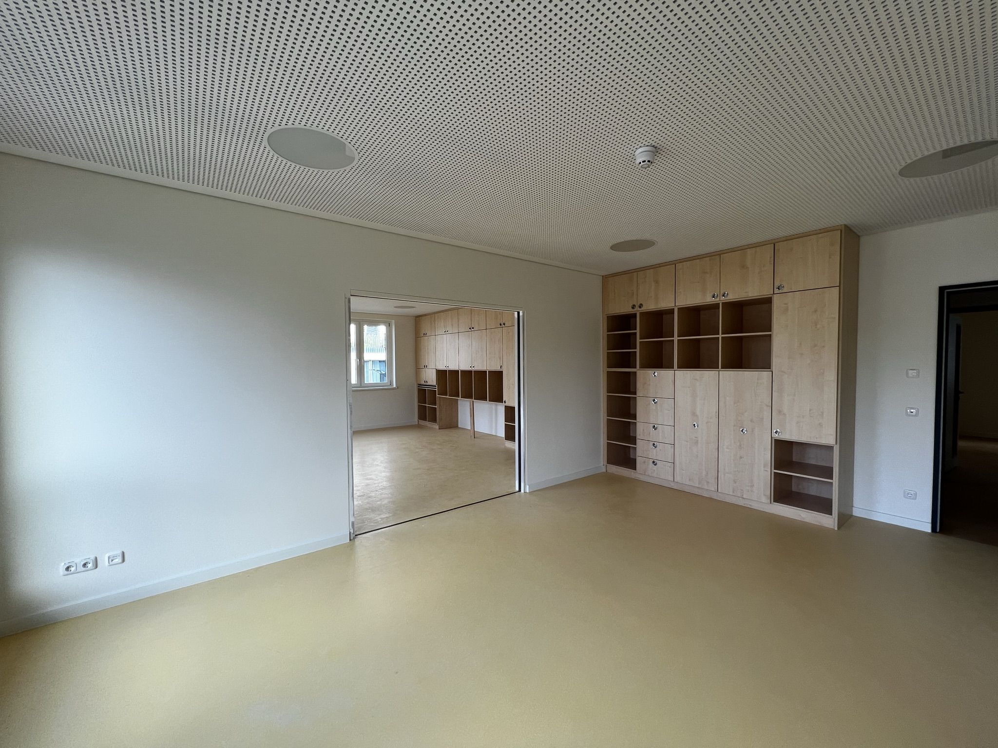 Der weitere Rundgang zeigt in der ersten Etage zunächst den Personalraum in der Morgensonne. Noch sind die Türen der Funktionsräume des offenen Konzepts mit Tesaband beschriftet und offenbaren so die zukünftige Bestimmung der Räume. Da gibt es ein Atelier, einen Bauraum, eine Bibliothek, einen Raum für kleine Forscher, eine Kinderküche und einen Theaterraum. Die maßgefertigten Möbel sind fest installiert, das andere Mobiliar und die Ausstattung werden in der nächsten Zeit folgen.