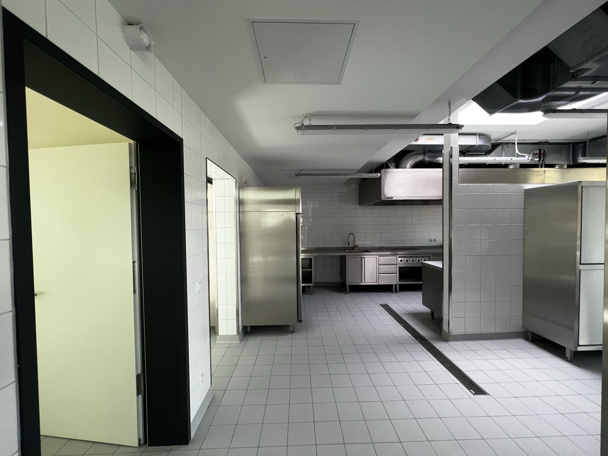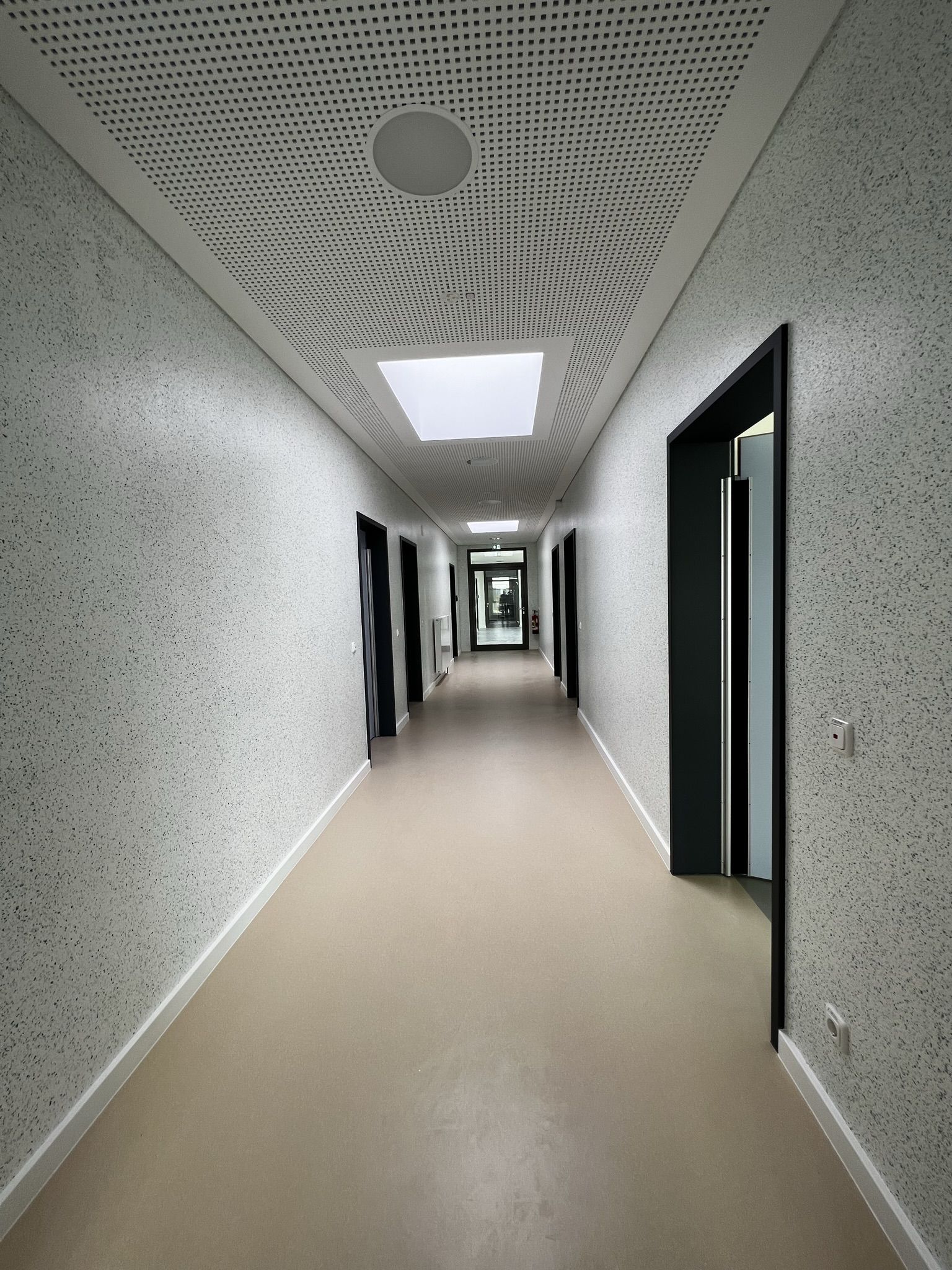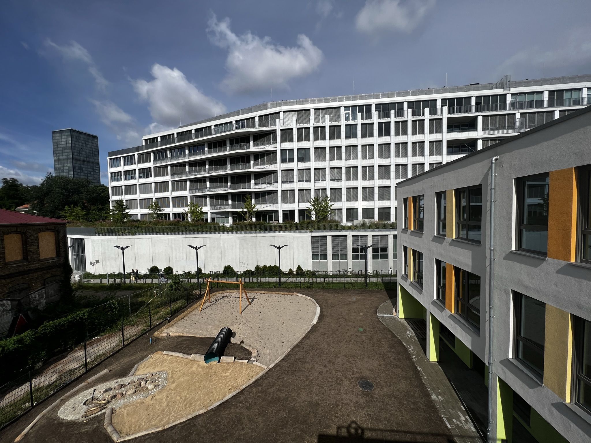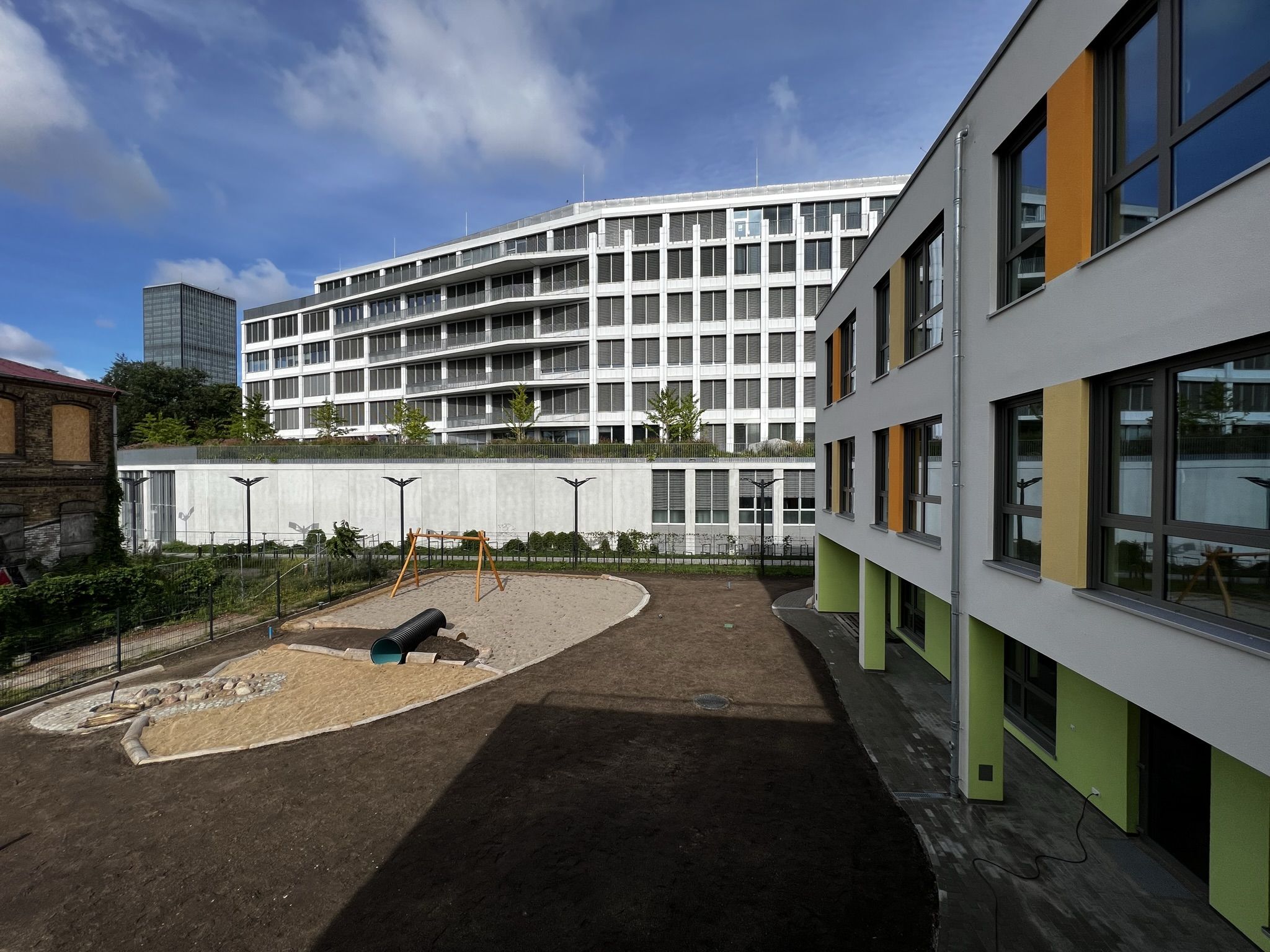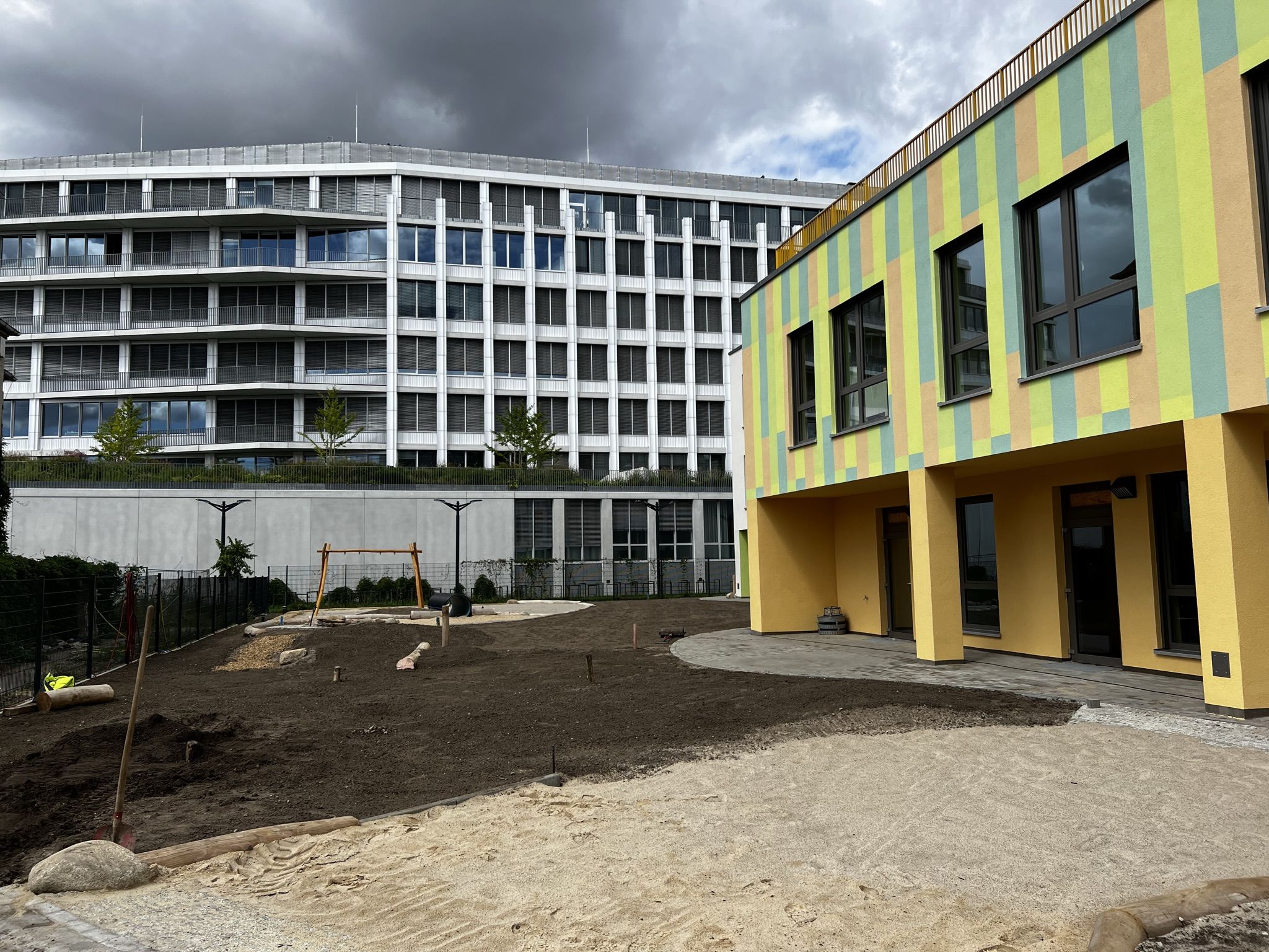 Die begeisterte und begeisternde Kitaleiterin zeigt dem neugierigen Gast voller Stolz und Vorfreude ihr neues Haus. Der Rundgang beginnt zu ebener Erde in der großzügigen Halle unterm großen Oberlicht, das die Kita hell und freundlich macht. Im Erdgeschoß werden zukünftig die Jüngsten betreut werden, mit direktem Zugang zum Garten.