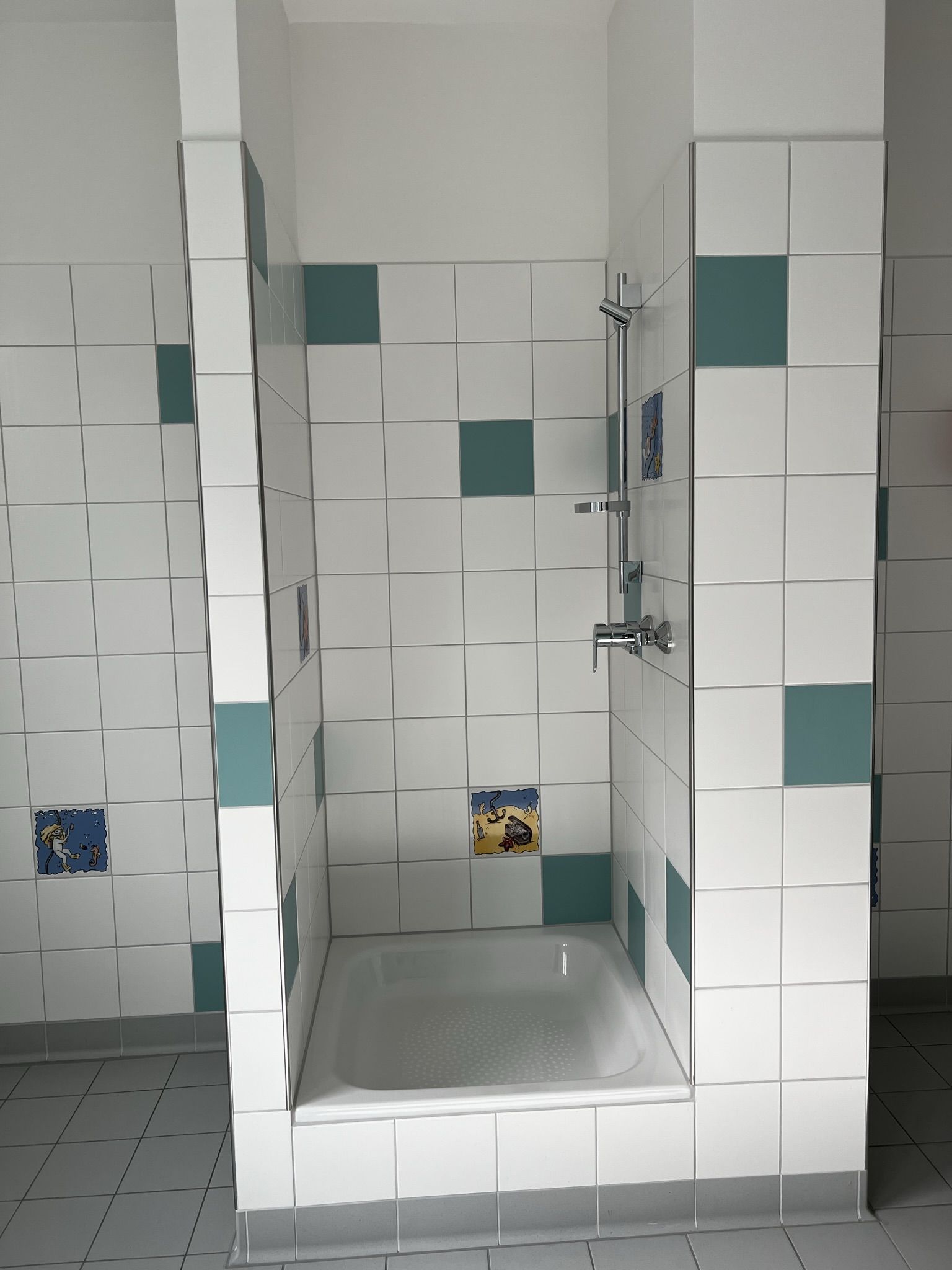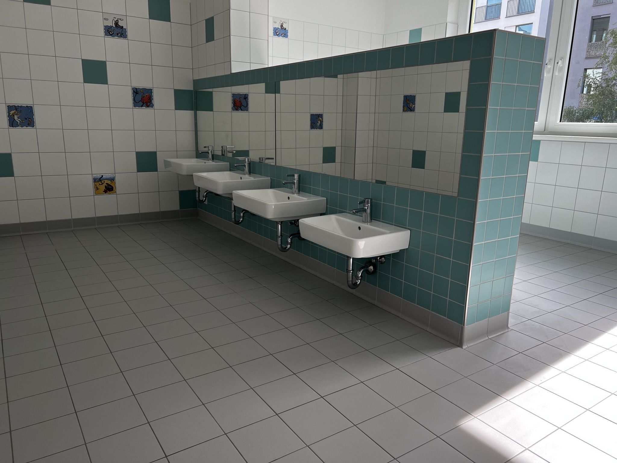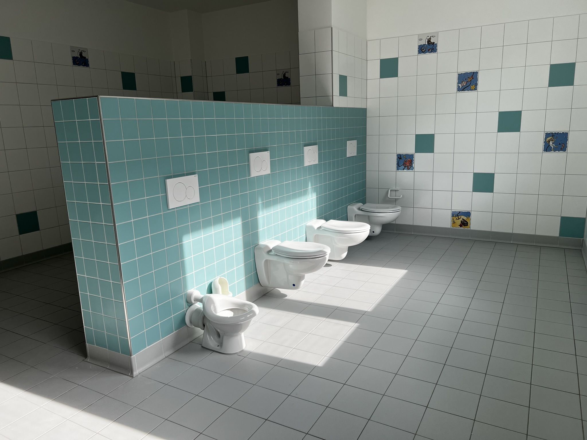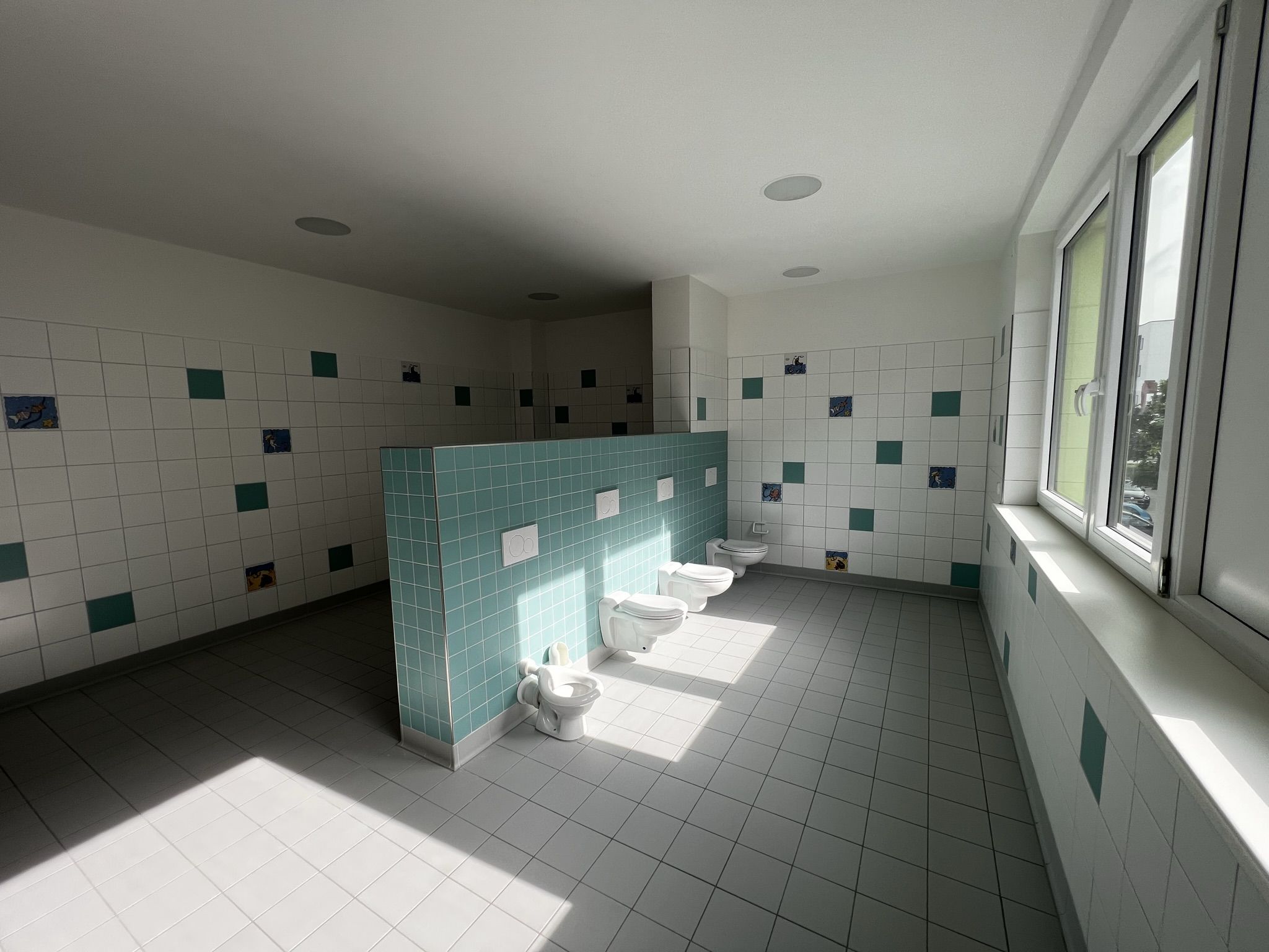 Auch die Bäder und Toiletten sind großzügig und kinderfreundlich ausgestattet, warten auf  Vollendung, der Sichtschutz fehlt noch.