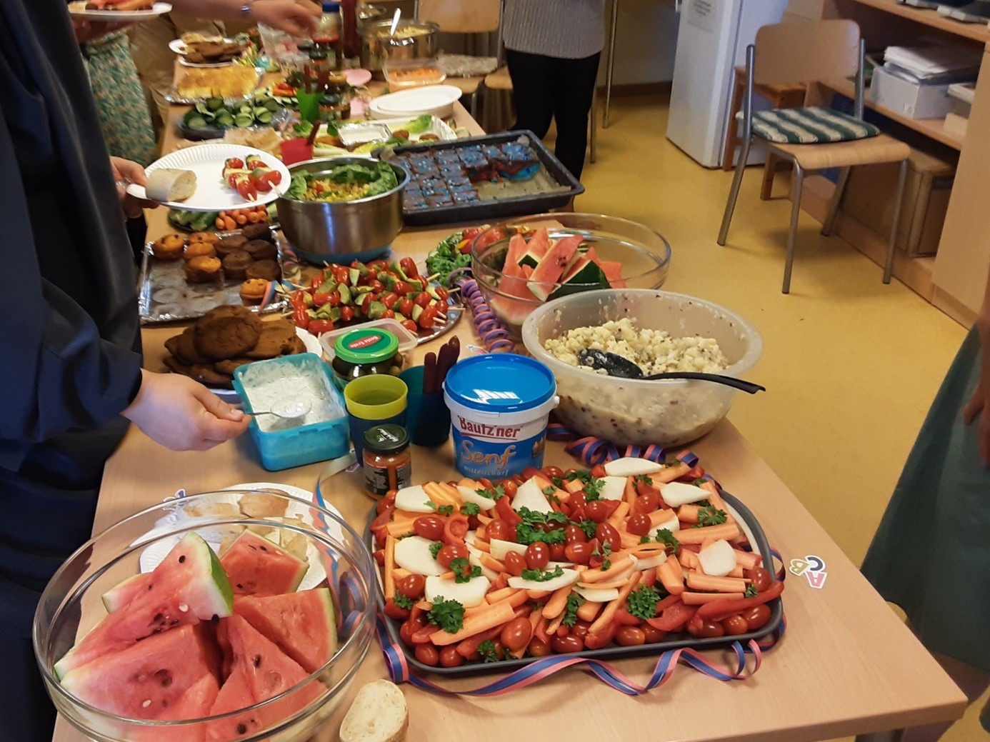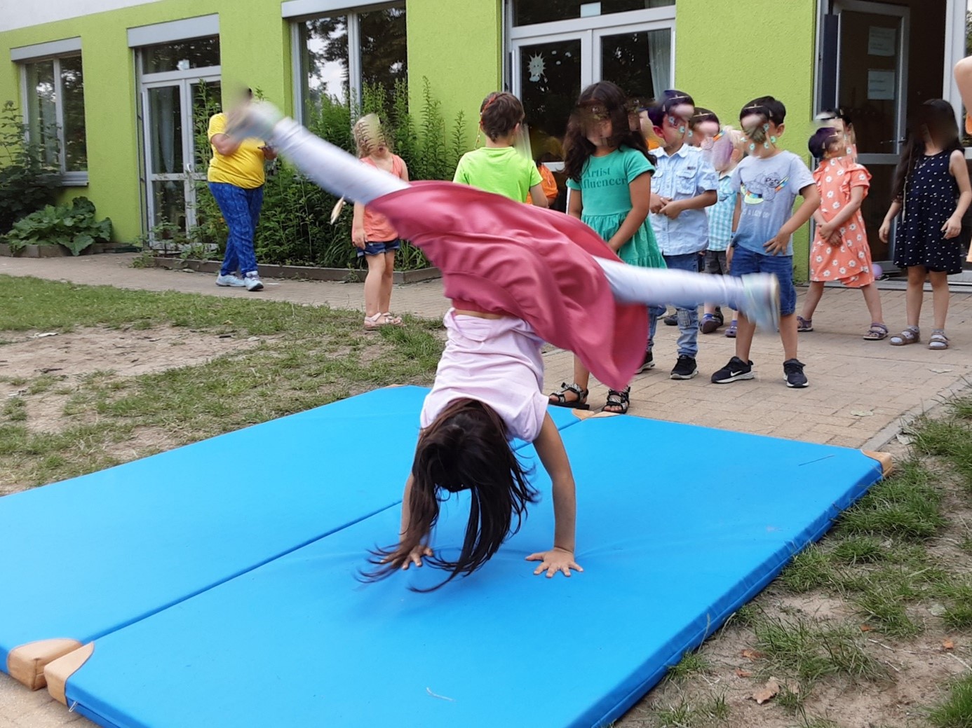 Für die Familien hatten die Einschüler schon lange vorher eine aufregendes Programm mit Akrobatik, Tanz und Gesang geübt, dass sie nun begeisterten Eltern und Großeltern vorführten. Bei der Übergabe der Abschlussgeschenke durch die Erzieher*innen gab es große strahlende Augen bei den Kindern und Familien. Zur Feier des Tages gab es ein leckeres und großes Buffet, welches die Eltern hergerichtet haben. Zum Abend hin verabschiedeten die Kinder ihre Eltern und dann konnte die Kitaübernachtung starten. Zuerst ging es auf eine abenteuerliche Schatzsuche und im Anschluss bei einer Nachtwanderung durch die Kita wurde geschaut, was nachts eigentlich alles so passiert in der Kita. Am Ende des Tages vielen schweren Augen zu und die Kinder kamen in Ihren Zelten im Bewegungsraum zur Ruhe.