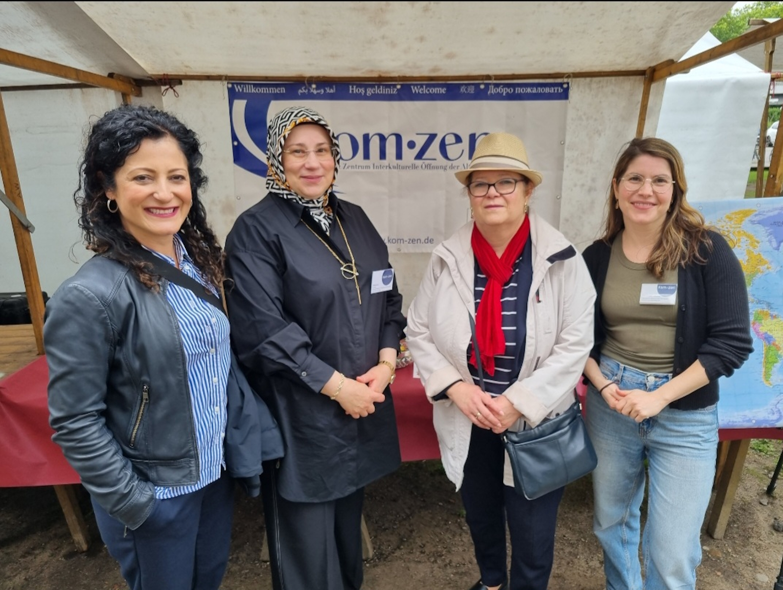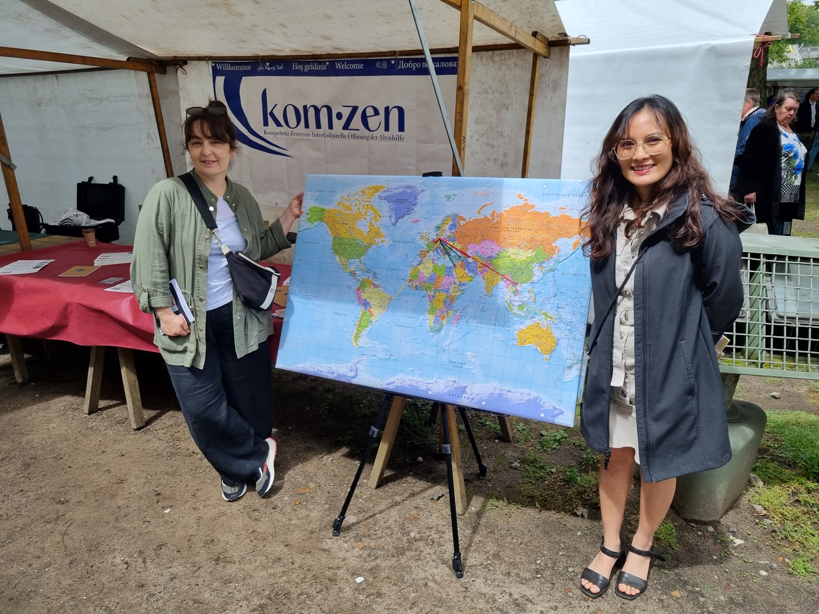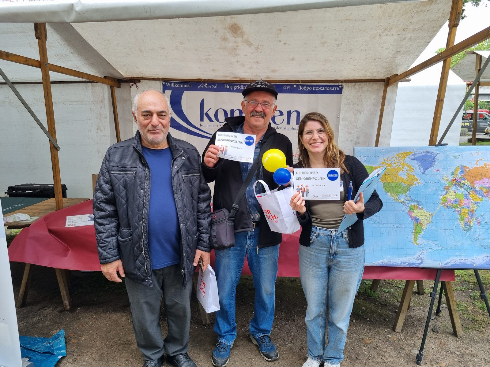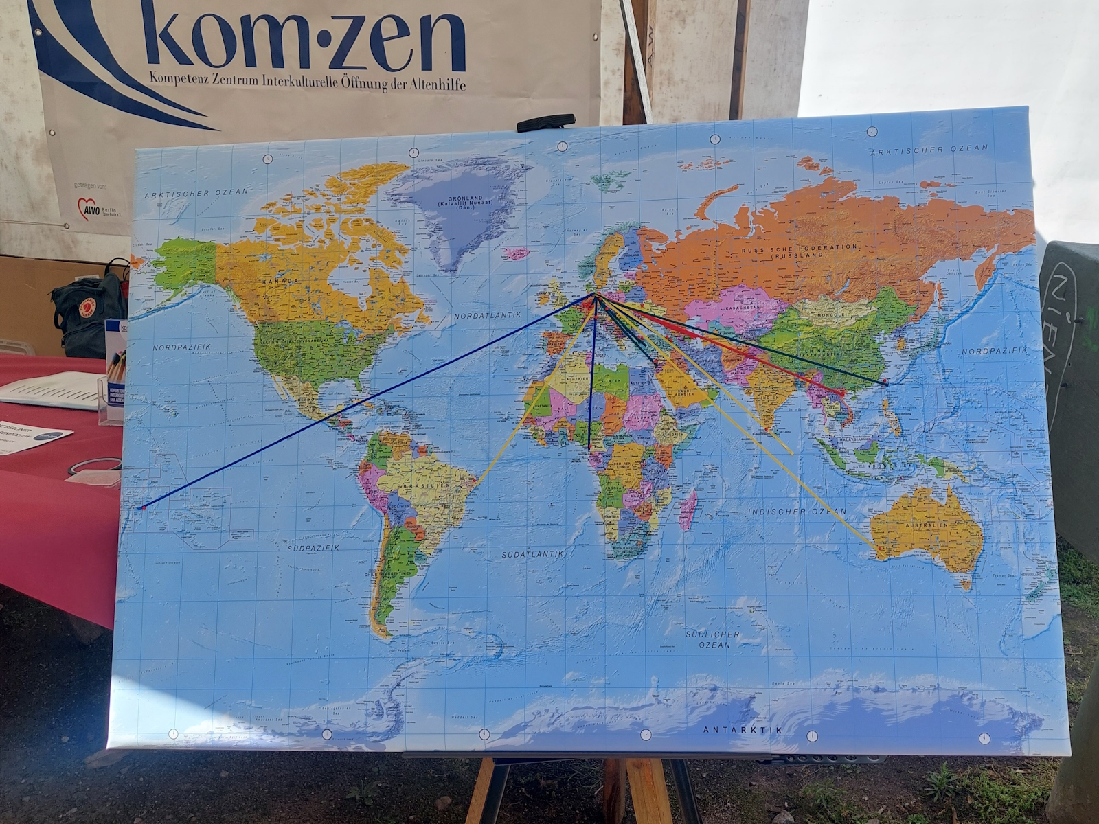 Das Kom-zen hatte für seinen Stand eine Weltkarte vorbereitet, um mit den Besucher*innen eine Verbindung zwischen der jeweiligen Herkunftsregion (Hintergrund) und Berlin herzustellen. Für diesen „Hingucker und Türöffner“ gab es viel lobende Anerkennung. Jedoch gehörten leider ältere Migrant*innen nicht sehr zahlreich zu den Besucher*innen der Eröffnung der Seniorenwoche. Eine geplante kleine und anonyme Bedarfsermittlung mit der Zielgruppe der älteren Migrant*innen konnte deshalb nicht erfolgreich durchgeführt werden.