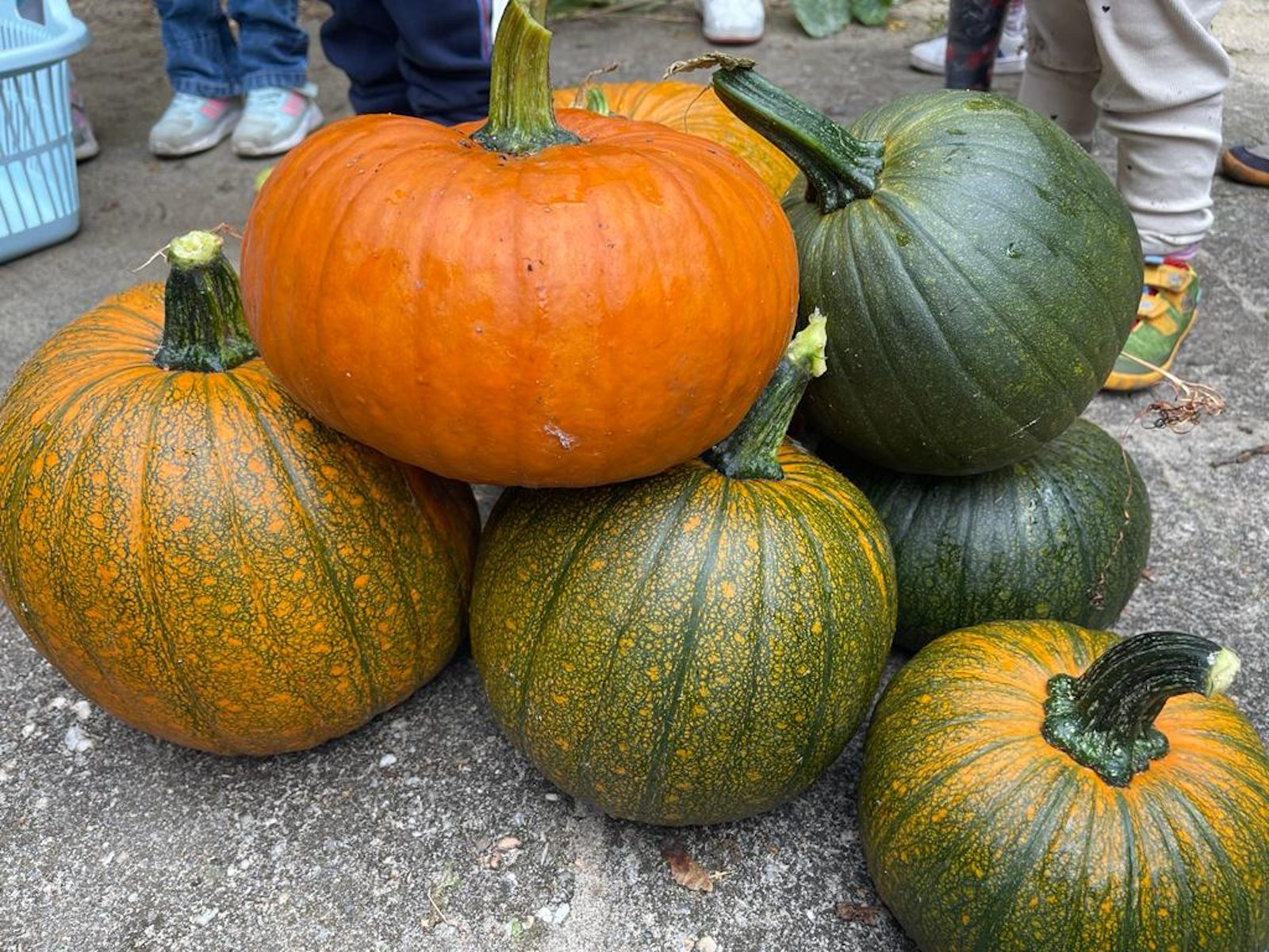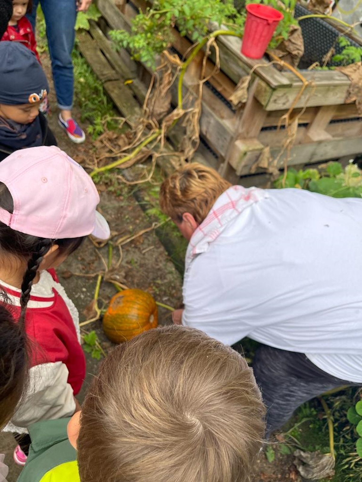 Die Köchin und die Kinder ernteten mit vollem Körpereinsatz all die tollen und schweren Kürbisse, Kinder halfen mit, die Kürbisse in die Küche zu tragen.