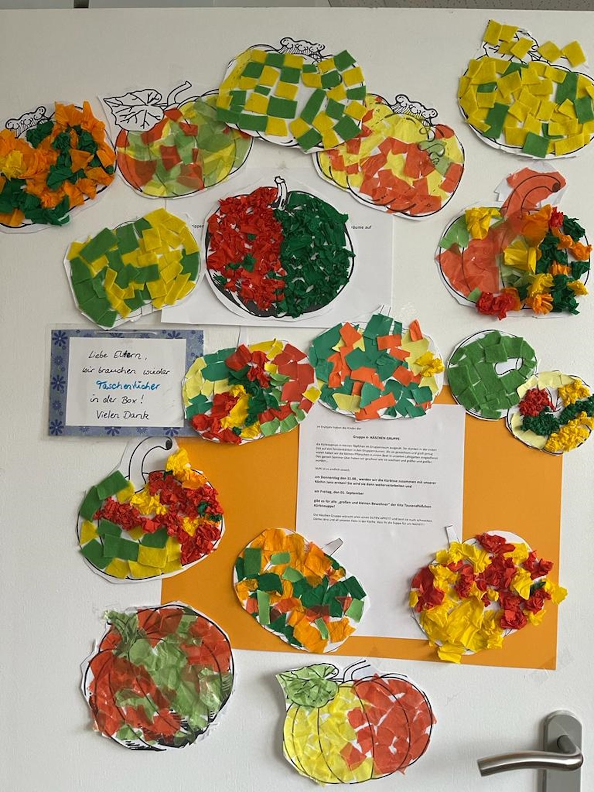 Ein kleines Kürbisprojekt half, die Zeit bis zur Ernte zu überbrücken, es wurde gemalt, geschnippelt und gebastelt und richtig viel rund um den Kürbis dazugelernt.