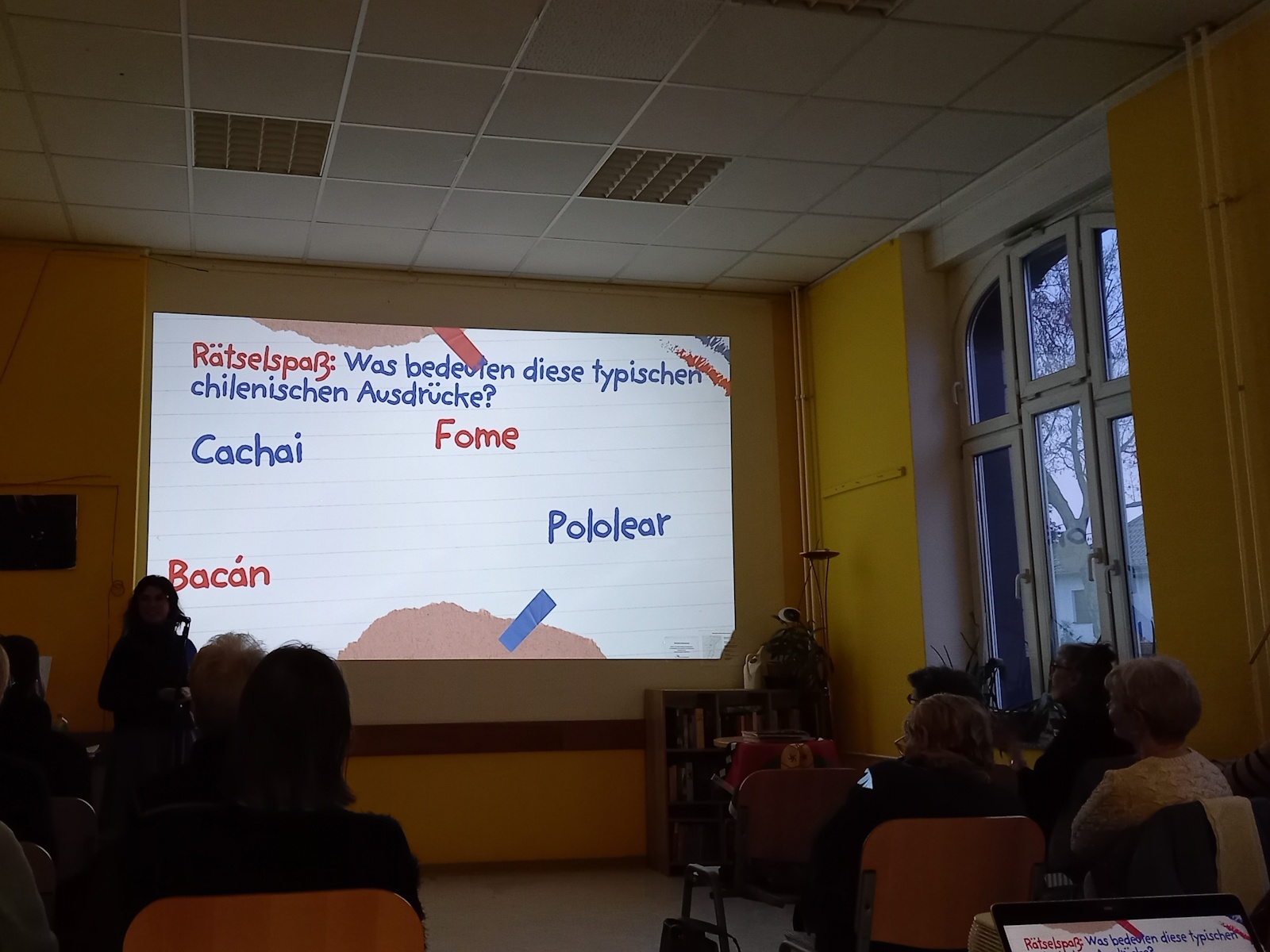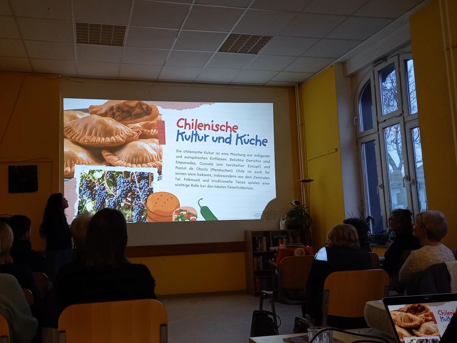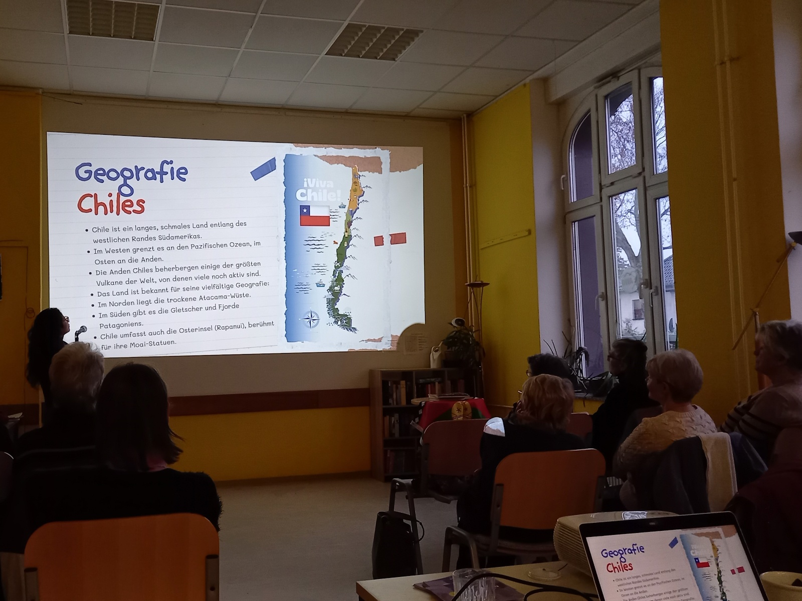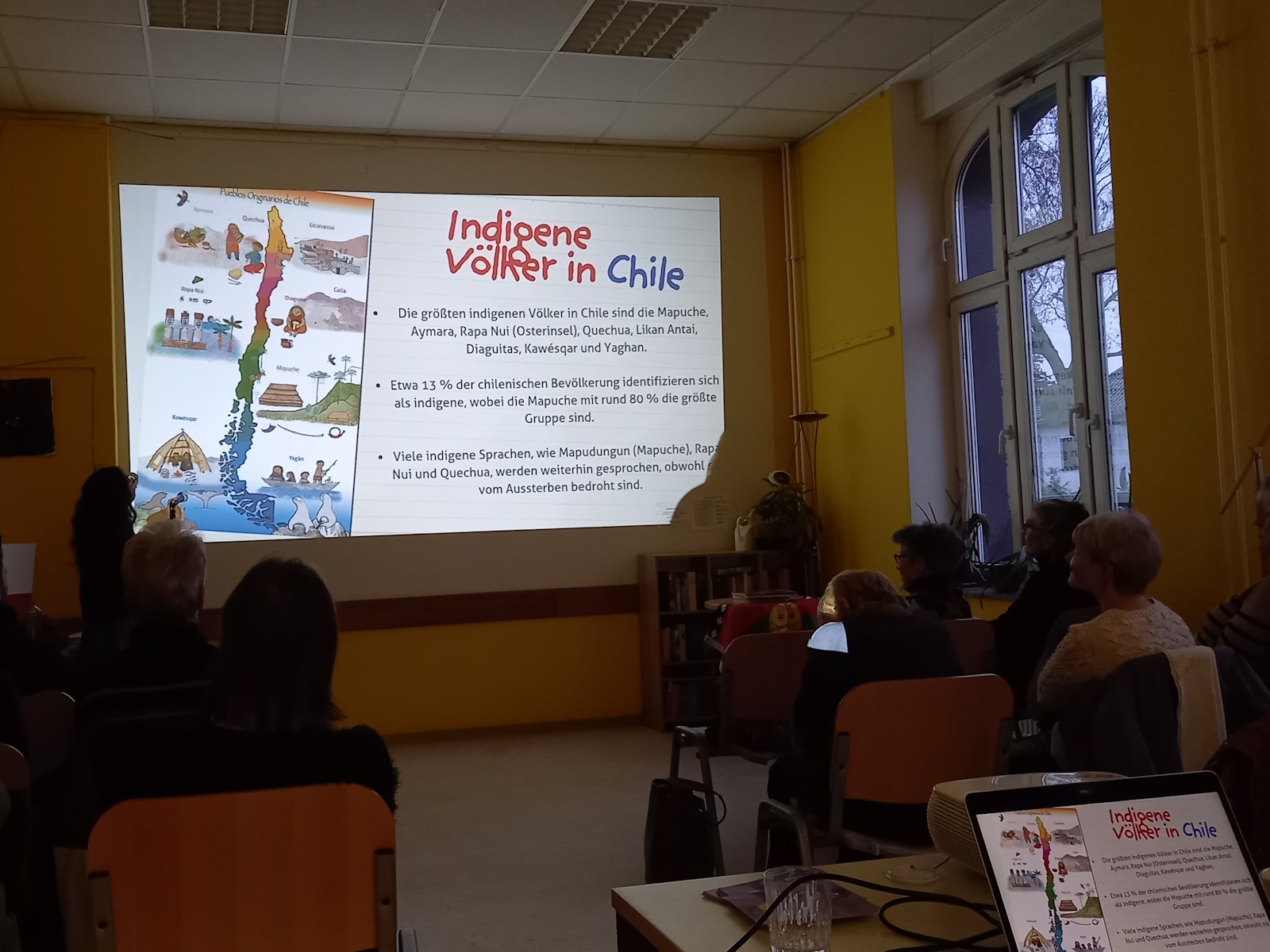 Nach den Begrüßungen durch Dr. Sufian Weise und Natalya Sudnikovic präsentierte Florencia von MaMis en Movimiento e.V. einen Vortrag über Land, Leute und Kultur Chiles.
