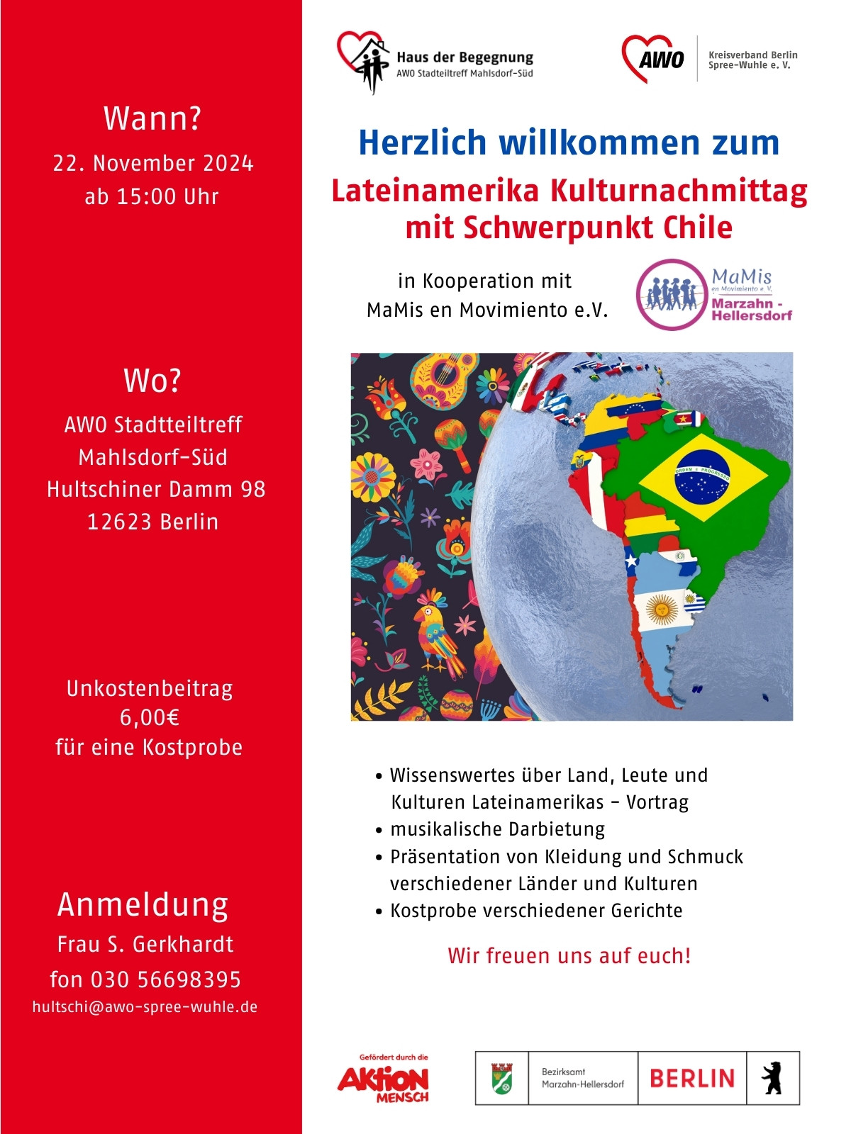 In der beliebten Reihe der Kulturnachmittage im Haus der Begegnung AWO Stadtteiltreff Mahlsdorf-Süd gab es am 22. November viel Wissenswertes über Chile zu erfahren.