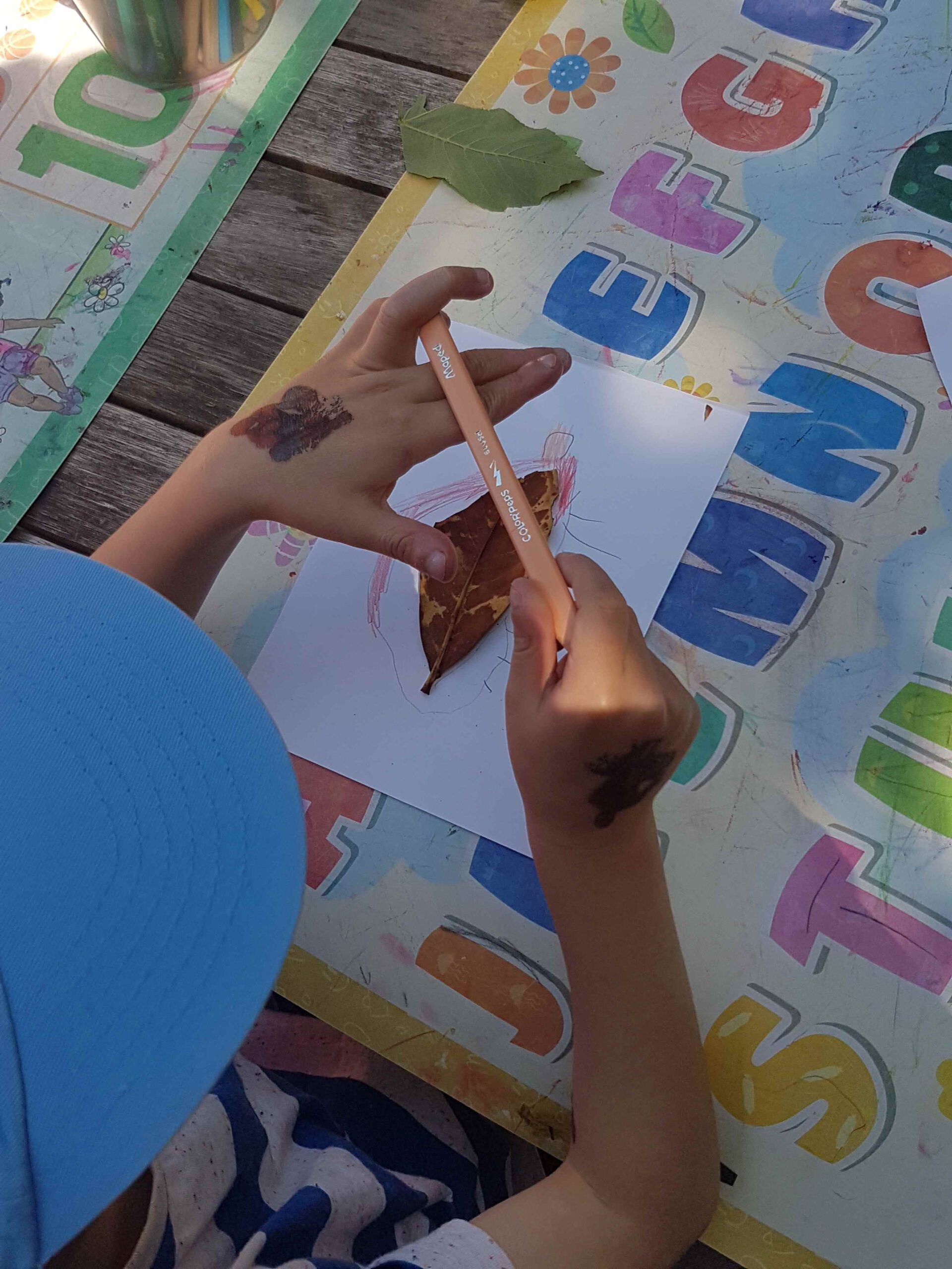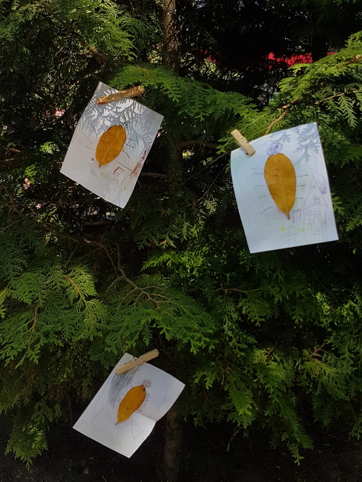 Ein Kind kam auf die Idee, die gefallenen Blätter aus dem Garten zu nutzen und in ein Bild zu integrieren.