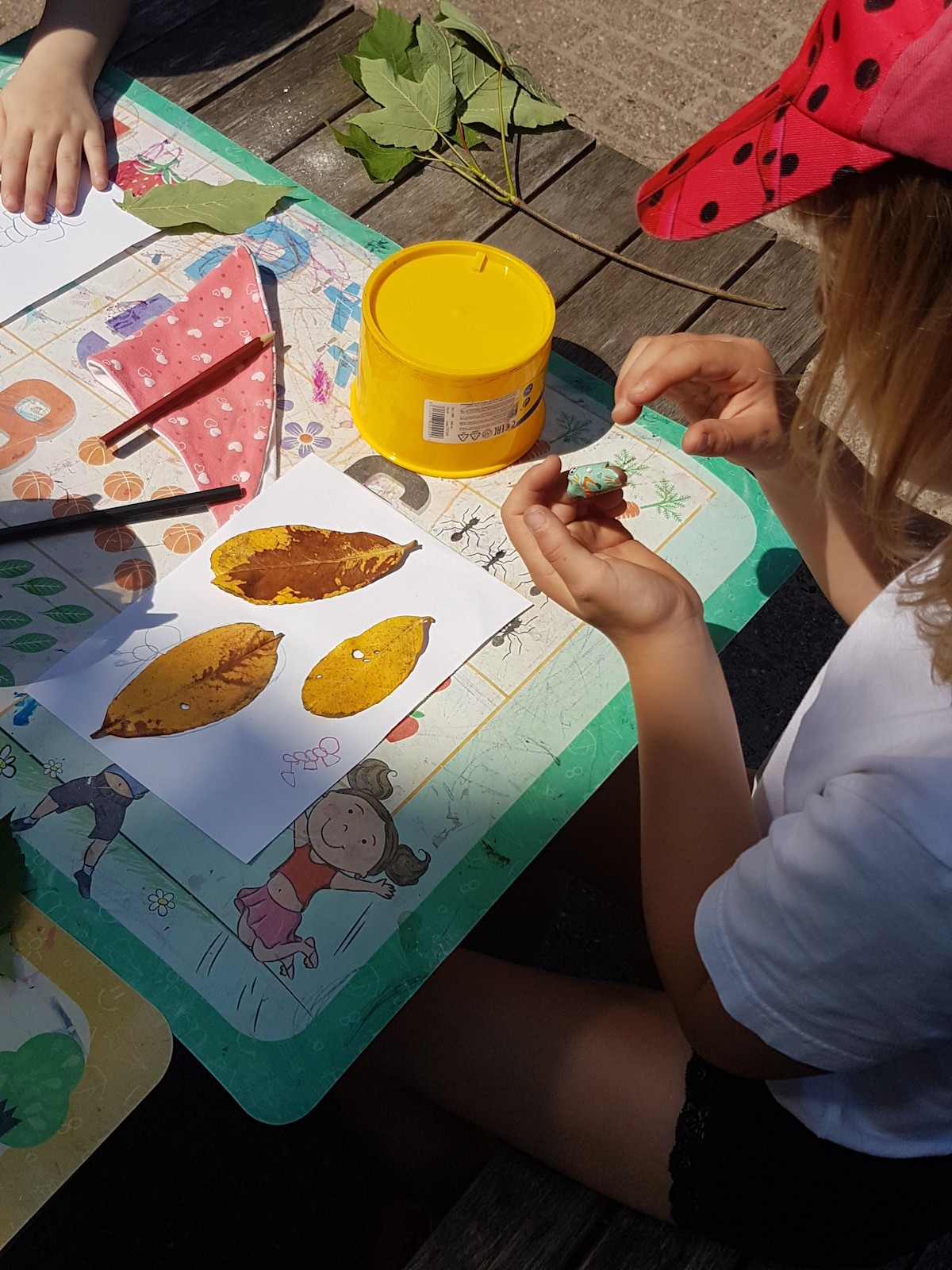 So sind aus Blättern sind kleine bunte Käfer entstanden und dazu wurden noch Häuser und Freunde gemalt.