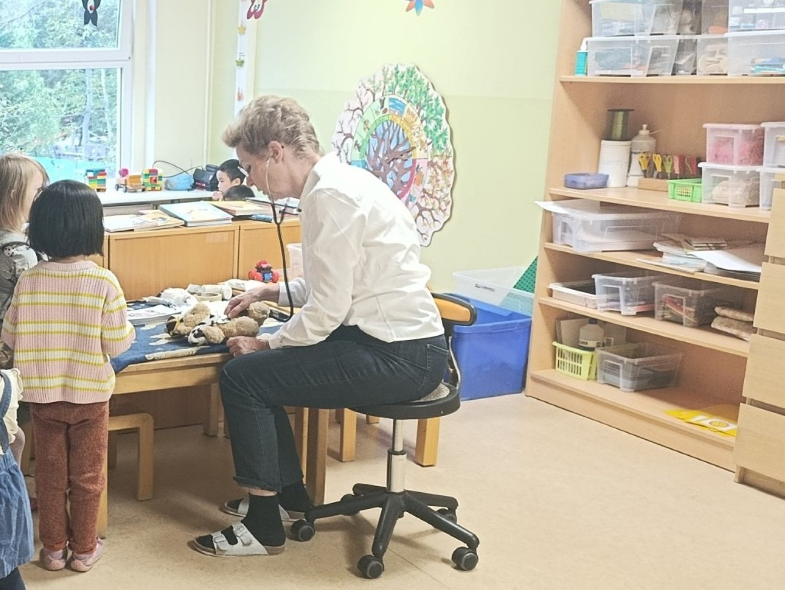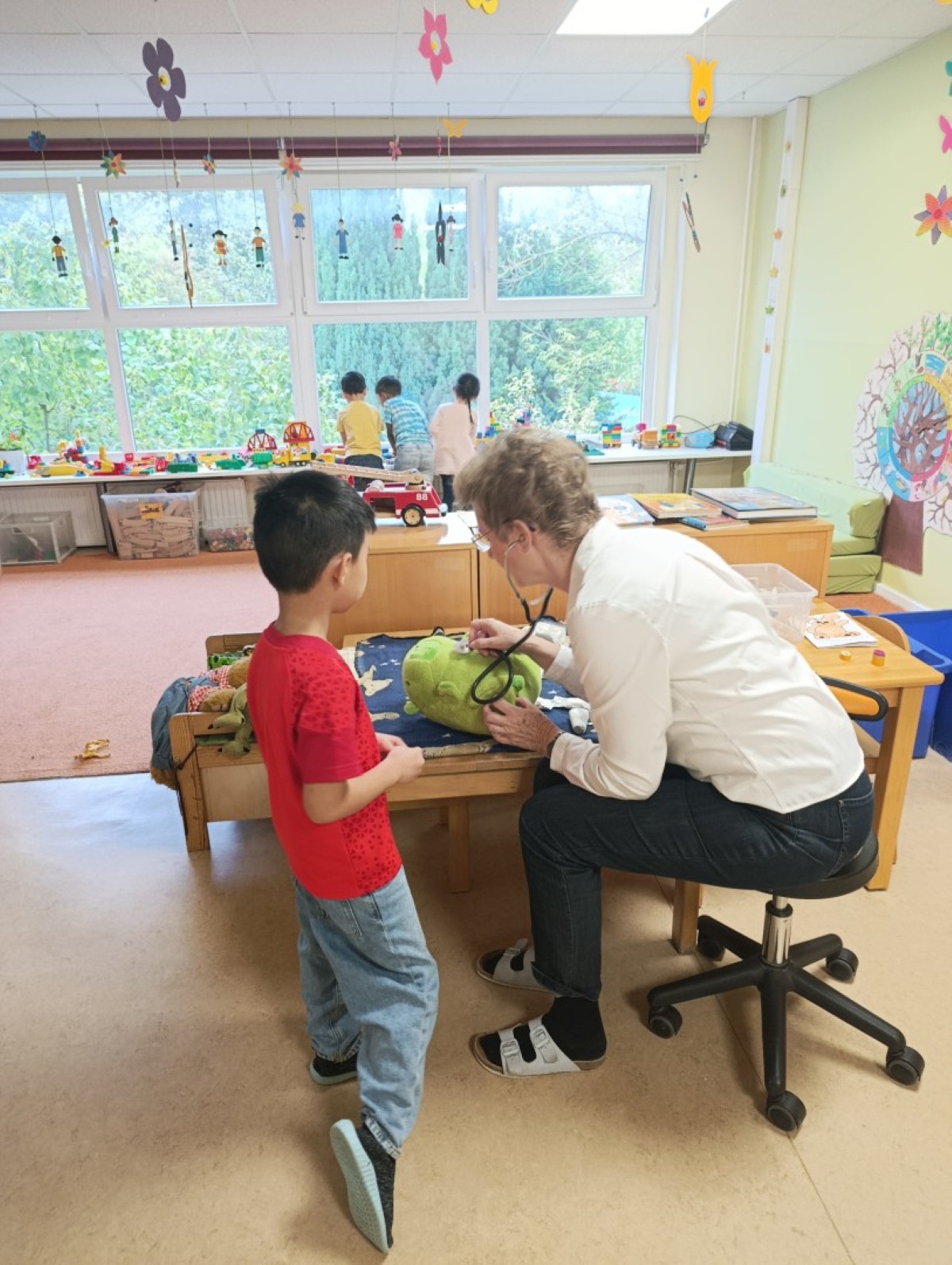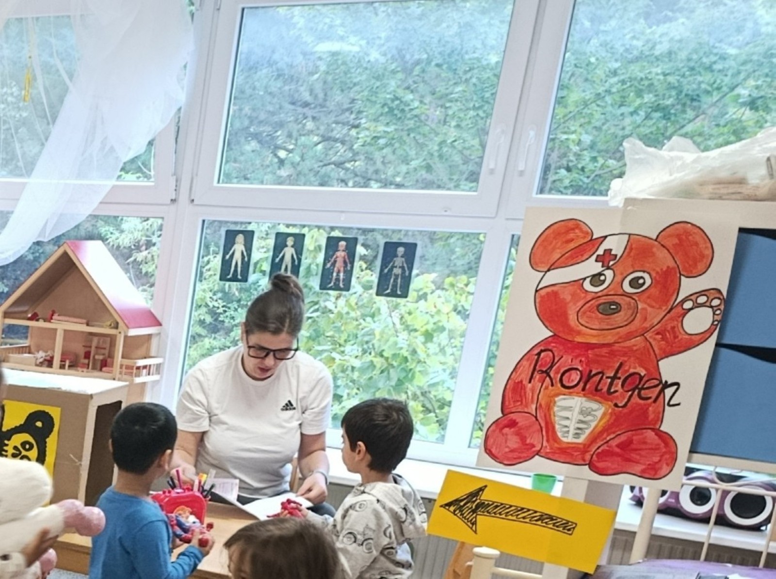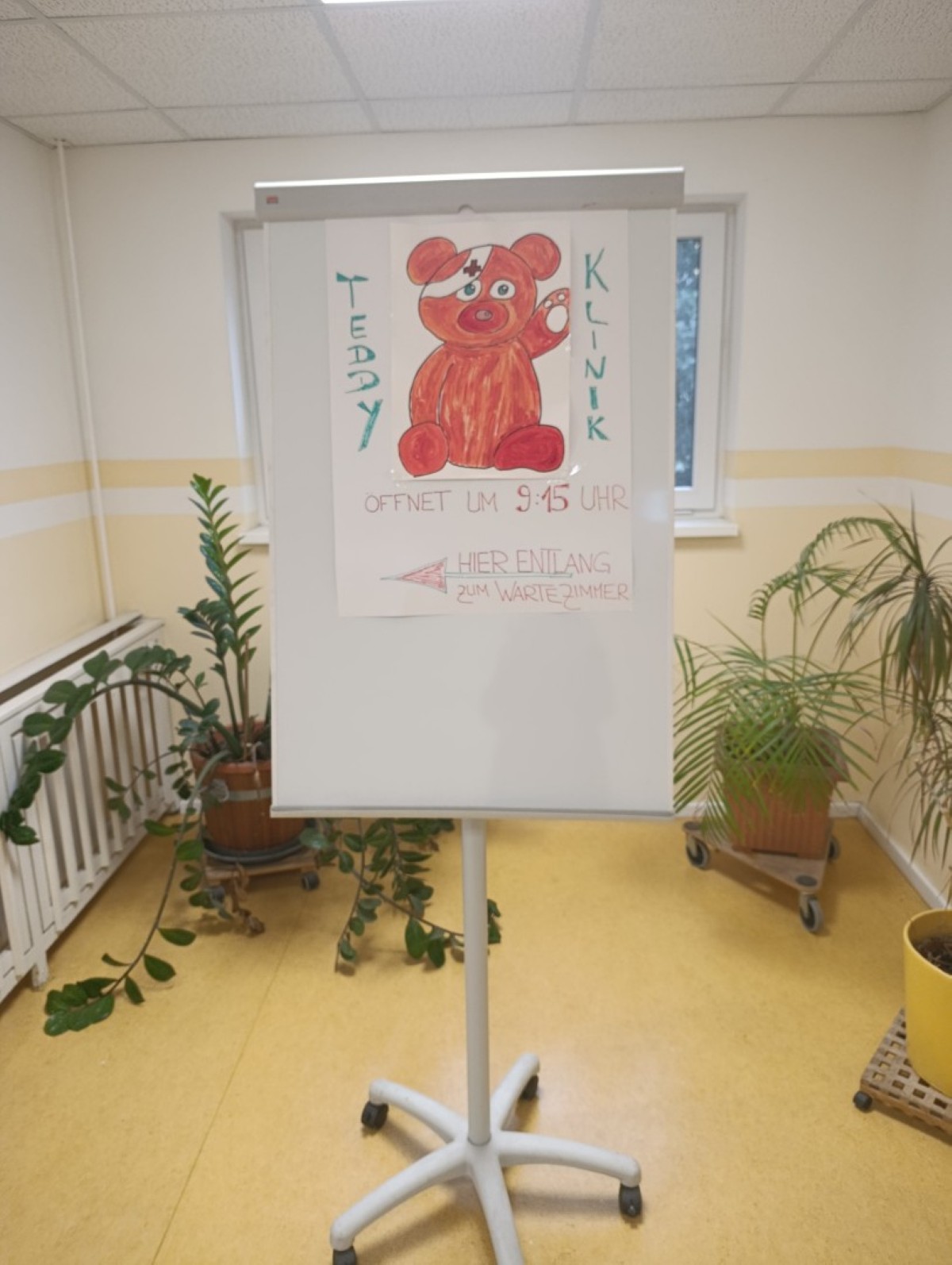 Zum Abschluss öffnete unsere Teddy-Klinik ihre Türen. Kuscheltiere wurden untersucht, gewogen und verarztet – inklusive Rezept für Smarties & Saft aus der „Apotheke“. 🧃🍬