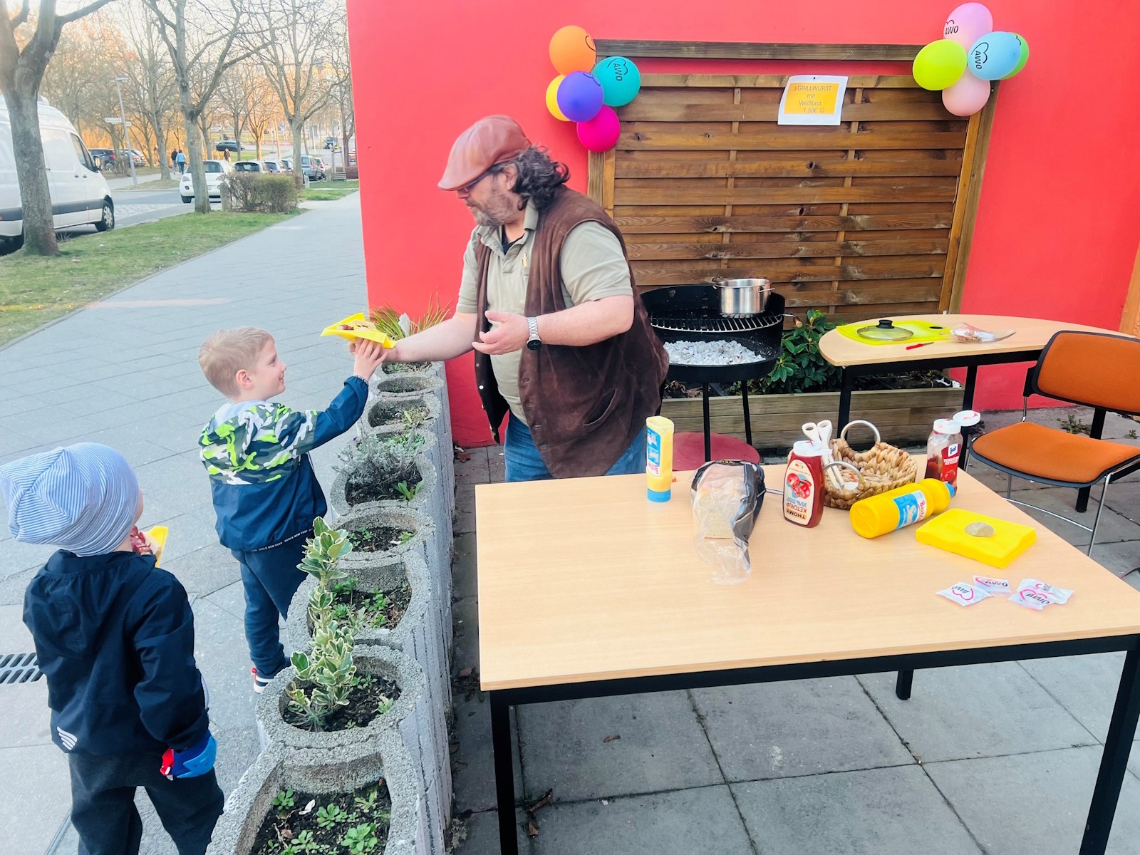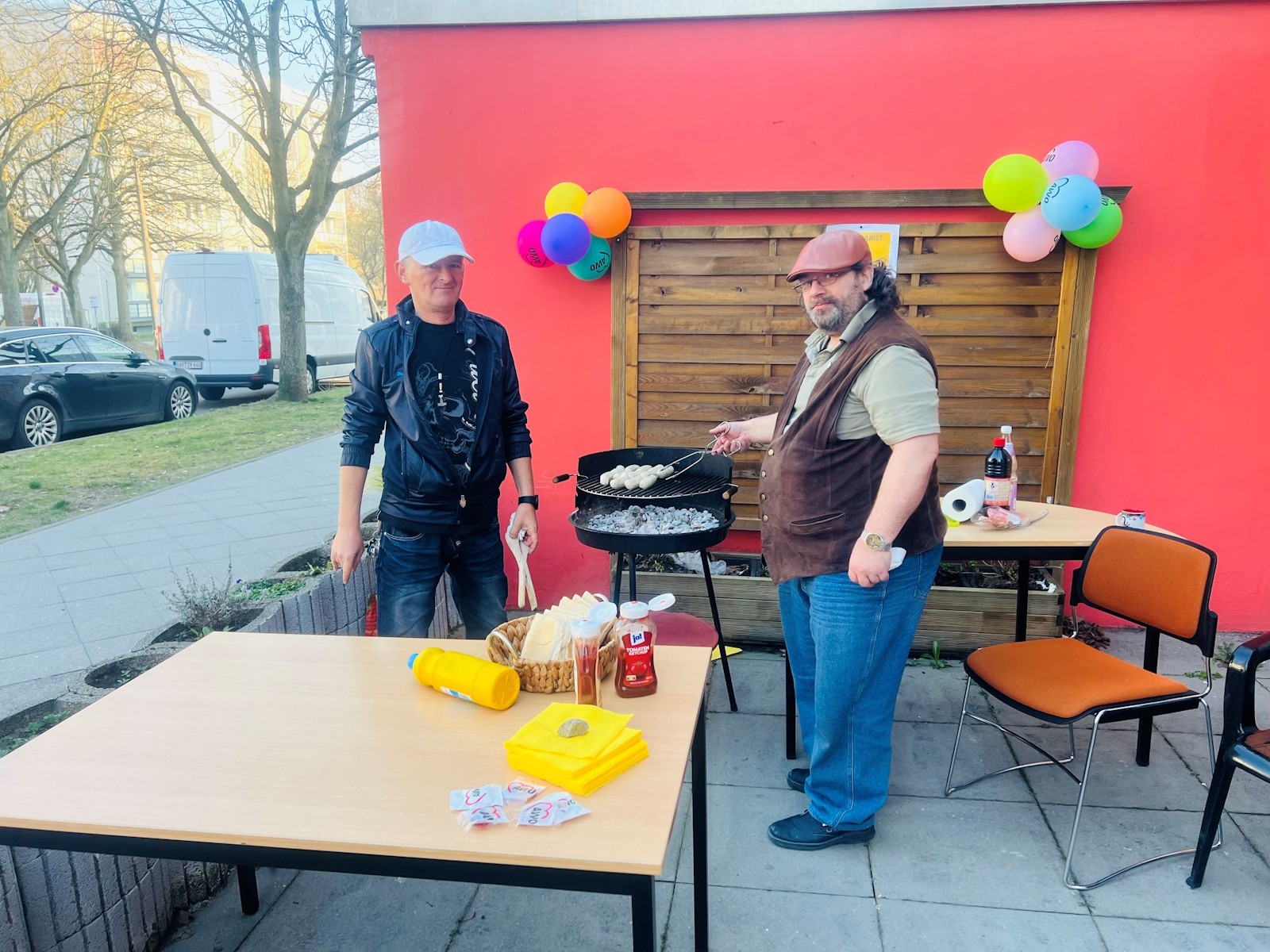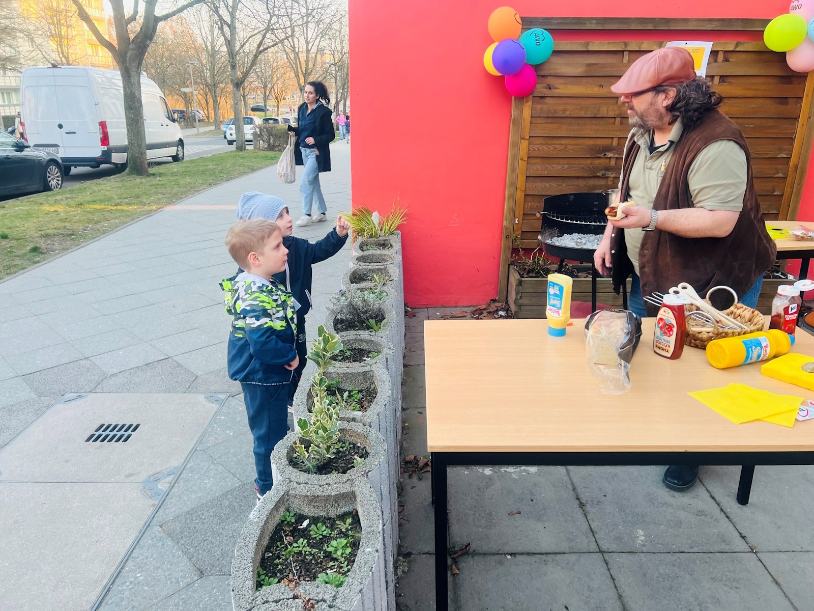 Die Träger der verschiedenen Angebote im Haus an der Kastanienallee boten gemeinsam ein buntes Frühlingsfest für die Nutzer*innen aus dem Kieztreff und für die Nachbarschaft. Es gab Mitmachangebote, wie einem „Baum der Vielfalt“, Bastelangebote, bei denen die Kinderrechte erkundet werden konnten, internationale Kinderspiele und Leseangebote in verschiedenen Sprachen und typische Speisen unterschiedlicher Länder. Der AWO Stadtteiltreff bot in der Arbeitsteilung zwischen den drei Einladenden Trägern etwas fürs leibliche Wohl geben. Die Würste vom Grill waren sehr gefragt.