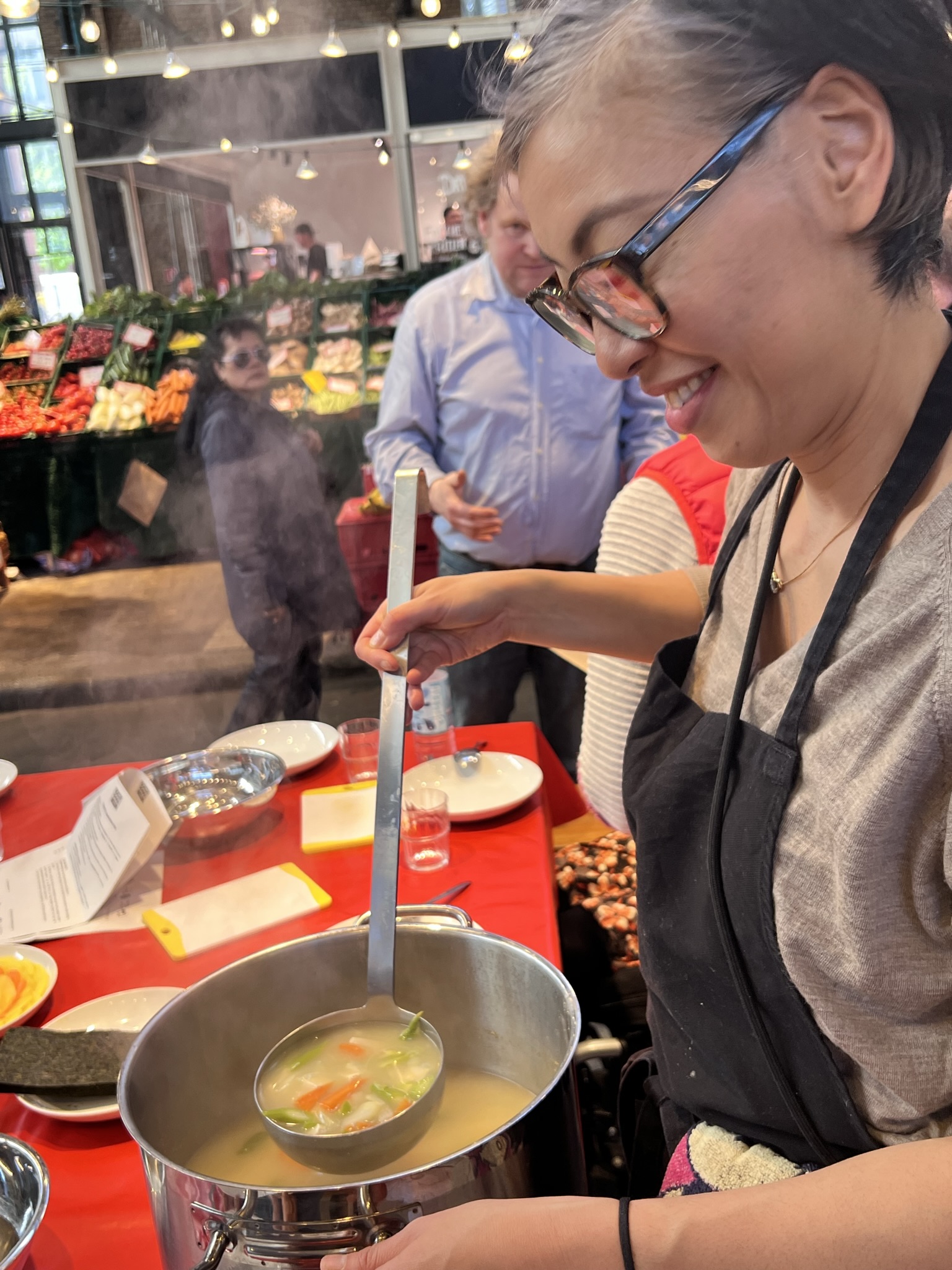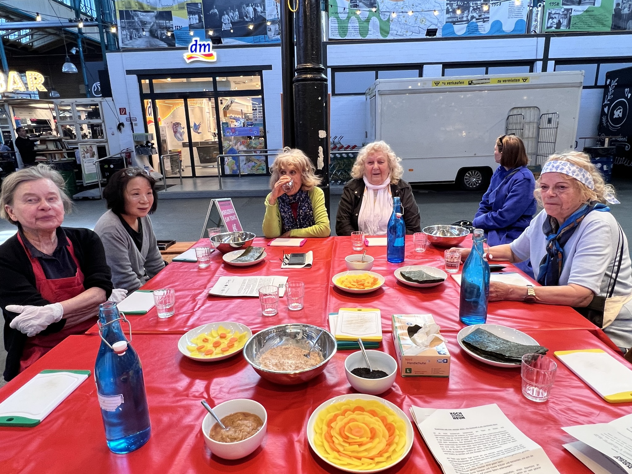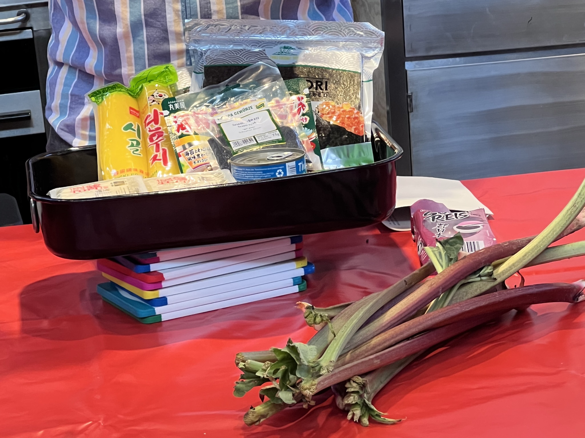 Aber wie immer führte Gemeinsamkeit zum Erfolg und Alle genossen zum Abschluss köstliche Speisen, eine Miso Suppe mit Spargel, Karotten und Tofu und die Reisrollen, gefüllt u.a. mit Thunfischmayonnaise oder salzigem Rhabarbermus.