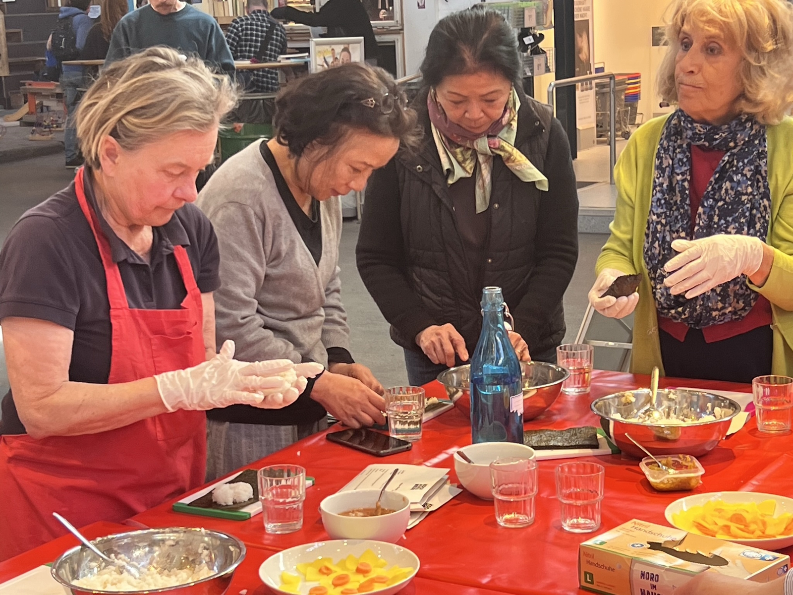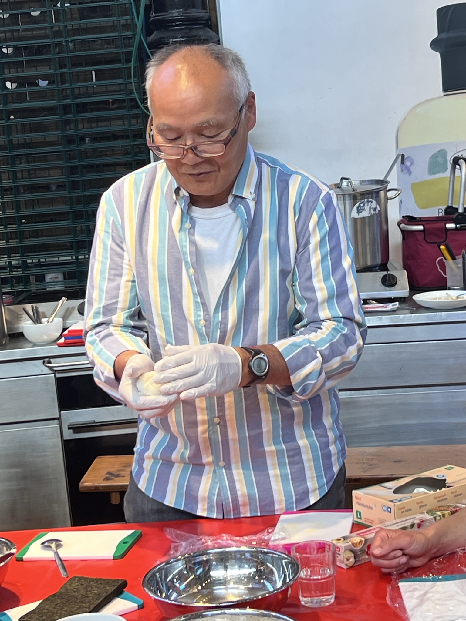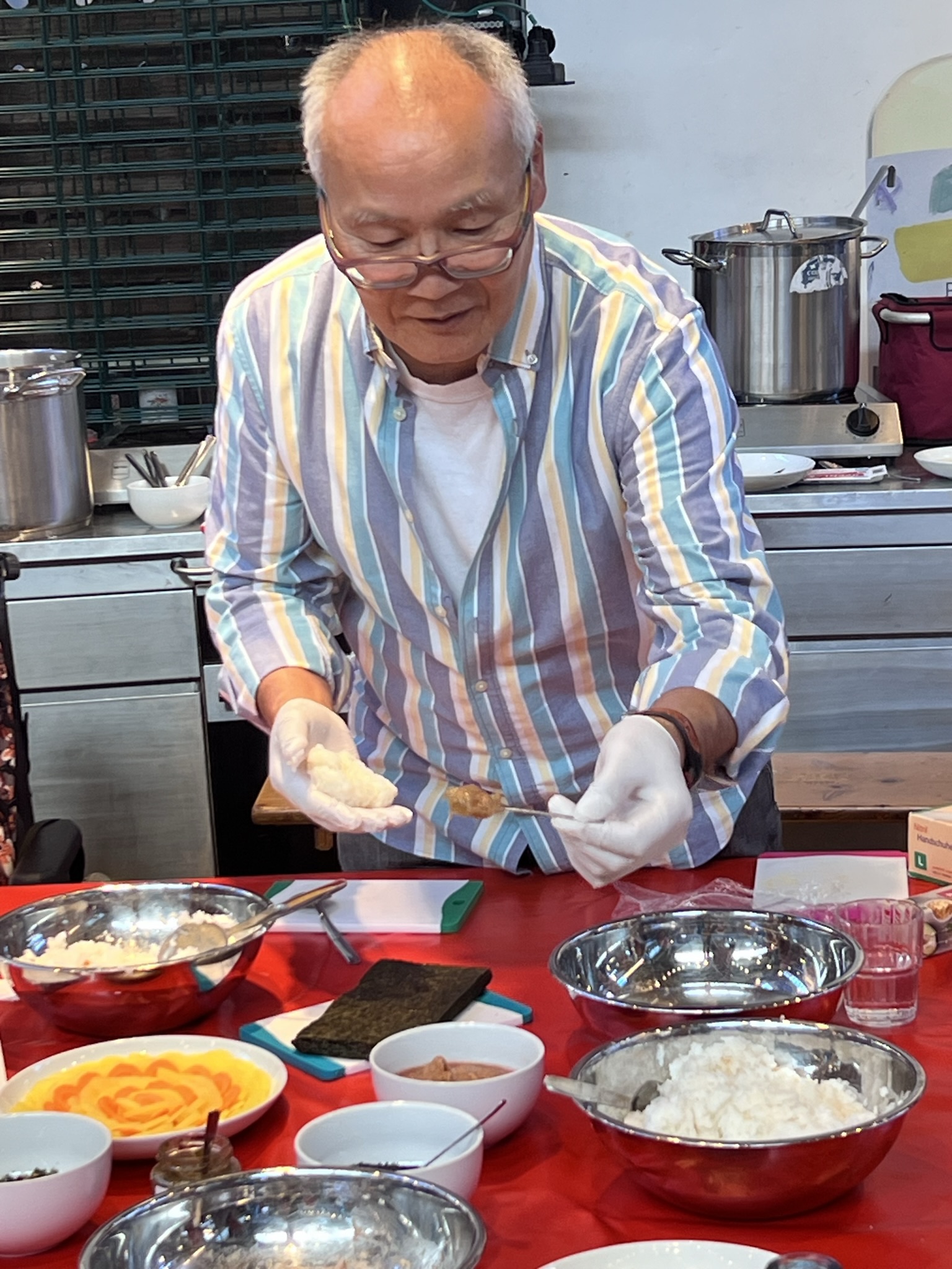 Für das richtige Vorbereiten der Zutaten, fürs Gemüseschnippeln und Mischen der Füllungen für den Reis gab es sachkundige Erklärung und Demonstration. Das Füllen und Formen von Reis geht auch Kochevent erfahrenen Menschen nicht so leicht von der Hand.