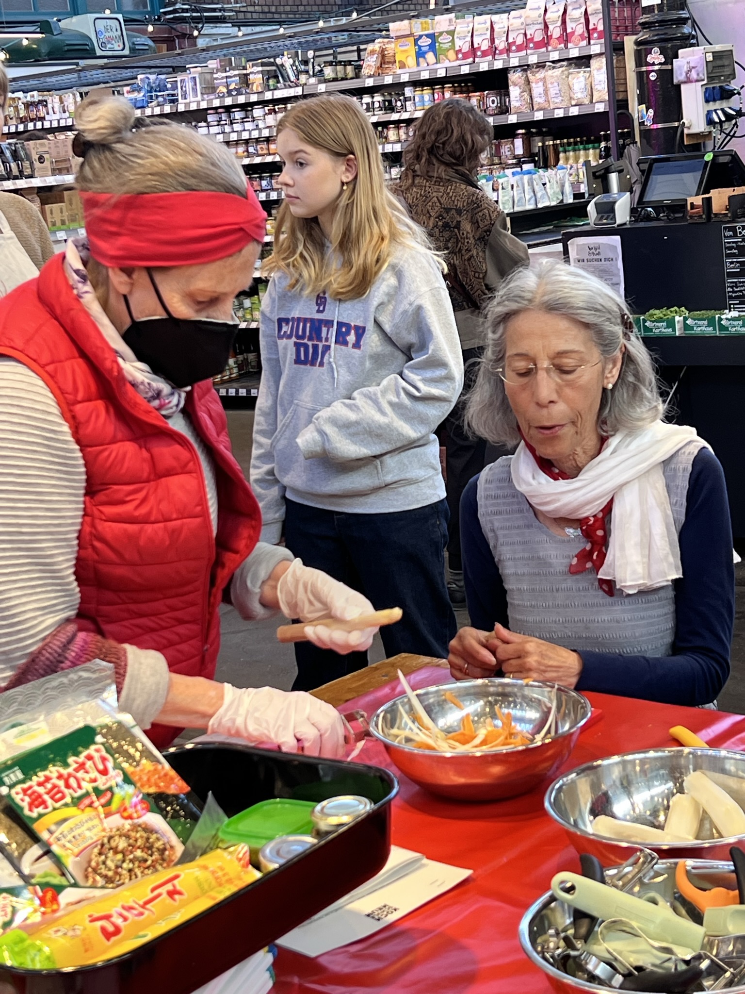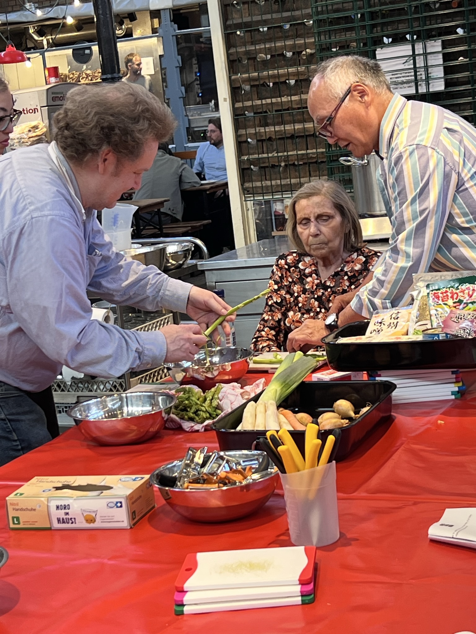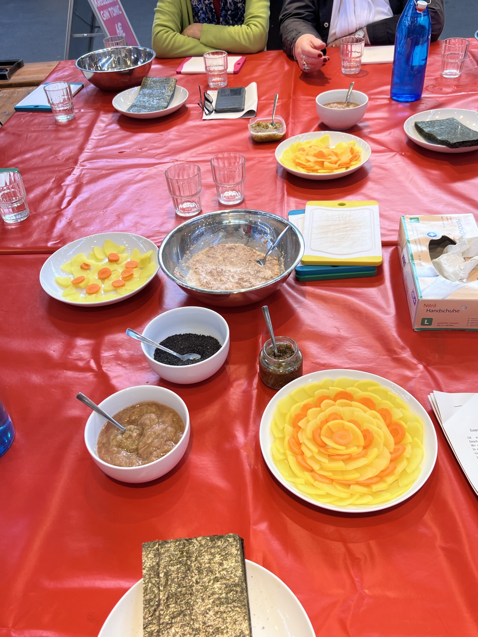 Für das richtige Vorbereiten der Zutaten, fürs Gemüseschnippeln und Mischen der Füllungen für den Reis gab es sachkundige Erklärung und Demonstration. Das Füllen und Formen von Reis geht auch Kochevent erfahrenen Menschen nicht so leicht von der Hand.