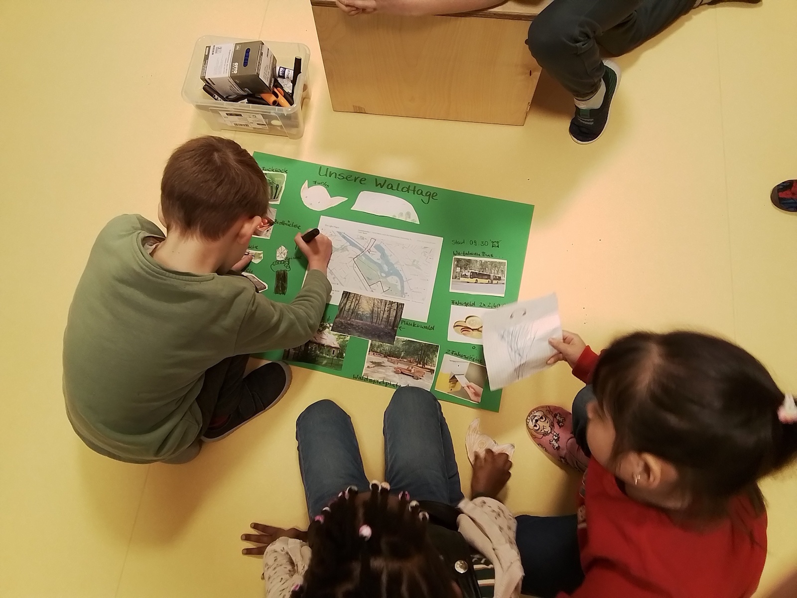Ganz im Sinne der Partizipation wurden die Kinder von Anfang an einbezogen: Gemeinsam wurde besprochen, was im Wald wichtig ist und was auf einem Ausflug gebraucht wird. Dabei entstand ein anschauliches Waldplakat.
