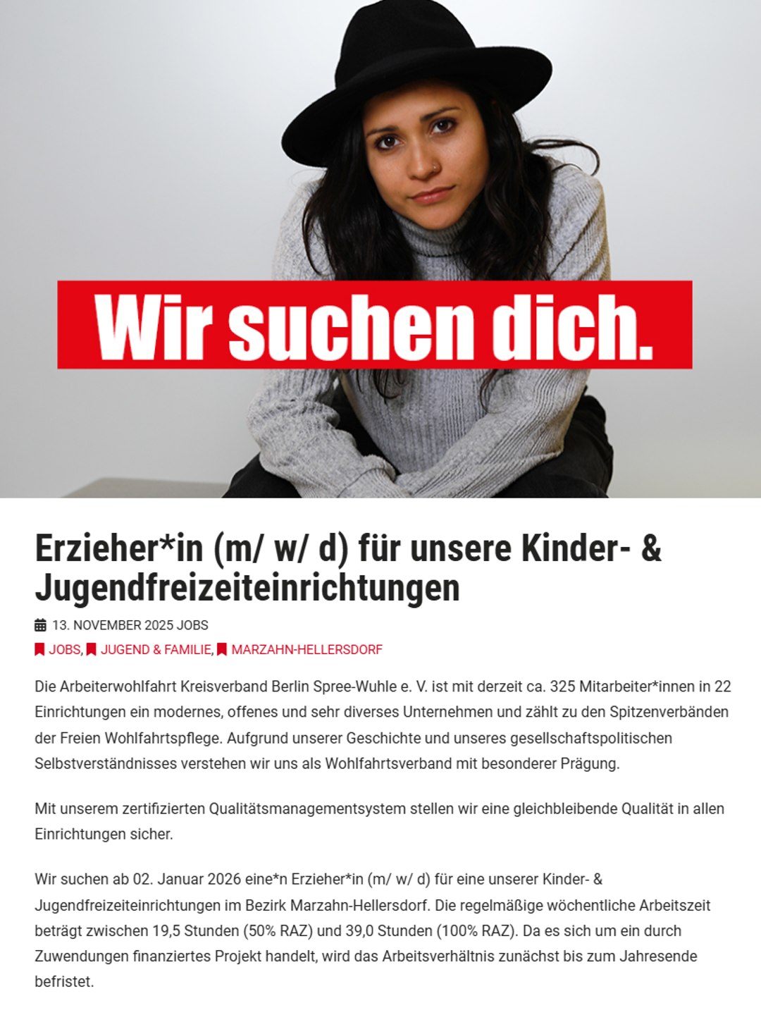 - zwei Kolleg*innen haben unser Team verlassen, wir sind auf der Suche nach Verstärkung für unser Team, siehe Ausschreibung Erzieher*in (m/ w/ d) für unsere Kinder- & Jugendfreizeiteinrichtungen – AWO Stellenangebote
