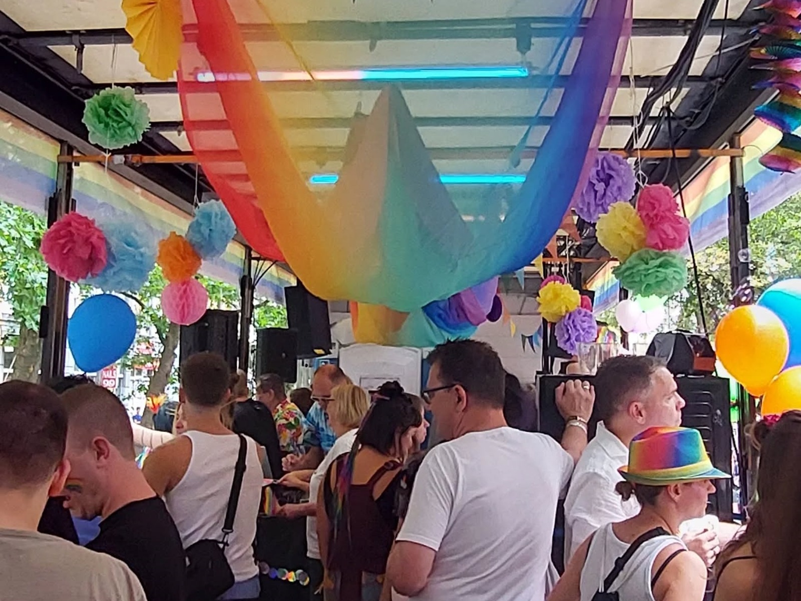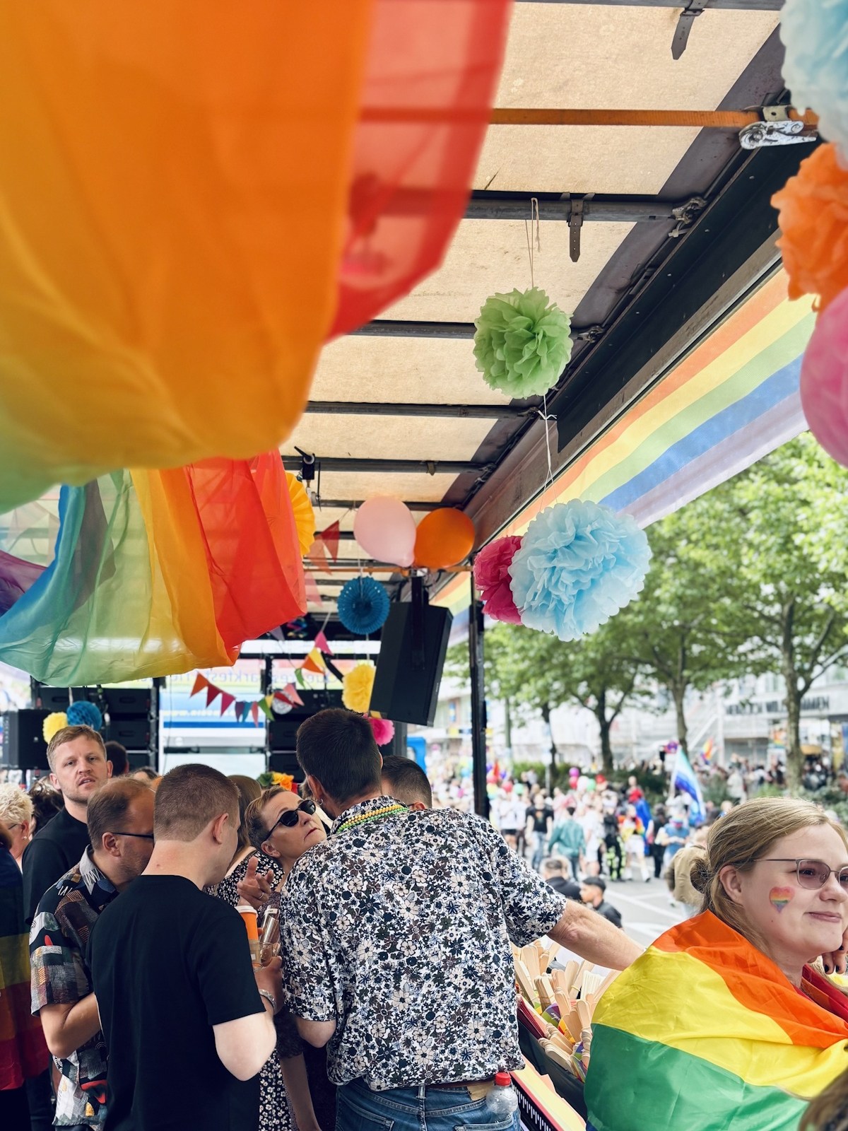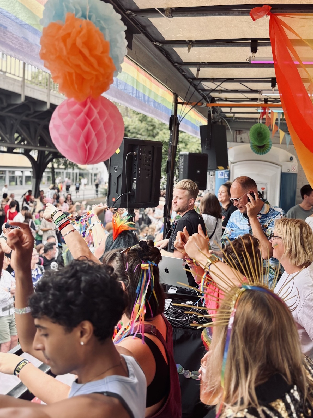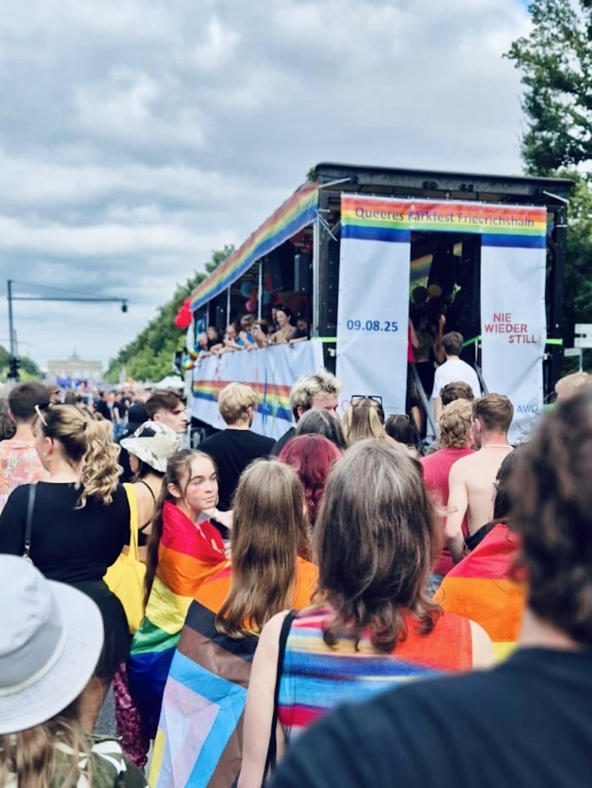 Mit unterwegs auf dem Truck war auch die Orgagruppe des Queeren Parkfests Friedrichshain und warb für das nächste Queere Parkfest Friedrichshain am 09. August im Freiluftkino Friedrichshain. Dann sind alle wie immer eingeladen zum alljährlichen Abschluss des Pride Month in Berlin.