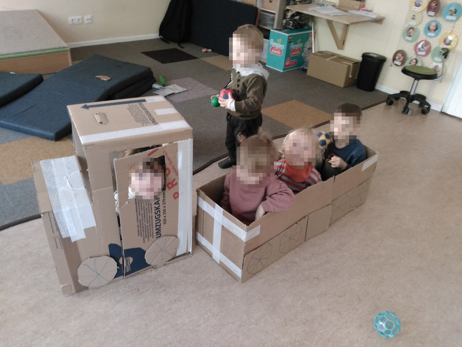 Oder das Interesse der Kinder an Autos und Kartons führt zum Bau eines Autos, das zum aktiven Spielgerät wird. Das Kind wird zum selbstwirksamen Akteur und Teil seiner eigenen Spielwelt.