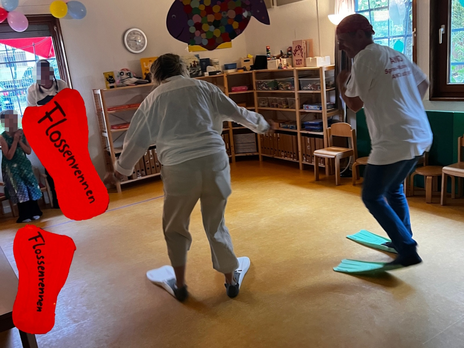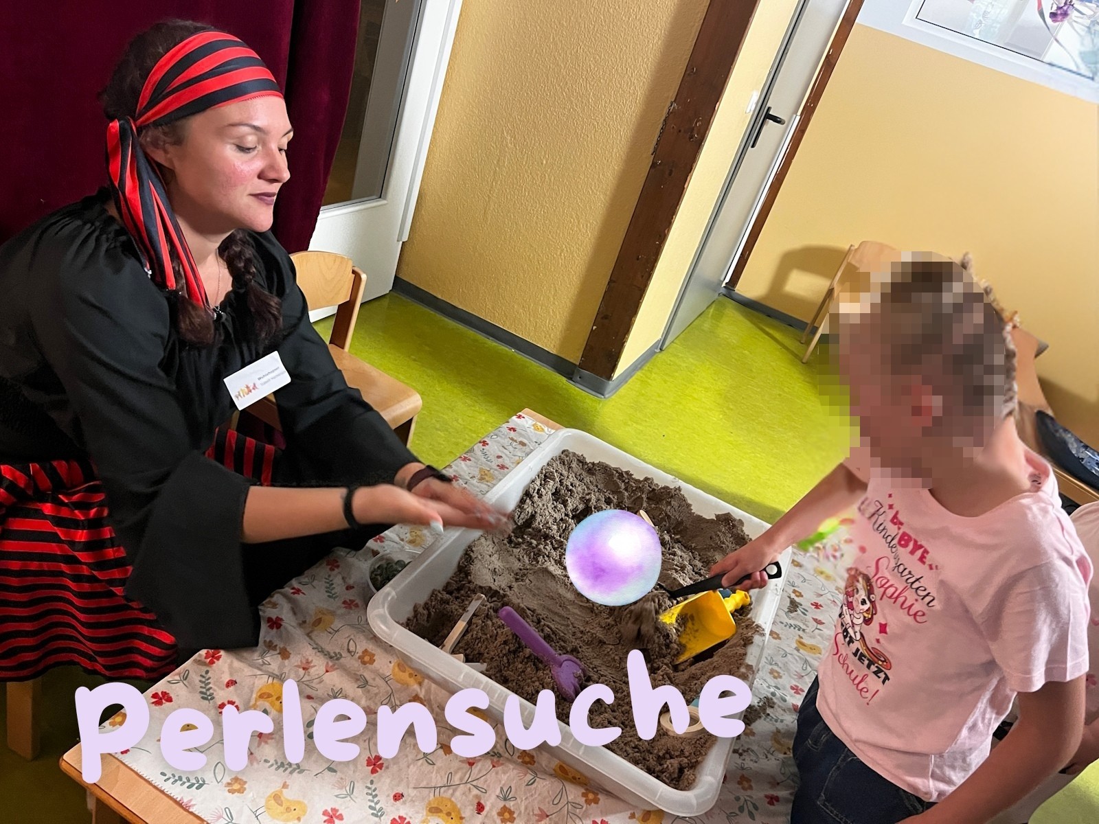 Das bestvorbereitete Sommerfest kann nichts daran ändern, wenn das Wetter nicht mitspielen will und Regenwolken schickt. Aber ein perfekt bestvorbereitetes Sommerfest hat einen Plan B. Das Sommerfest für Piraten und Meerjungfrauen zog kurzerhand unter das schützende Dach des Hauses. Und all die bunten Angebote füllten die Räume des Hauses mit quirligem Leben. Alle hatten viel Spaß – bei der Perlensuche, der Mutprobe für Piraten, beim Piratenbootrennen, beim Flossenrennen, bei Bastelangeboten oder auch bei einer zünftigen Eiswürfelschlacht.