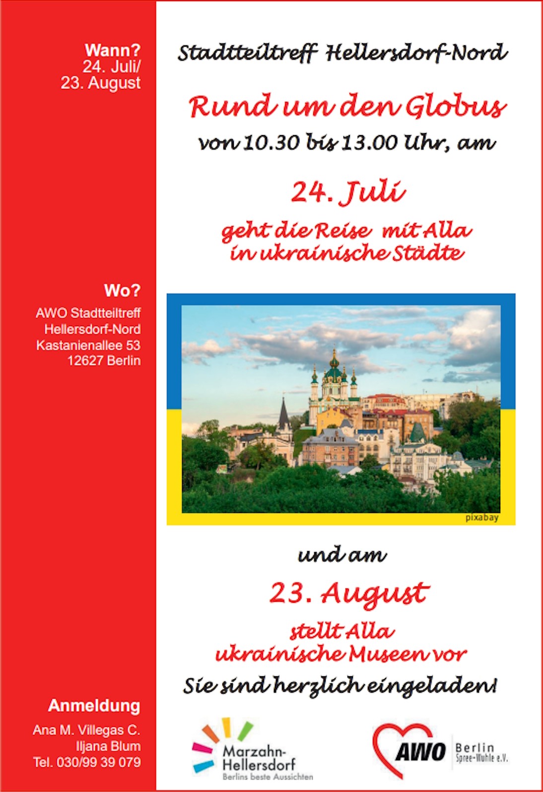 Während am 12. Juli die Vortragsreise mit Alla noch in andalusische Städte ging, nahm er seine Zuhörer*innen am 24. Juli mit auf eine Reise in die Ukraine. Es gab viel Wissenswertes und Interessantes zu alten Städten, ihrer Geschichte, Kultur und natürlich auch Kulinarik dieses großen Landes. Die Reise in die Ukraine wird am 23. August um 10.30 Uhr fortgesetzt. Dann führt sie in ukrainische Museen.